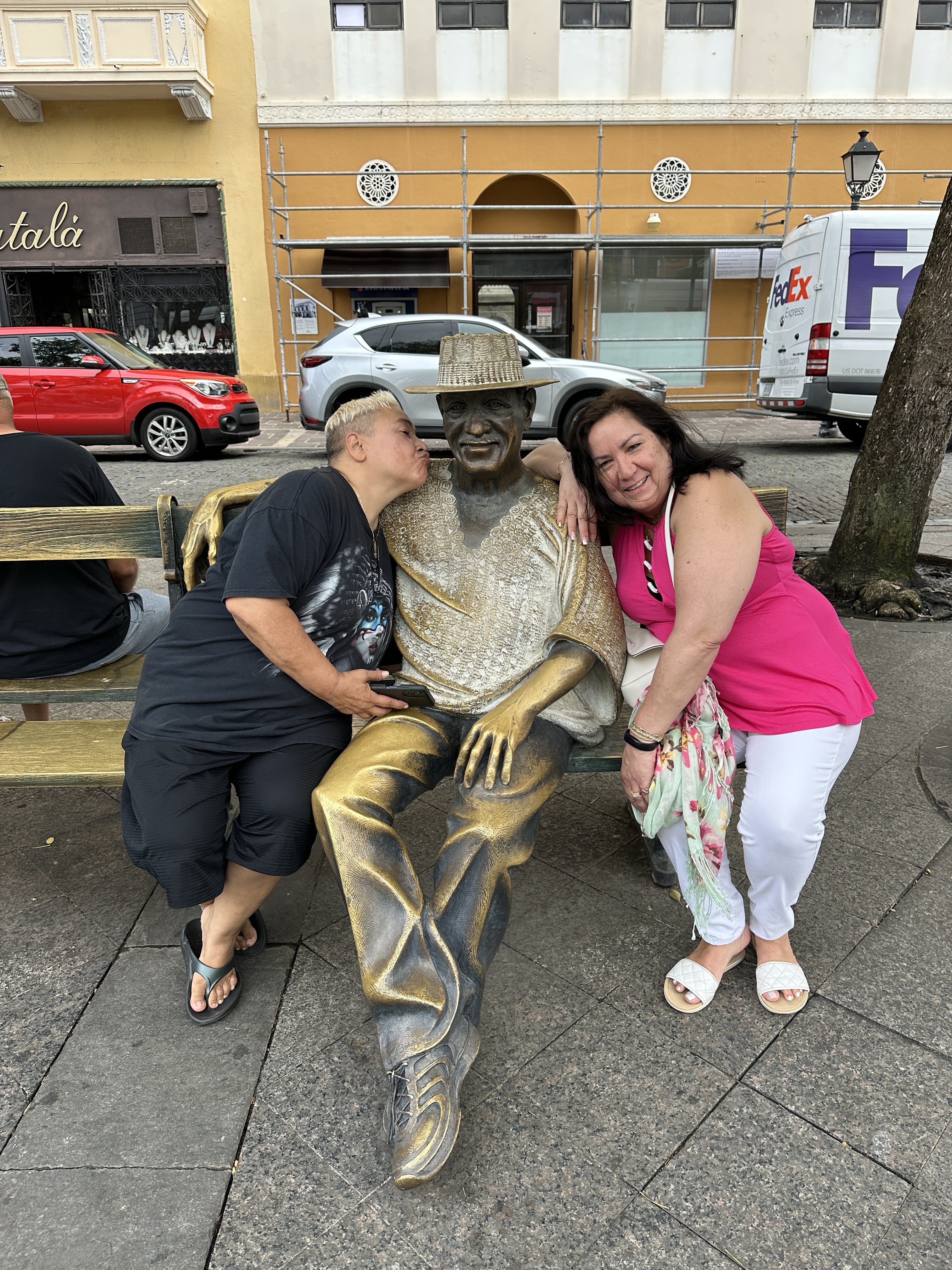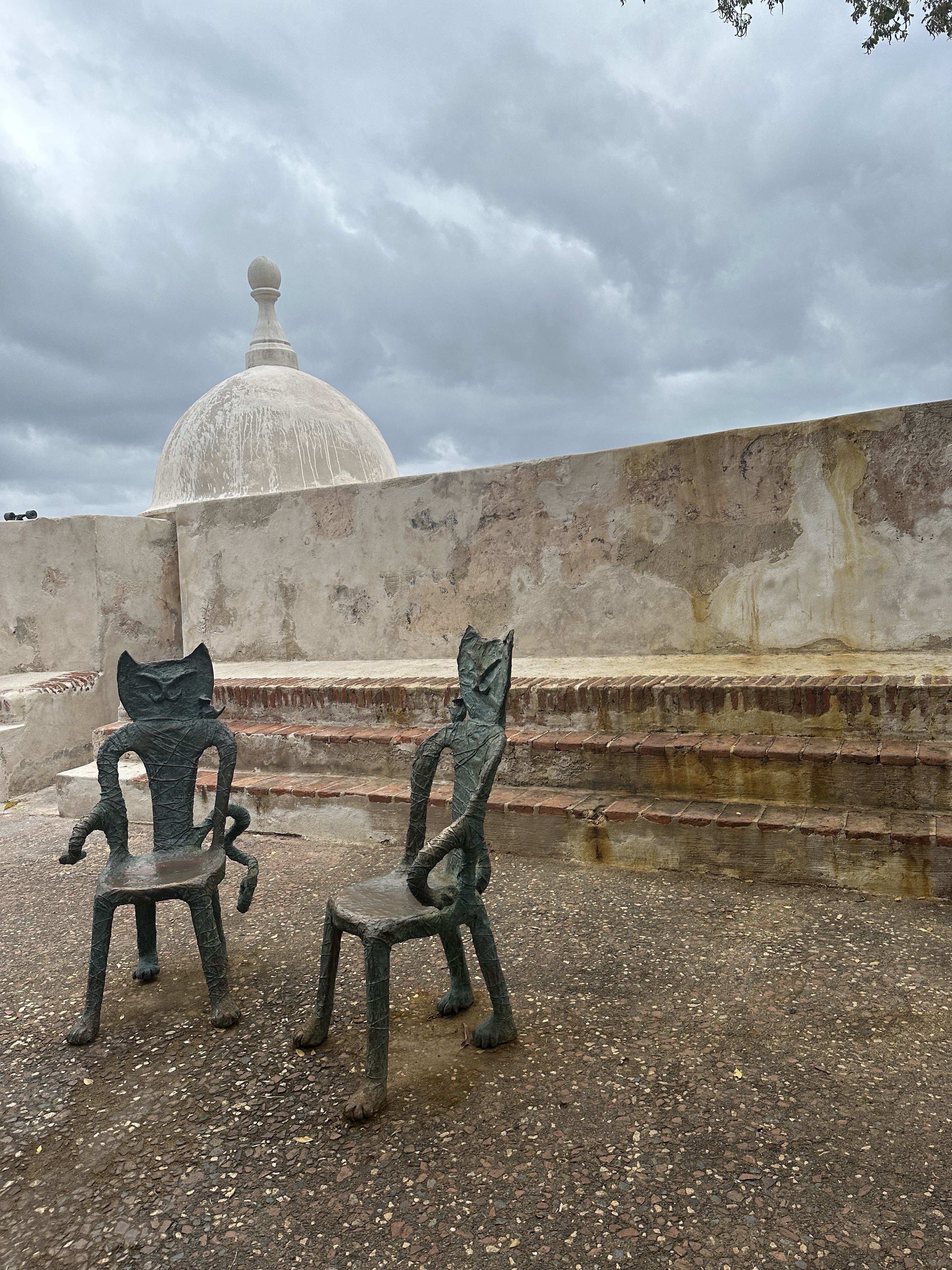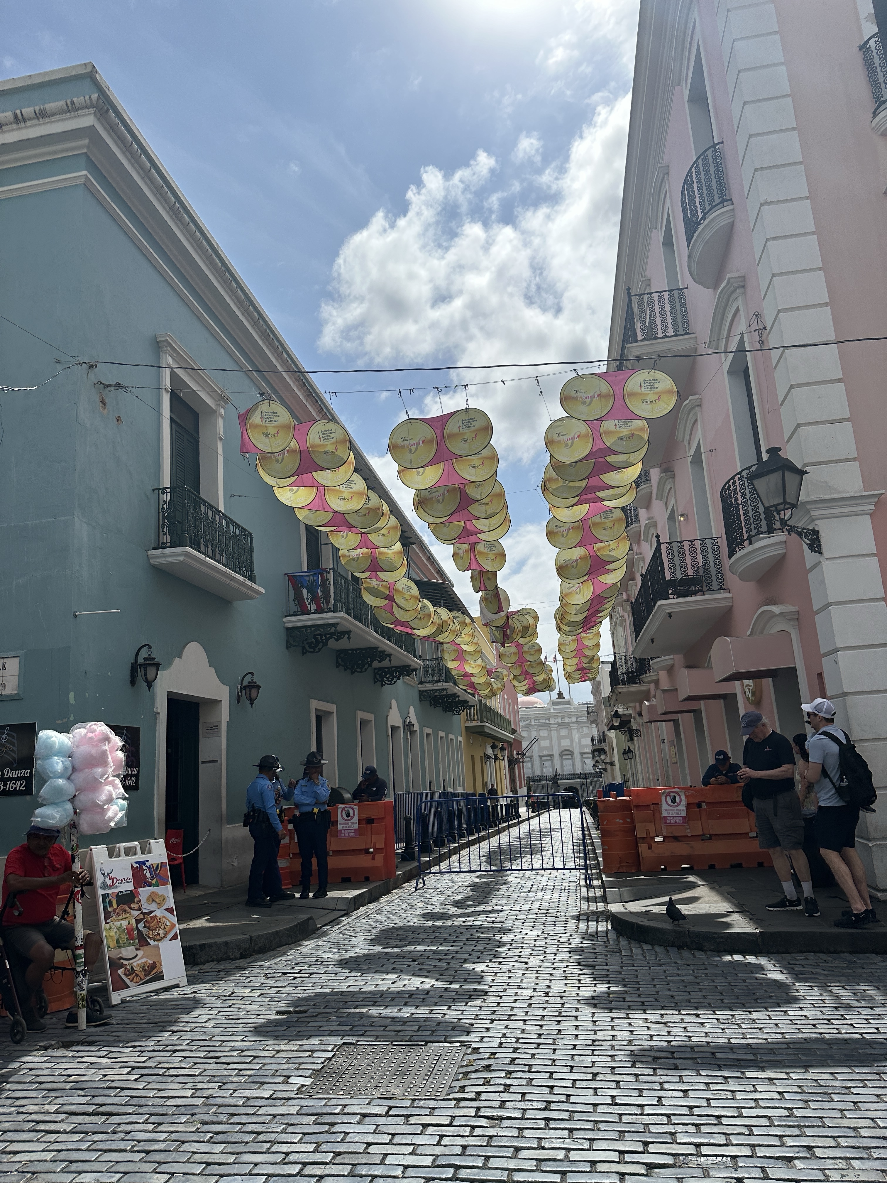 After lunch we walked around Old San Juan. I wanted to see the famous umbrella street (Los Paraguas de la Fortaleza) but to my disappointment the umbrellas were gone and replaced with odd looking American cancer signs. I was so upset & can’t believe I’ve still seen influencers posting about this umbrella street when it hasn’t been there for a few years apparently?? Next we stopped at Parque de las Palomas (pigeon park) where you can enter and feed the pigeons. That was not for me but Iris went inside and enjoyed feeding the birds.