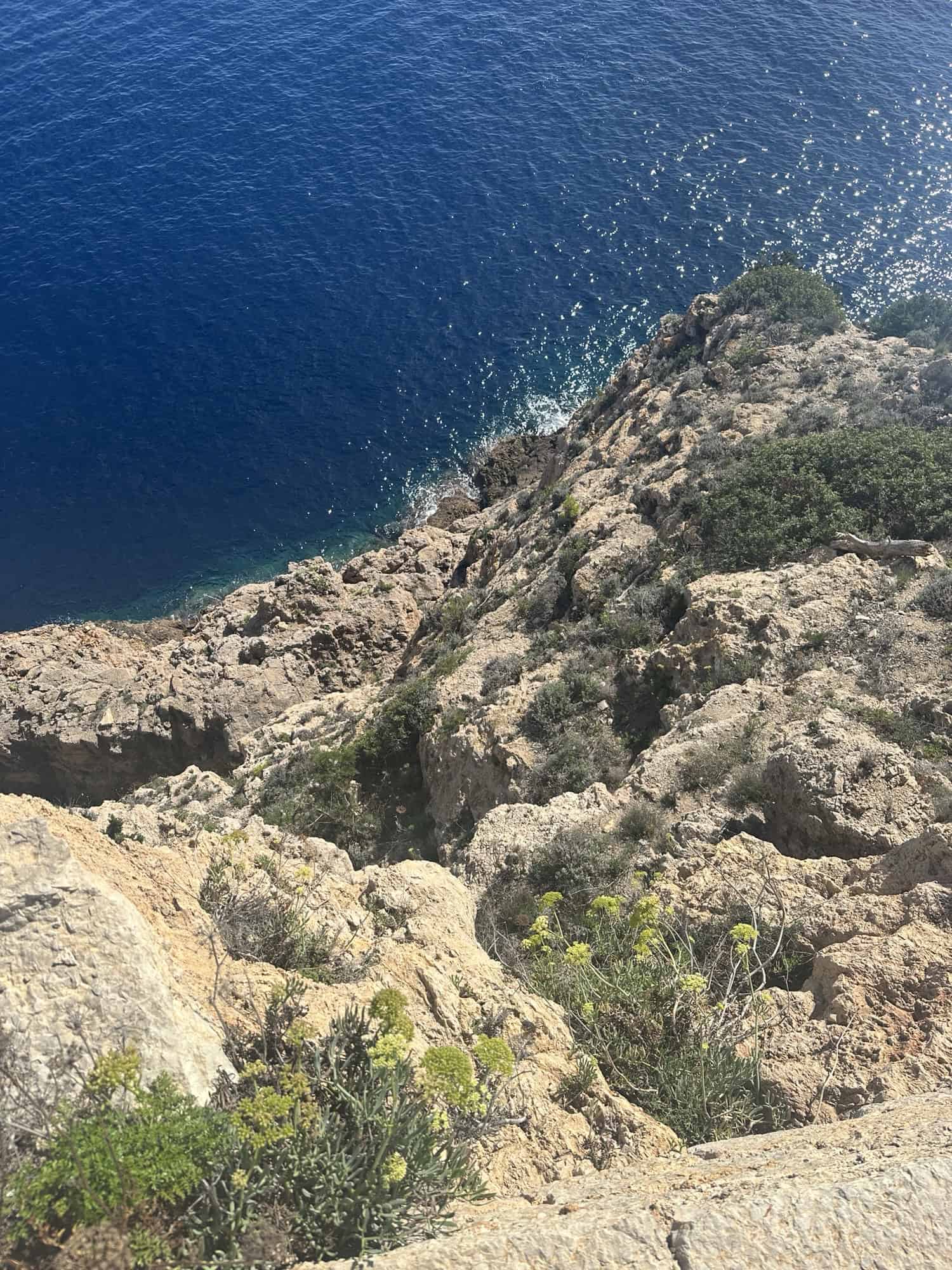 Once we reached the top there were steps to go down which brings you cliffside to start what I considered the cool and fun part of the hike. There was a rocky pathway to follow but no actual trail markers. Some parts were very narrow, and there were a few rock scrambles that we had to climb over, but the most dangerous part was walking sideways and grabbing rock hand holds to safely get to the other side. As long as you like adventure and go slow it is totally doable, but if you’re afraid of heights or falling, do not try and do this trail. There was also a random cross placed high in one of the cliffs – I wonder who put that there or how long it’s been there. Scaling the cliffs and climbing the rocks were my favorite part and the views the whole way were incredible. At one point a boat passed by below, the people shouted and waved up to us probably wondering how we got up there. I kept saying to Stelios “see aren’t you happy we extended?” We would’ve never experienced this if we hadn’t!