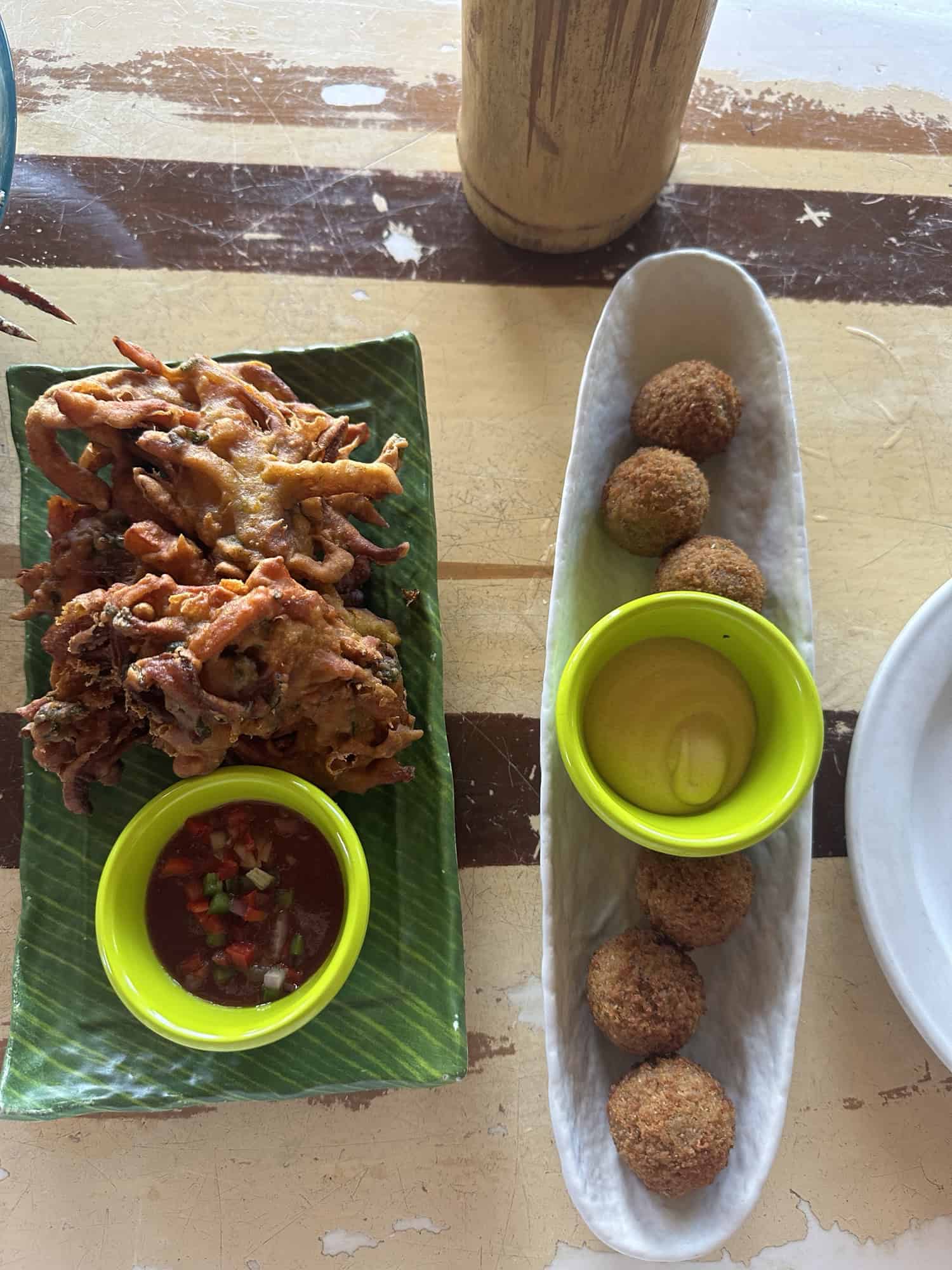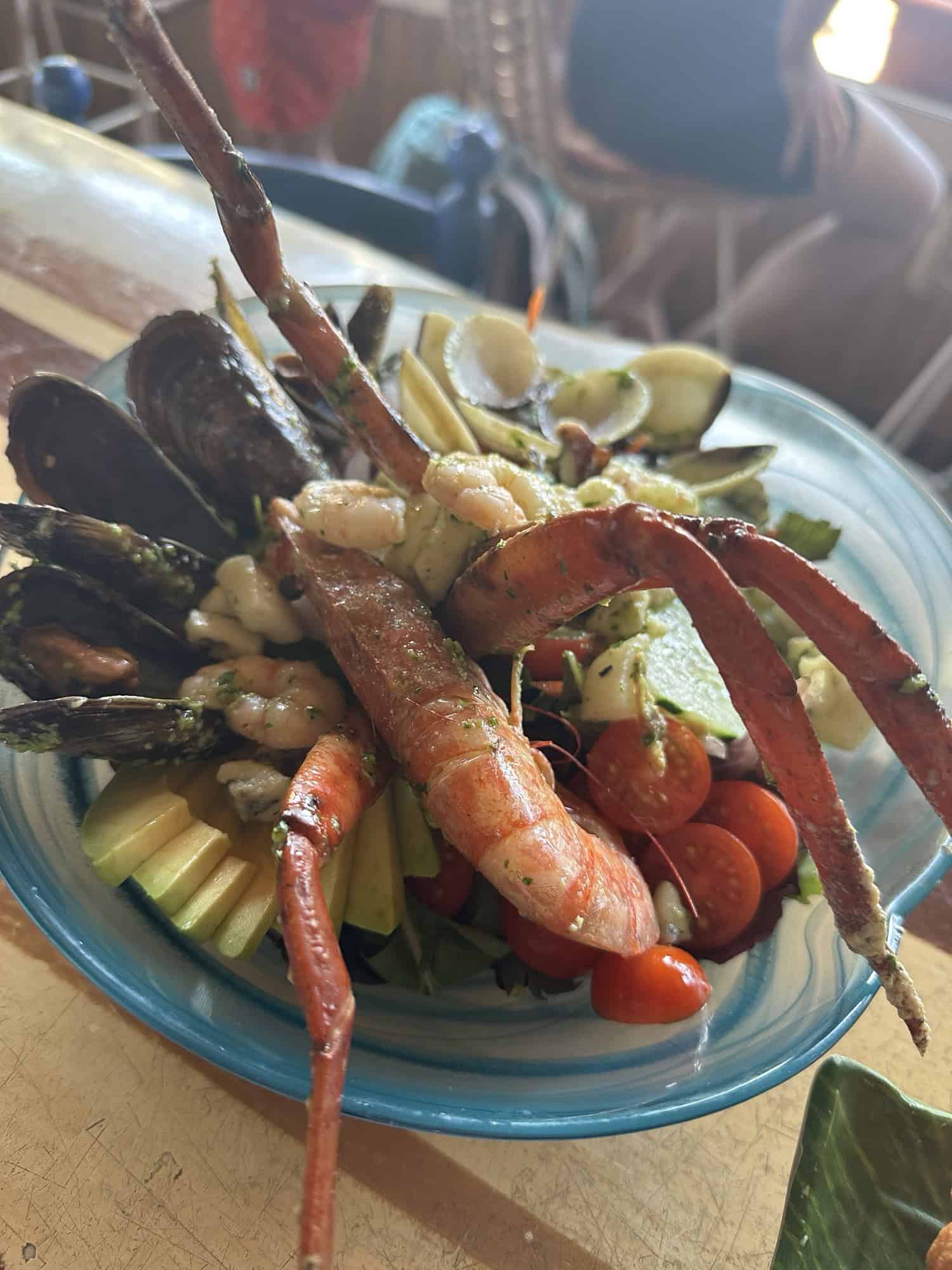The way back seemed much quicker than the way there but I guess that’s because we knew what to expect. By the end of the hike it was 1pm. We were both hot and sweaty, ready to dive into the water to cool off. How lucky to have a beach cove at the bottom of the hike! We jumped in the water at Cala San Vicent and floated around for a bit. At one point Stelios got nipped by a fish and shook it off but after the 3rd time they bit him I ran out of the water. After relaxing on the beach we stopped at one of the beach bars in the Cala for lunch. We ordered the seafood salad, fried plantains, and cod croquetas.
