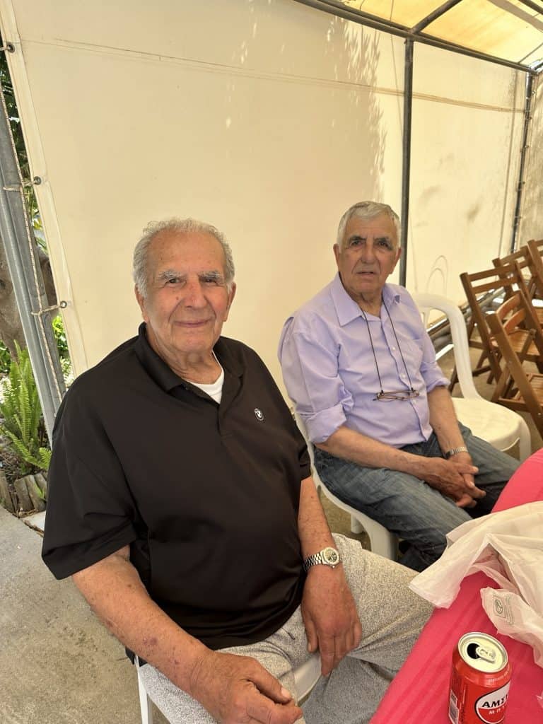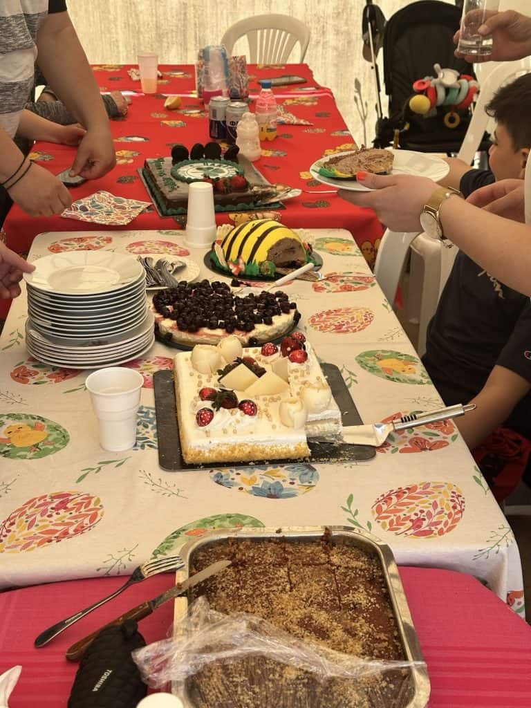 By 2:30pm we sat down for a feast. There was salad, pasta salad, 3 types of loukaniko (sausage), several cheeses and dips, warm pita, French fries, and of course the slow roasted pork. The only thing I didn’t try was the liver wrapped in intestines – which was “supposedly delicious” but no thanks I will pass on that. All of the food was so delicious and I was extremely full. I was getting antsy and couldn’t continue to sit around so I decided to play monkey in the middle with Leo and Angelou to work off some of the food. These boys had me running and jumping around and I worked up quite a sweat! We easily played for an hour or more until it was time for dessert. Dessert consisted of ice cream cake, a homemade cake, and 4 other cakes from A La Crème, the local bakery owned by Virginias family (Stelios’s cousin Markelo’s wife). I had one small bite of each and the chocolate one was my favorite followed by the vanilla lemon cake.