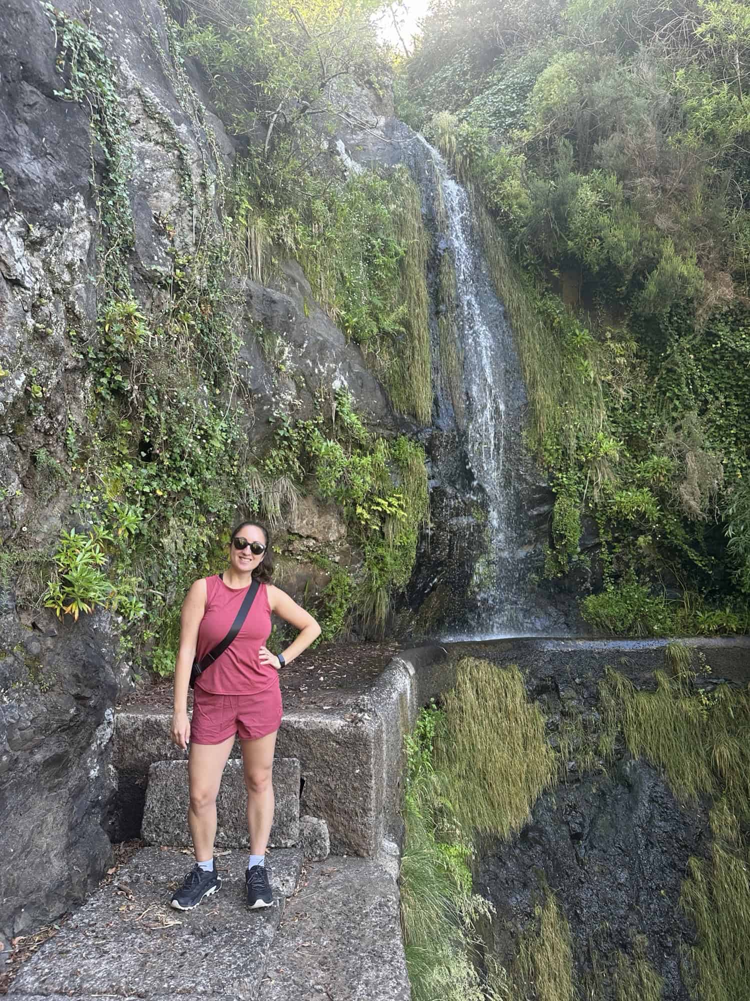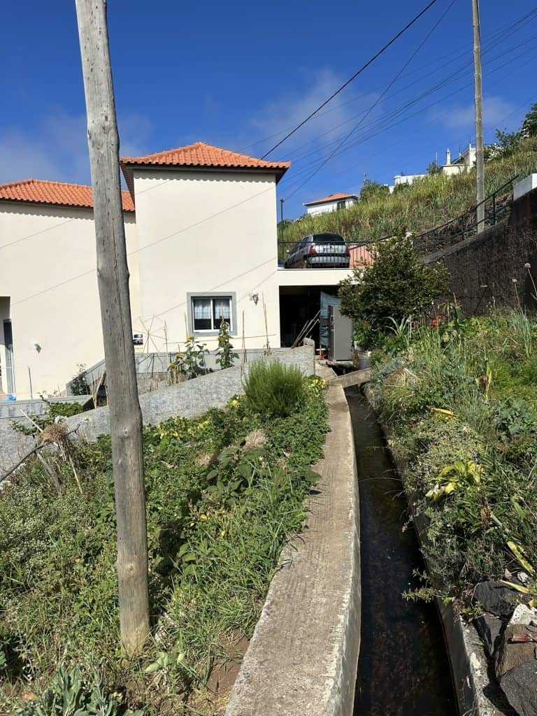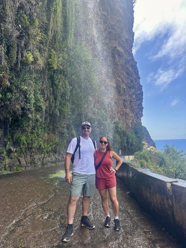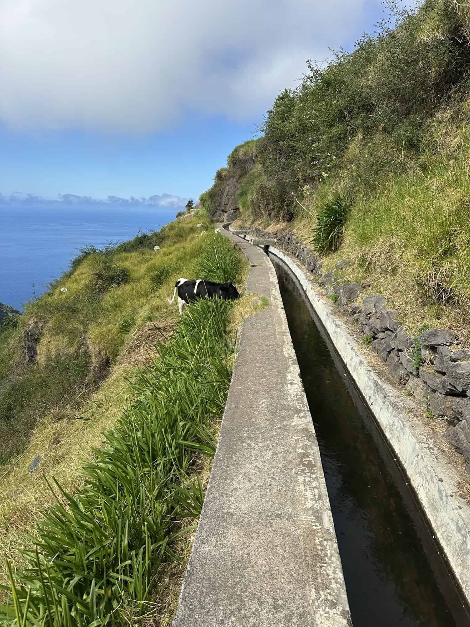 The drive to the Levada starting point reminded us of Sicily with the ocean in sight as we zipped around the highway and went through lots of tunnels going through the mountains to get to our destination. At one point the road became so narrow and steep we were both praying no other cars would come downhill. Stelios successfully maneuvered the car up the steep incline and we found a spot to park off the side of the road. The Levada walk was a perfect way to immerse ourselves in the nature of Madeira and we were the only ones on the trail. We walked over a sketchy bridge, passed by a waterfall, saw many types of flowers and agriculture, crouched through a cave, and even saw a cow grazing. The Levada path ended going into someone’s backyard so we stopped for a water break before turning around and going back the way we came to the car. Overall I think the irrigation channels are very impressive and it’s wild to think that these are all over the island. I wonder how long it took them to build this system.