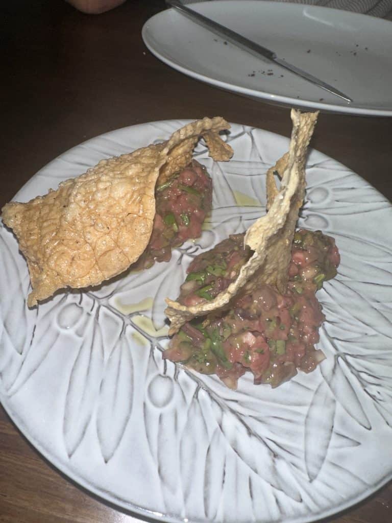By 5:30pm it was time to get ready for dinner. We had booked a “dinner with locals” experience which we were both really looking forward to. The confirmation email said to arrive at 6:55pm but we were running a few minutes behind. We power walked to dinner and arrived at 7pm but the building appeared closed so I called the phone number listed in the confirmation email on WhatsApp and a woman answered saying that the experience had been cancelled because there wasn’t enough people who signed up (they needed a minimum of 6) and that I should have gotten a cancellation email (I did not). What a bummer. On the plus side, she gave us two dinner recommendations that were nearby – Kampo and Aqua. We decided to go with Kampo, known for their specialty meat dishes and it did not disappoint.