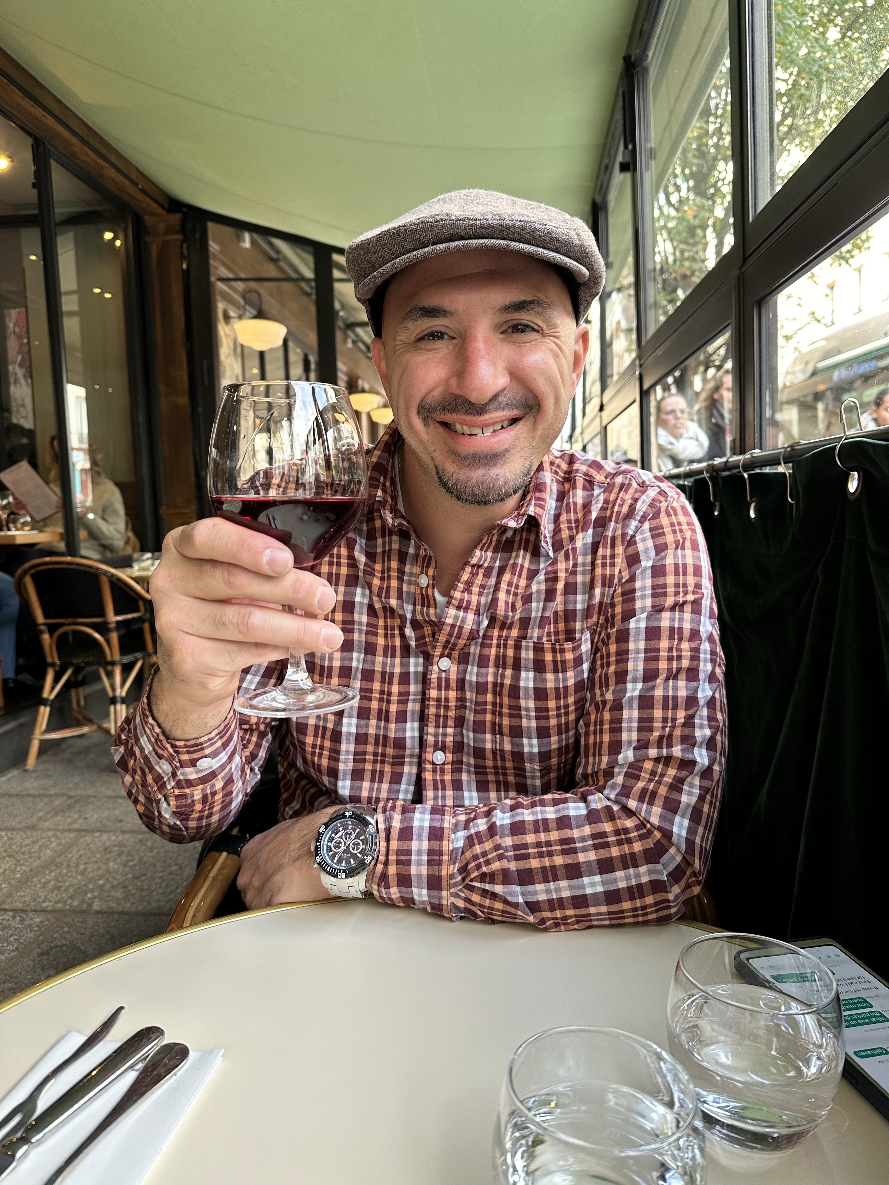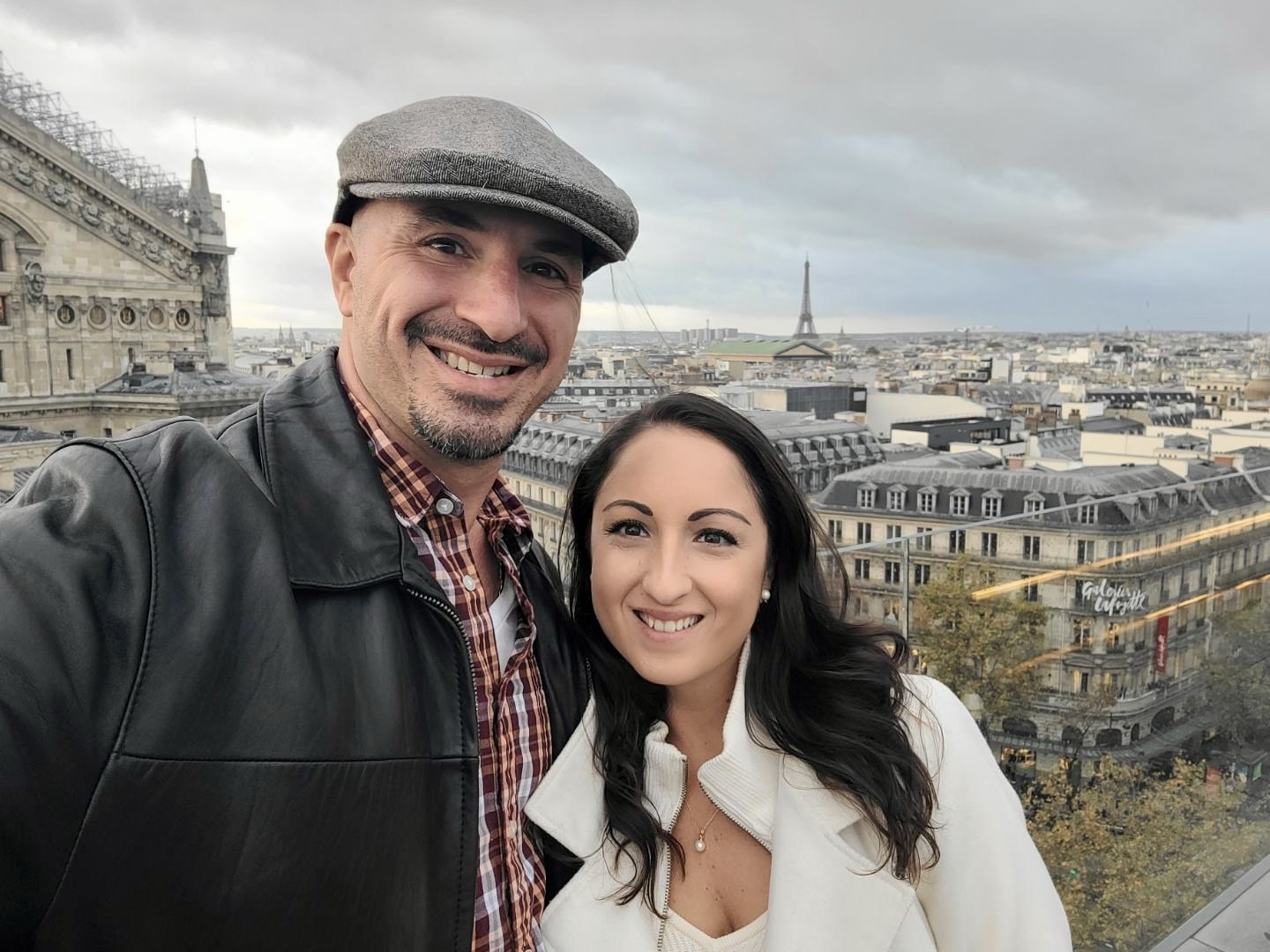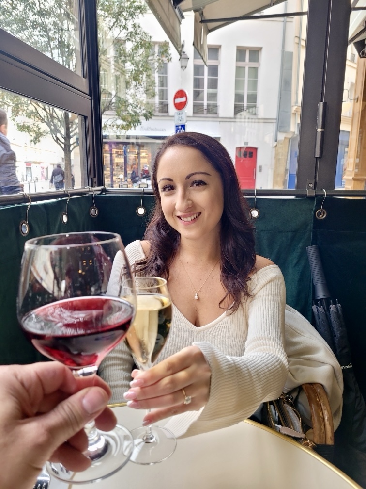I ended up buying a pair of Prada sunglasses & Fendi earrings. The Fendi earrings were my favorite, perfect to wear for the holidays or on a date night out to dinner. I also liked that they were from their new collection and there was only 1 left so it seemed like a sign! After my shopping splurge we walked across the street to the men’s store – Stelios was in search of a new wallet/card holder but didn’t find one that he absolutely loved. We ended up going to the rooftop of the Galerie to check out the view – it was very scenic with the Eiffel tower in the distance and there was even a restaurant/bar upstairs which was cool. However, then the rain started to come so we went back inside.