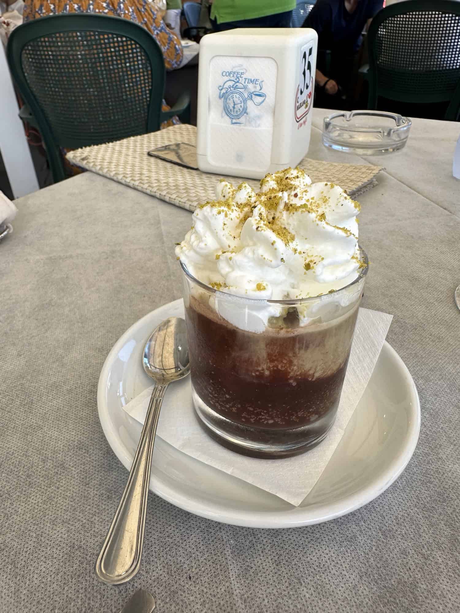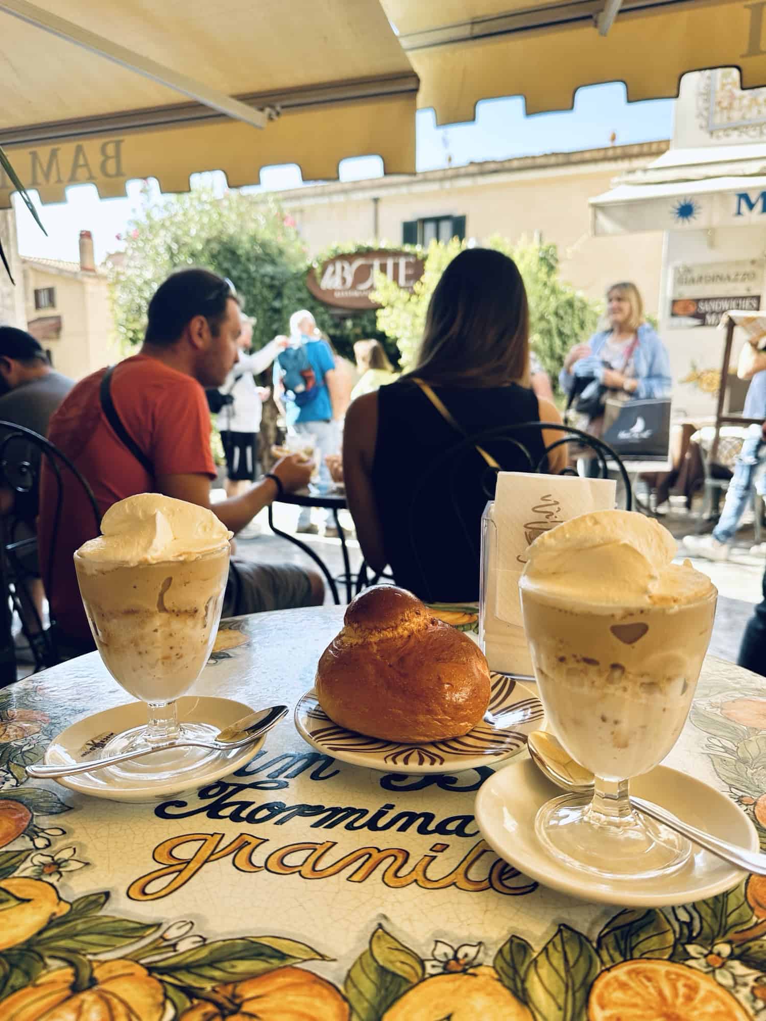 We woke up and enjoyed our morning view of Taormina from our Airbnb. It is so beautiful here I will never grow tired of this view. We walked to Bam Bar for a traditional Sicilian breakfast – granita and brioche. Granita is a refreshing Italian treat, similar to sorbet but definitely better, and Bam Bar is supposed to have the best. We ordered 2 coffee & almond granitas with cream on top and brioche on the side. It was so delicious and refreshing. We also got 2 cappuccinos for our caffeine fix and the total was only 18 euro for breakfast. I can’t believe I waited this long on our Sicilian trip to try Granita but I’m also happy my first experience of it was at Bam Bar. I’m curious if any other places will compare.