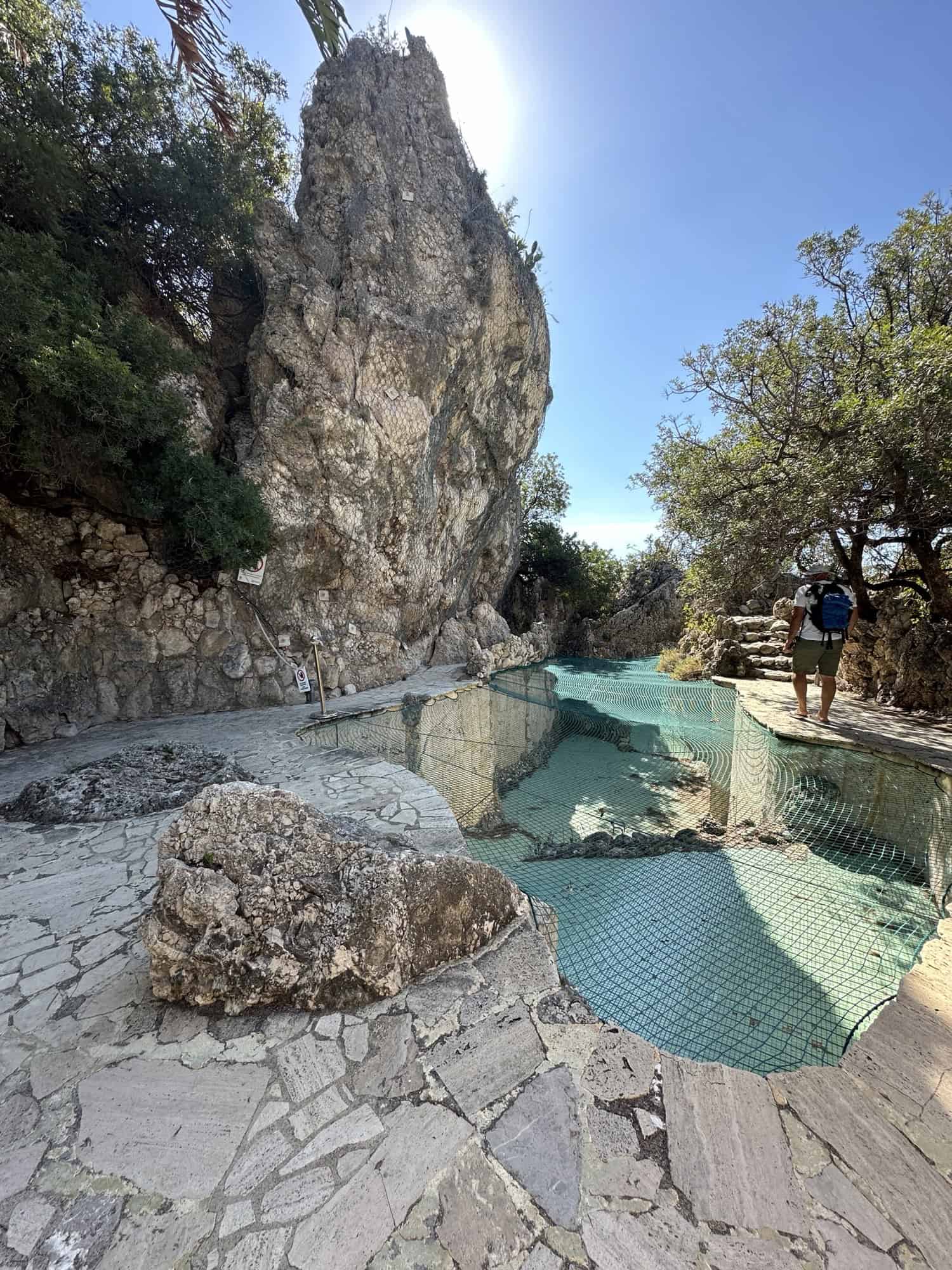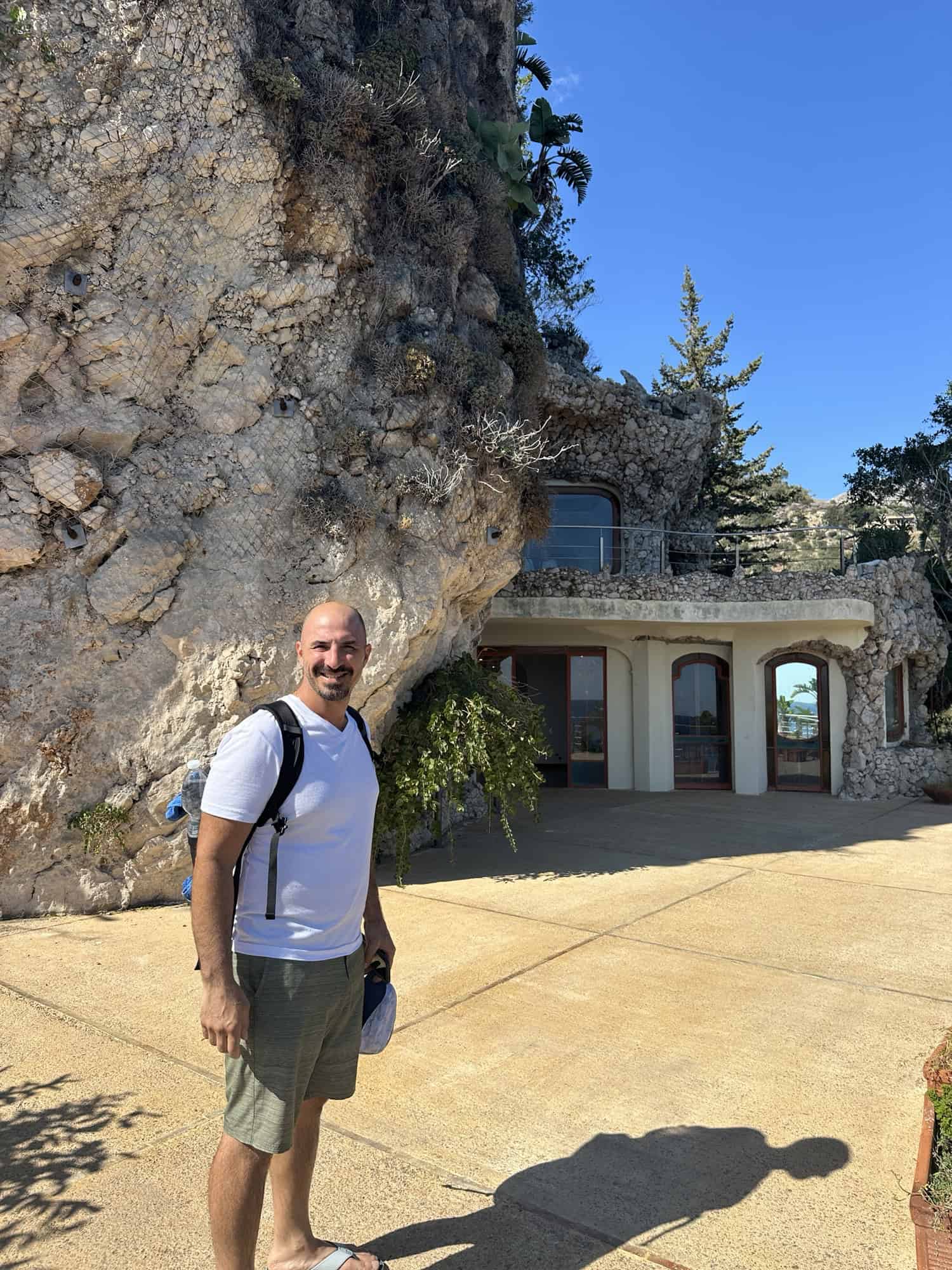 After breakfast we walked 30 minutes to the beach of Isola Bella. You had the option to either take the cable car down or walk – but Stelios and I both love to walk, especially where there is so much to see, so we opted for the staircase journey on the way down. From the top it didn’t seem that far away, but the walk down took longer than expected. By the time we reached the beach we were hot, sweaty, and ready to dive into the crystal clear blue water. We took the path that lead to Isola Bella which required us to walk through the water knee deep. The path was a mix of rocky sand and straight rocks, so I was thankful for my waterproof Reef sandals. We swam around in the water and then decided to go explore the house that was built into the island. It was 5€ a person to enter the house and explore, and it was definitely worth it.