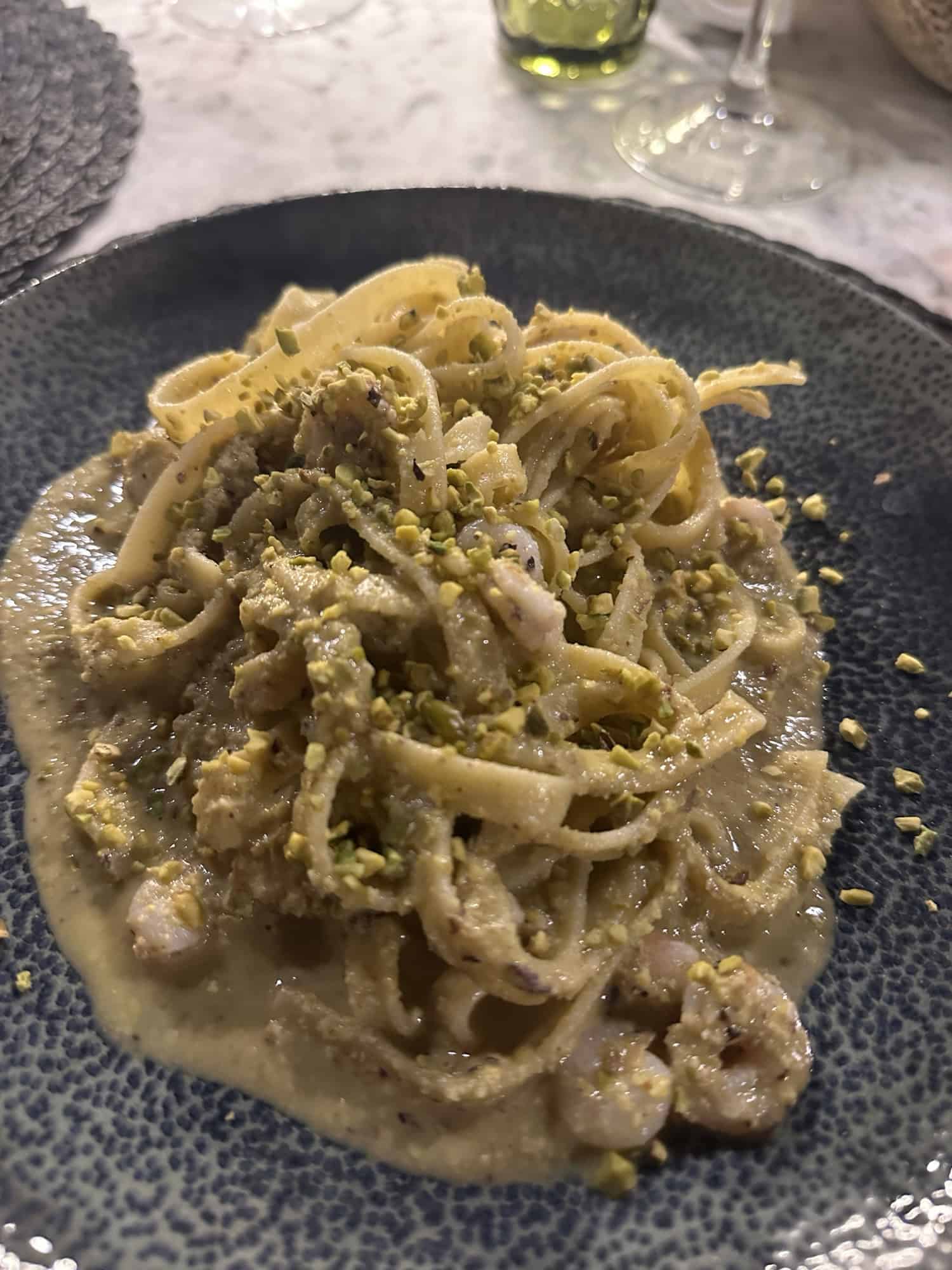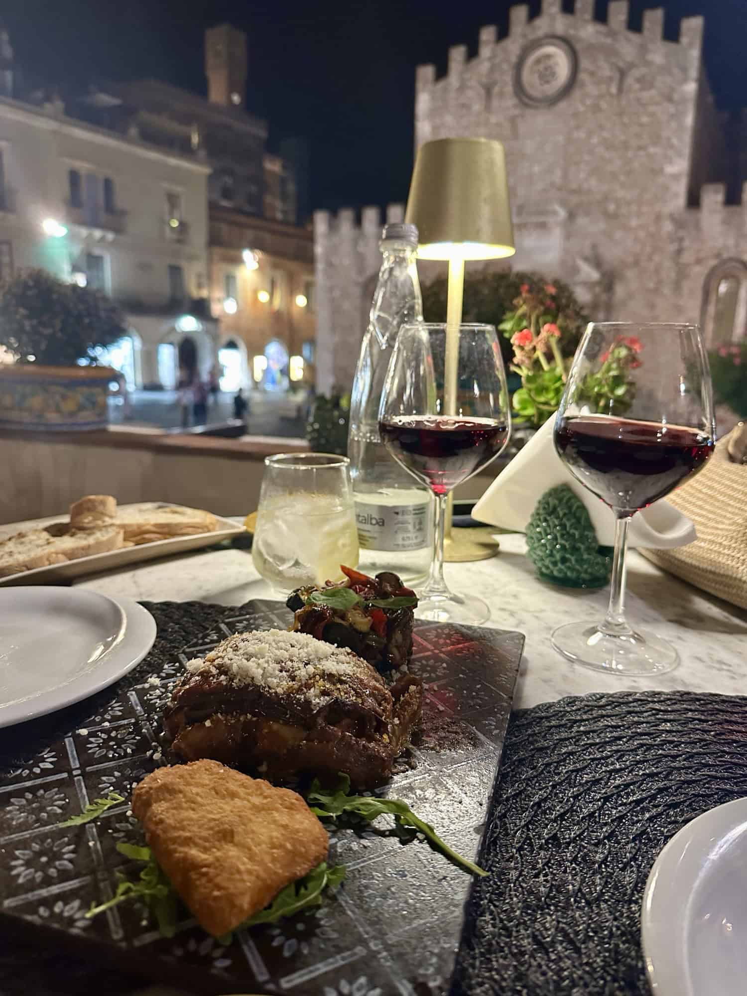 After lounging around at the villa, we showered off the salt from today’s dip in the ocean and got ready for our night out. We decided to go to Ristorante Al Duomo, a restaurant recommended by our Airbnb host. We didn’t have a reservation but since we were having an early dinner at 7:30pm we got lucky and were sat at a front row table outside overlooking the main square and duomo. We ordered 2 glasses of red wine, the appetizer special, Pasta all Norma, and Pistachio Pesto Tagliatelle. All were delicious!
