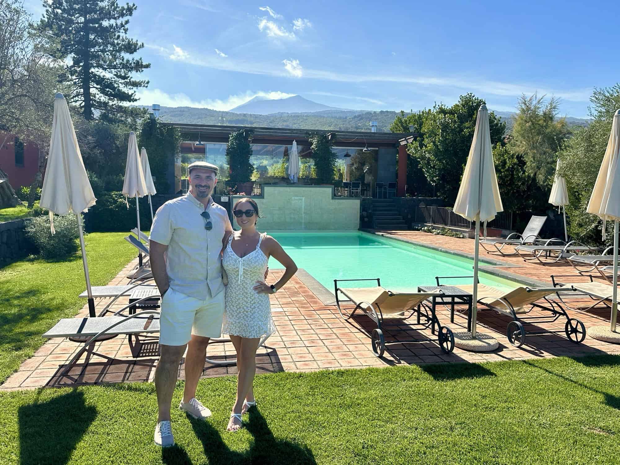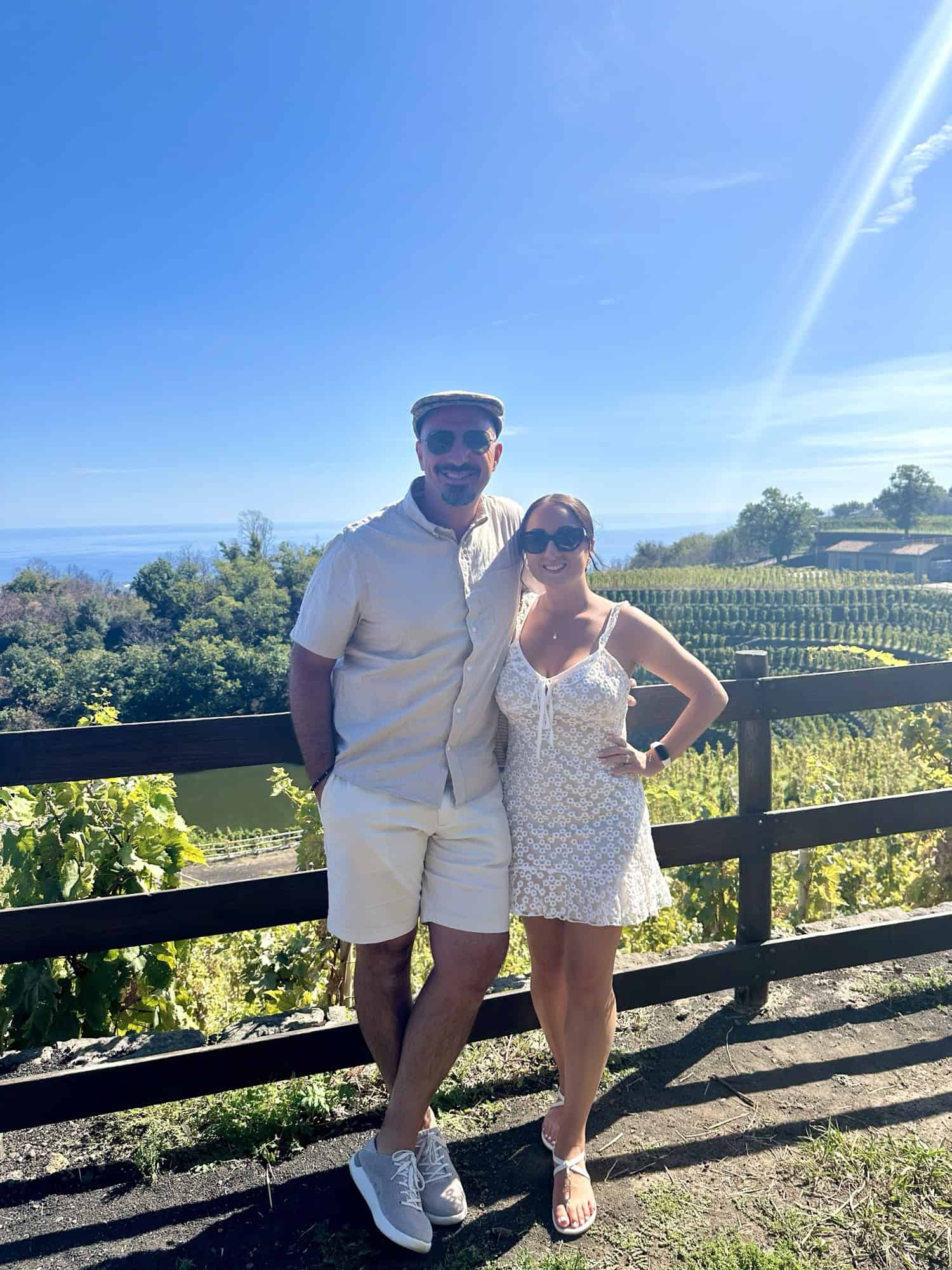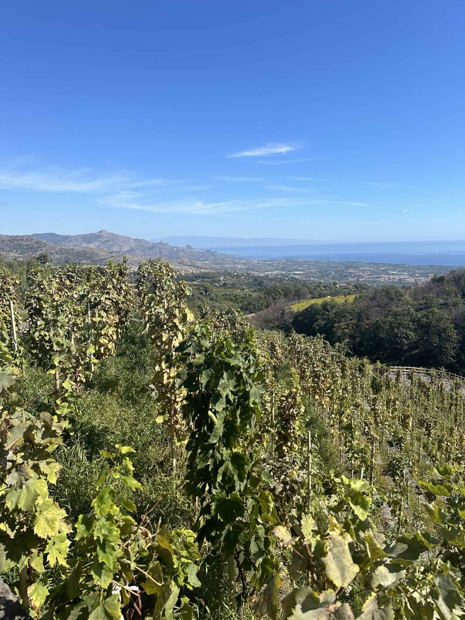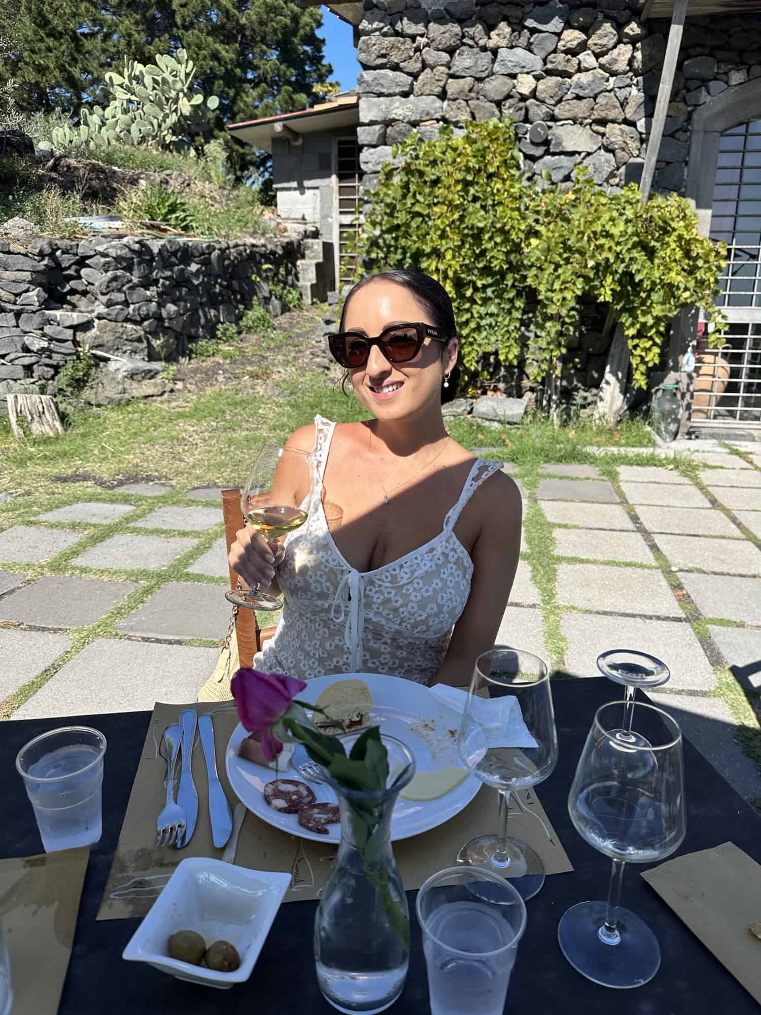 After enjoying the wine the Sommelier took us out to see the vineyard. She explained that everything in their winery was done by hand and that 2024 was a very good year for Sicialian wine. I asked her when they would start selling the 2024 bottles and she said not until 2028 or 2029 – we’ll have to keep an eye out for wine from back home since that’s our wedding year or return one day to get some of the local bottles.