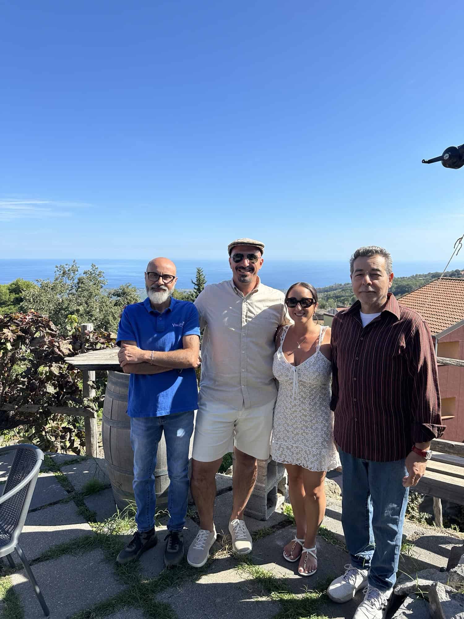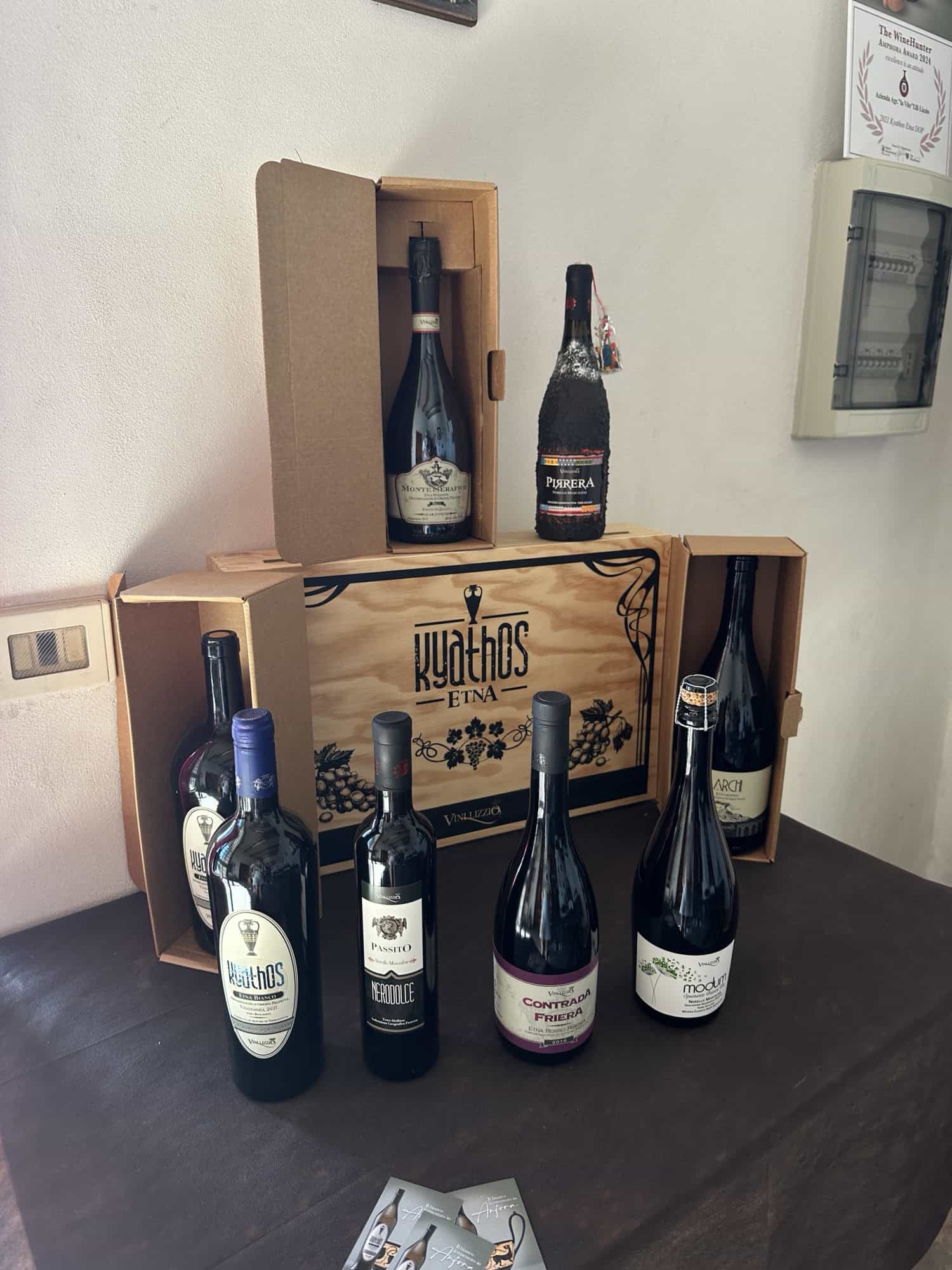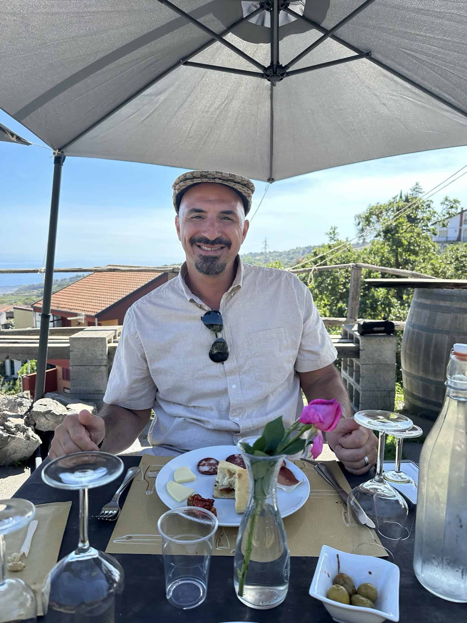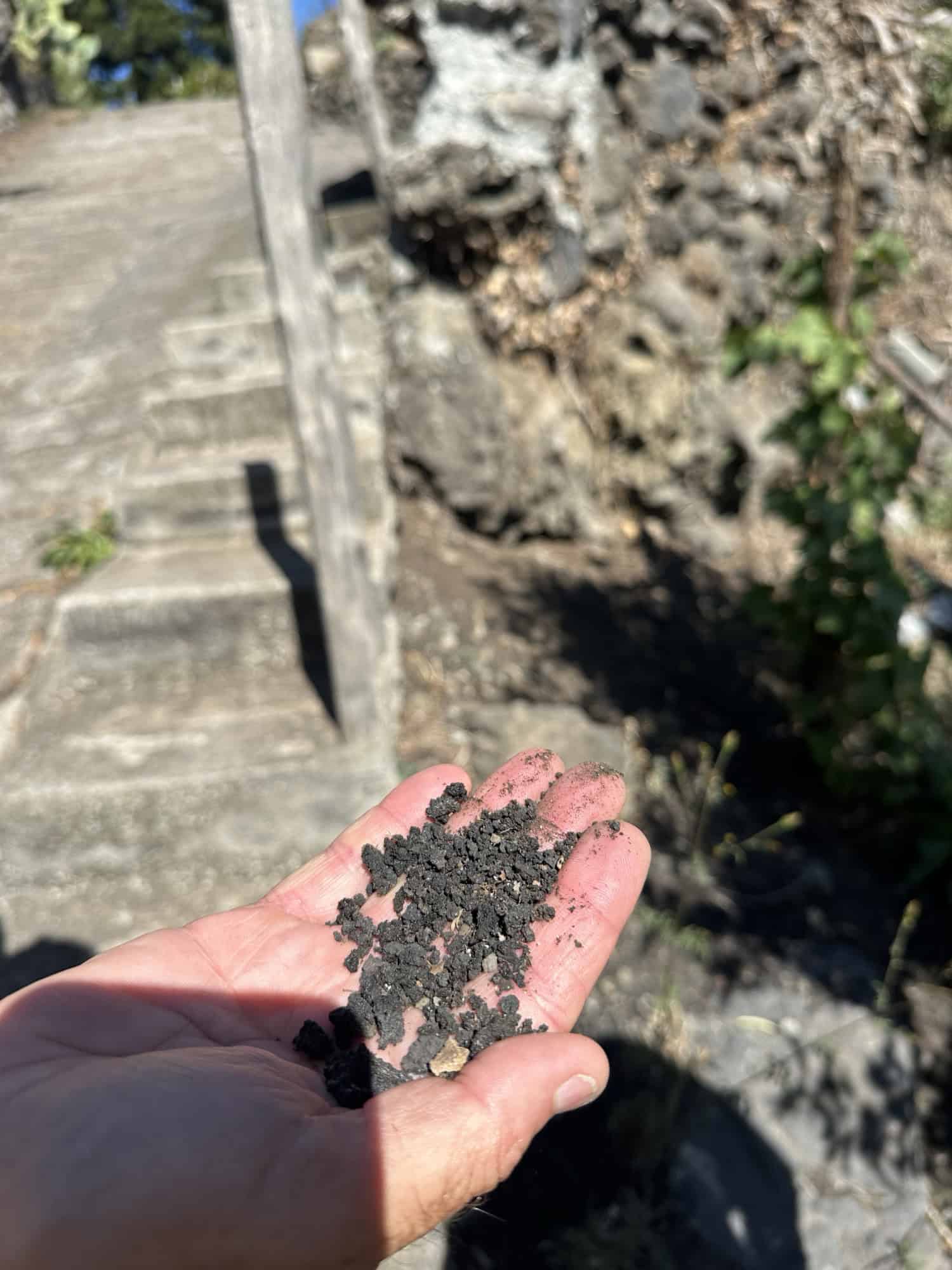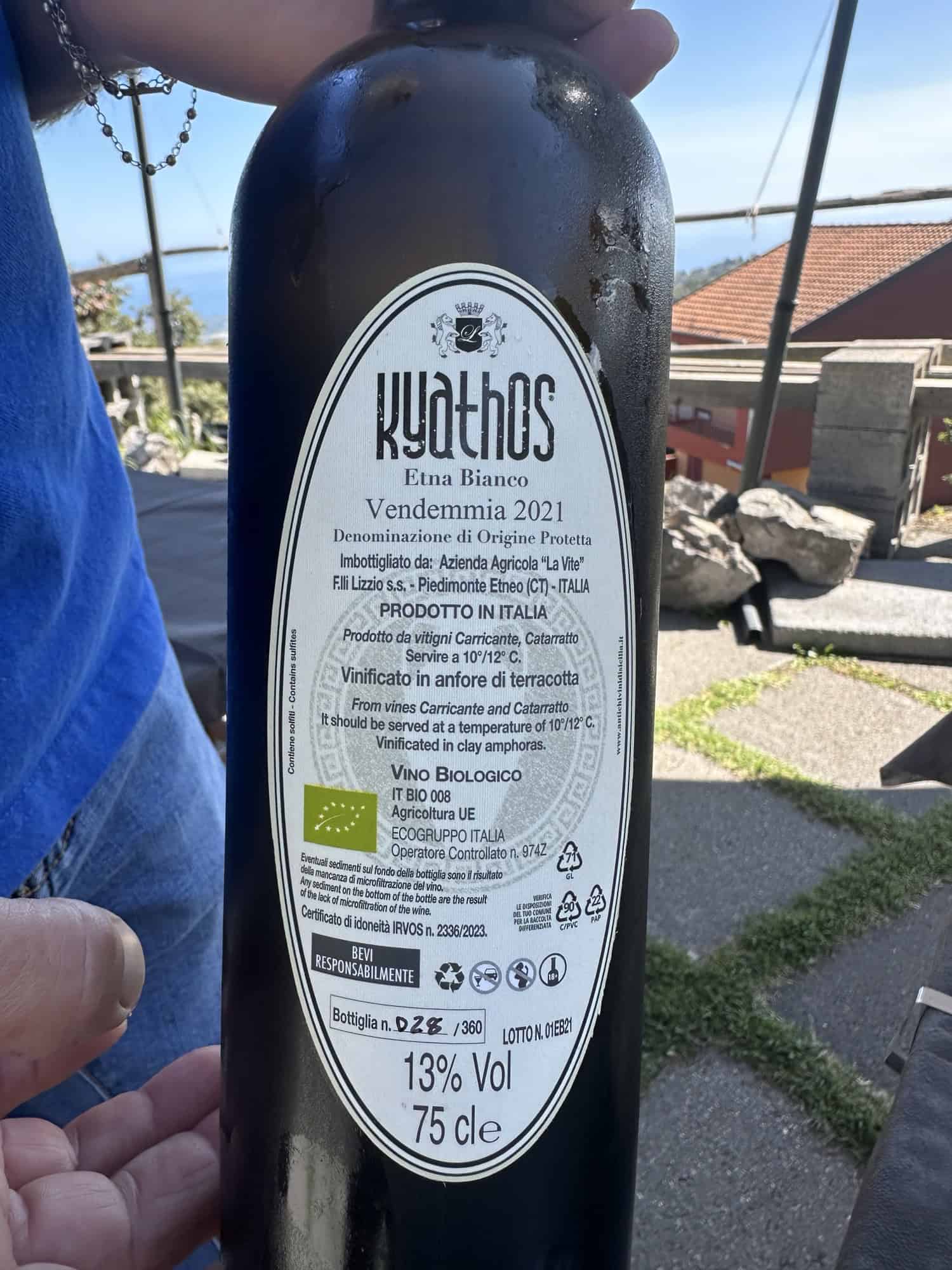 The second winery we visited was called Lizzio and it was run by two brothers – Antonio and Dino, who had very different personalities and characteristics. The first brother, Dino, was very soft spoken and greeted us when we initially arrived explaining the wine process at their winery and that they were very small producers of wine – only 400-600 bottles of a certain type of wine was made at a time, which is why they had so many different labels. They also use an old school method of storing their Kyathos wines in terracotta barrels which I found very interesting and couldn’t wait to try, but they weren’t included in the standard tasting menu so we asked Antonio if we could buy 2 glasses to try. Their other wines are aged in cherry oak barrels. He also pointed out the black rocks on the roof of some of the overhangs of the winery and explained that it was volcanic ash from the last Mount Etna eruption in August. How wild! It was almost like a thin blanket of black snow that covered the roof.