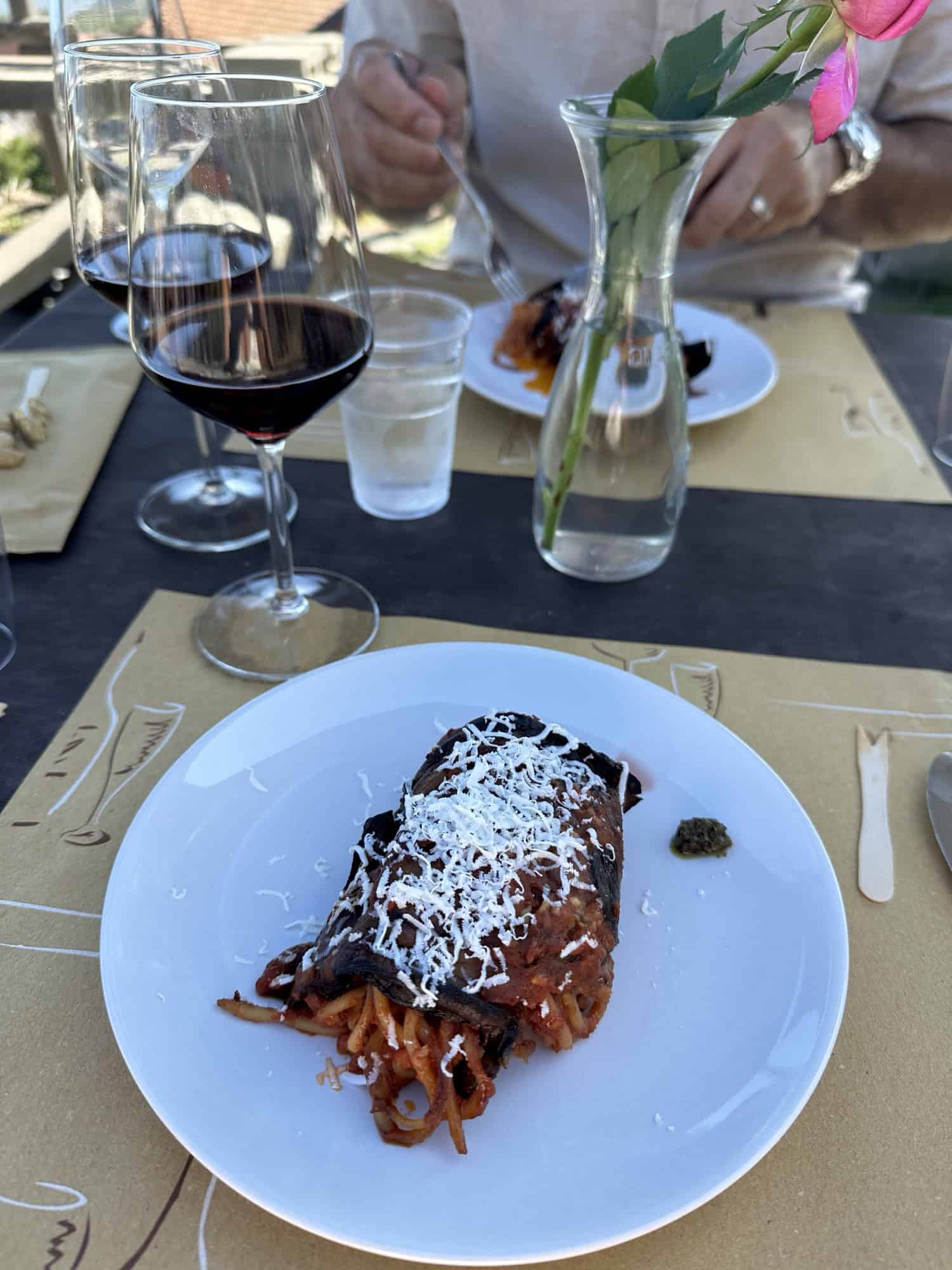 The wines that were aged in the clay terracotta barrels were very good but my favorite was the white wine made from Nero Mascalese (a red grape). That seems to be a trend of our trip, that Stelios and I both like the red grapes used for white wine better. Along with our wine tasting we would be served a delicious homemade Italian lunch cooked by Dino’s wife. It was one of the best meals we had in Sicily so far, and the best pasta alla Norma we’ve had the whole trip. This pasta alla Norma was prepared differently and wrapped inside of the eggplant – it literally melted in our mouths. After lunch we thanked the brothers and went on to our final winery.