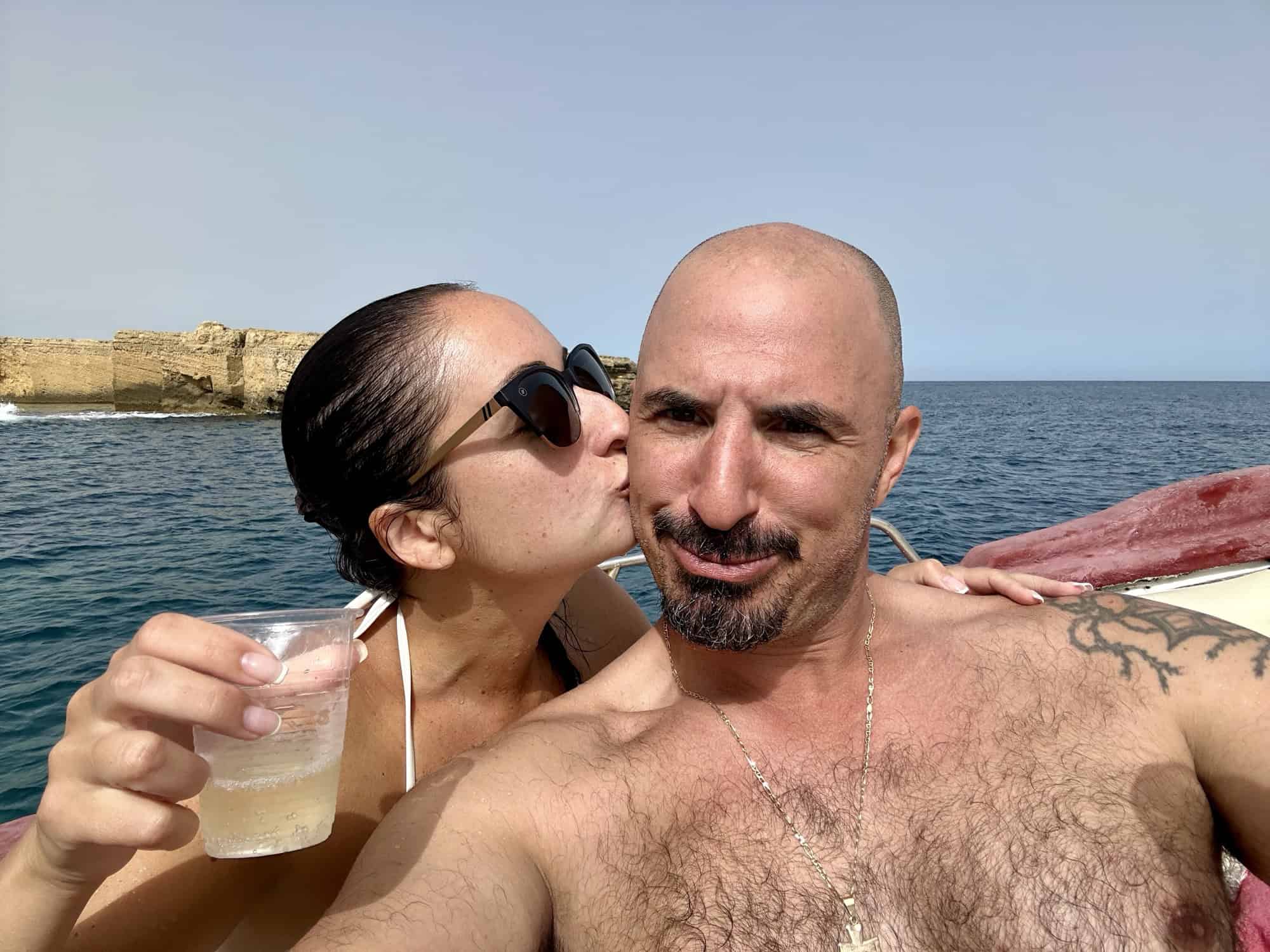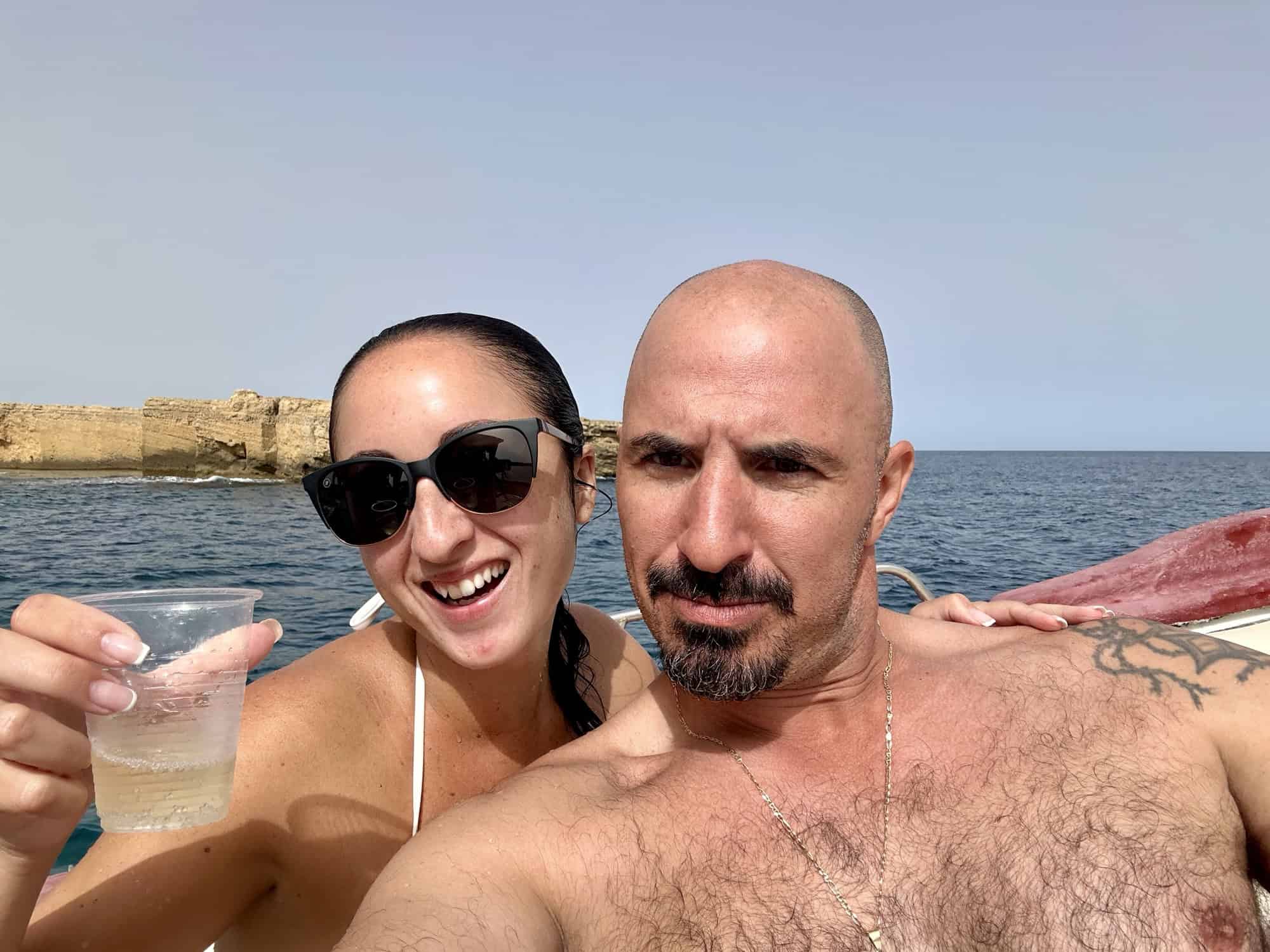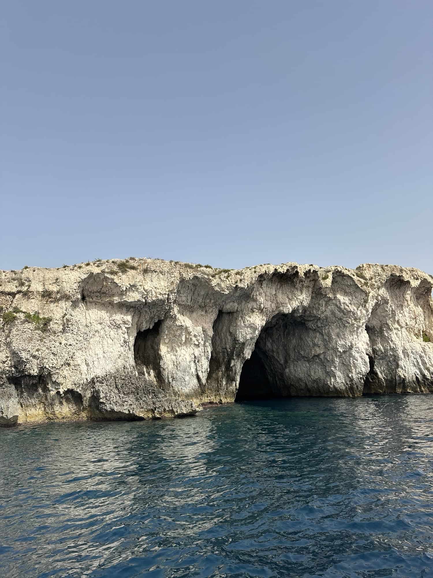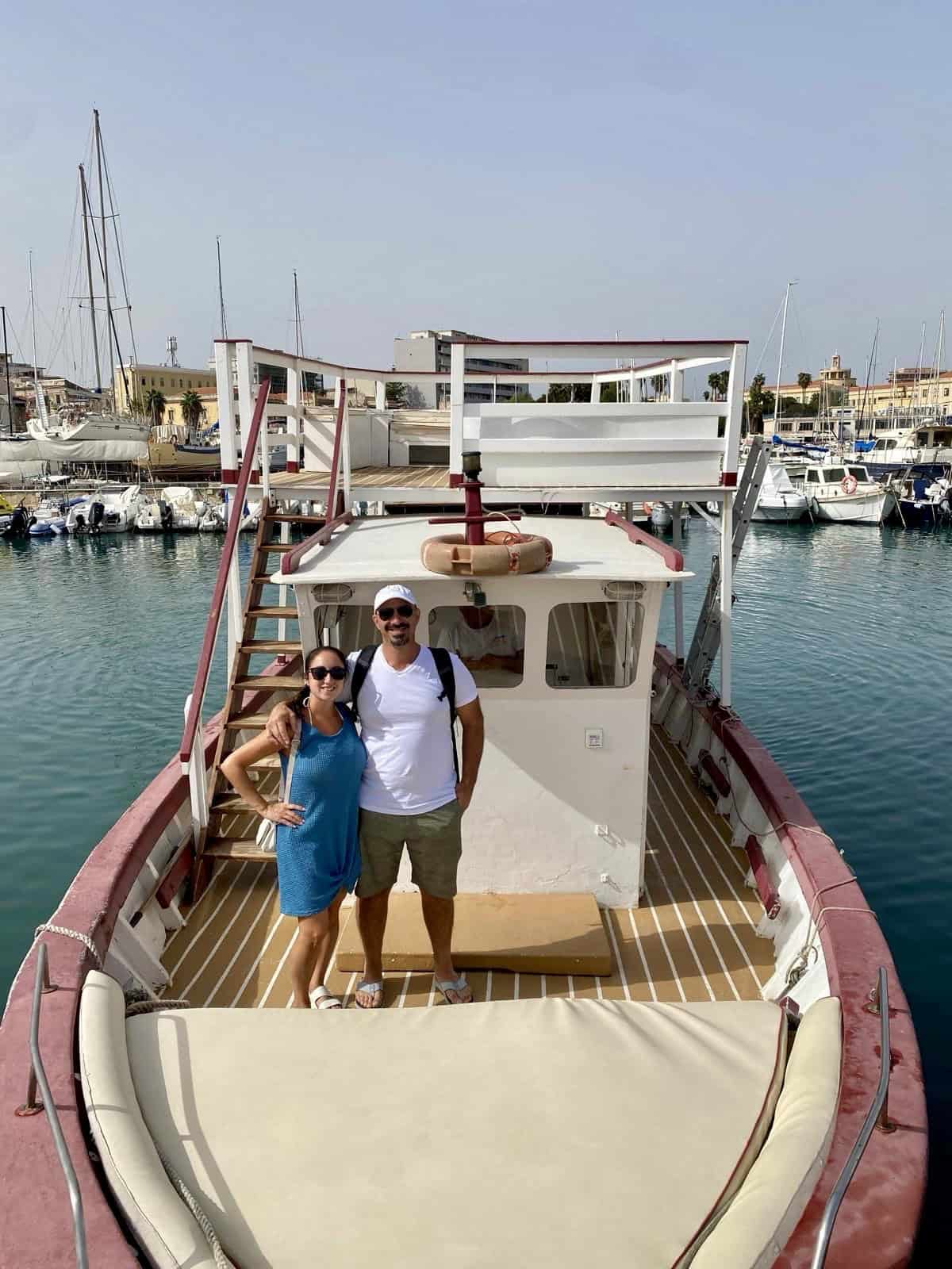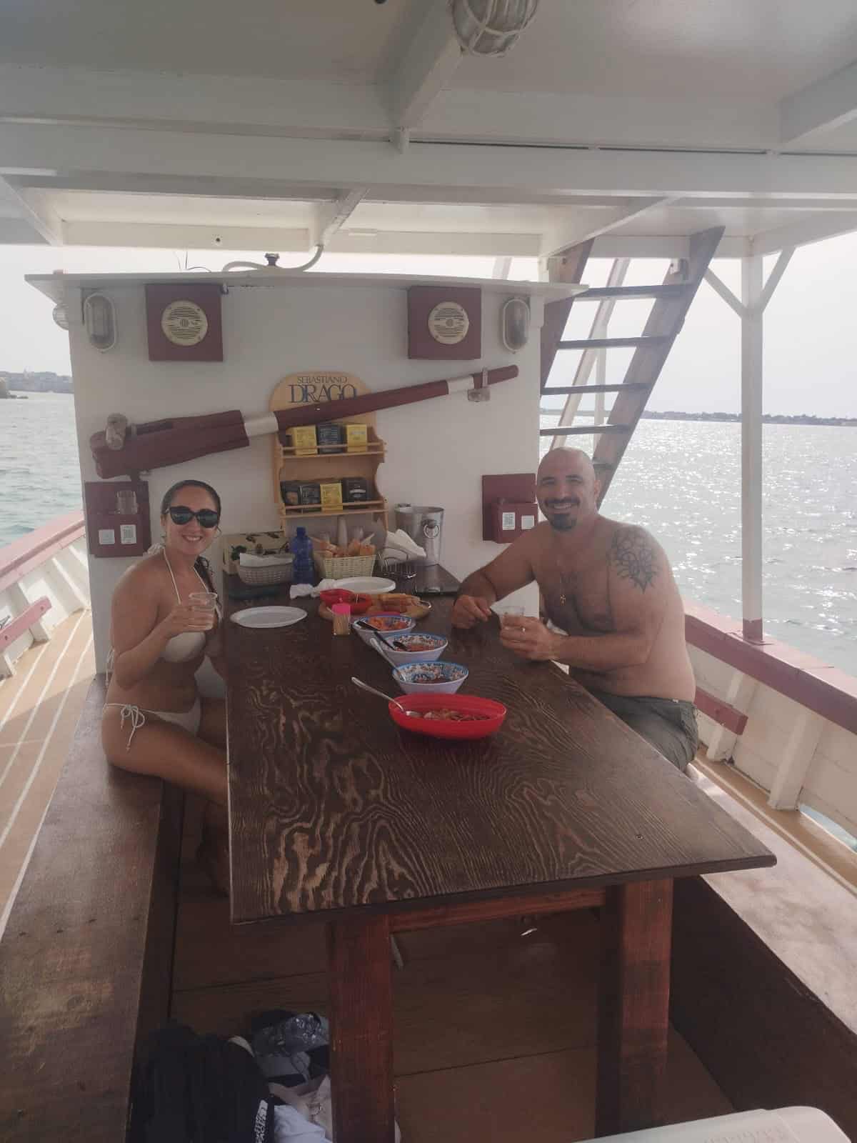 After breakfast it was time for our excursion. We had booked a private half day boat tour of Ortigia through Dolci Escursioni that would stop at 2 different sea caves. Our Captain Antonio and his first mate Nino were very nice and welcomed us on board. The boat was definitely older and looked like an old fishing boat that had been converted into a lounge boat with a nice mat to lay on in the front and a long table for eating in the back. There was also a second level with sofas for lounging. It wasn’t the type of boat I would typically search for but we booked this last minute (literally yesterday) so I wasn’t going to complain! Overall it was spacious and as long as we could jump in for a swim and had somewhere to lay out on the boat we were happy. The excursion also included wine/beer and lunch which was much needed after being in the sun and swimming around in the water.