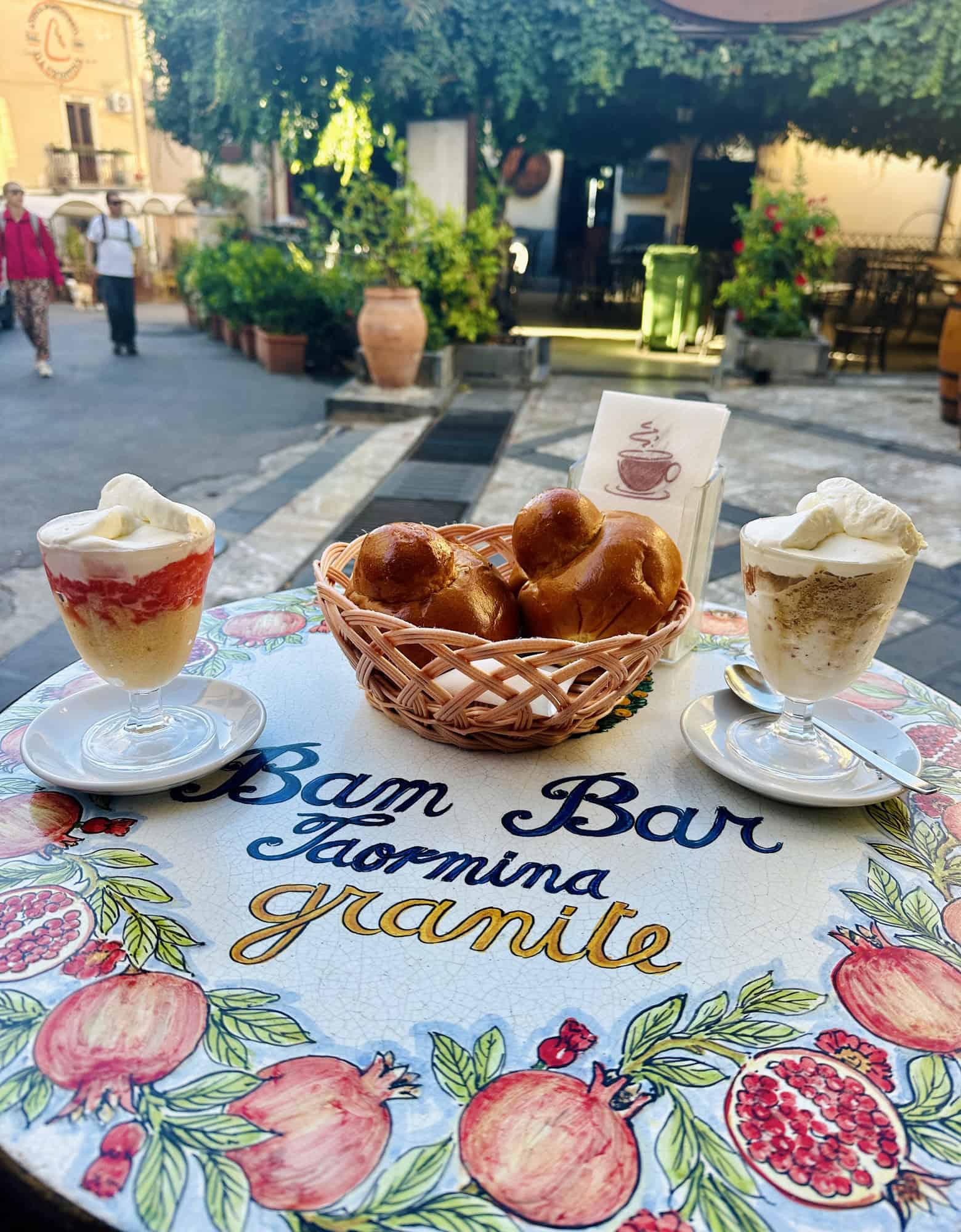 We had to check out of our Airbnb by 10am today (which seems to be the standard time in Sicily) so we woke up at 7am to pack our bags and grab breakfast. We made the final trek up the hill, my calf muscles stronger but sore after making this climb up to town twice a day for 4 days. I was very happy that this would be the final time I had to walk up this steep hill. We walked 5 minutes to Bam Bar for our final granita and brioche breakfast. There was no line and we grabbed a front row table for 2. I plan to try at least one more granita in Ortigia before we leave Sicily but I honestly don’t think anywhere else will beat Bam Bar. We went for one last stroll through the Taormina gardens and then walked back to our car right before 10am.