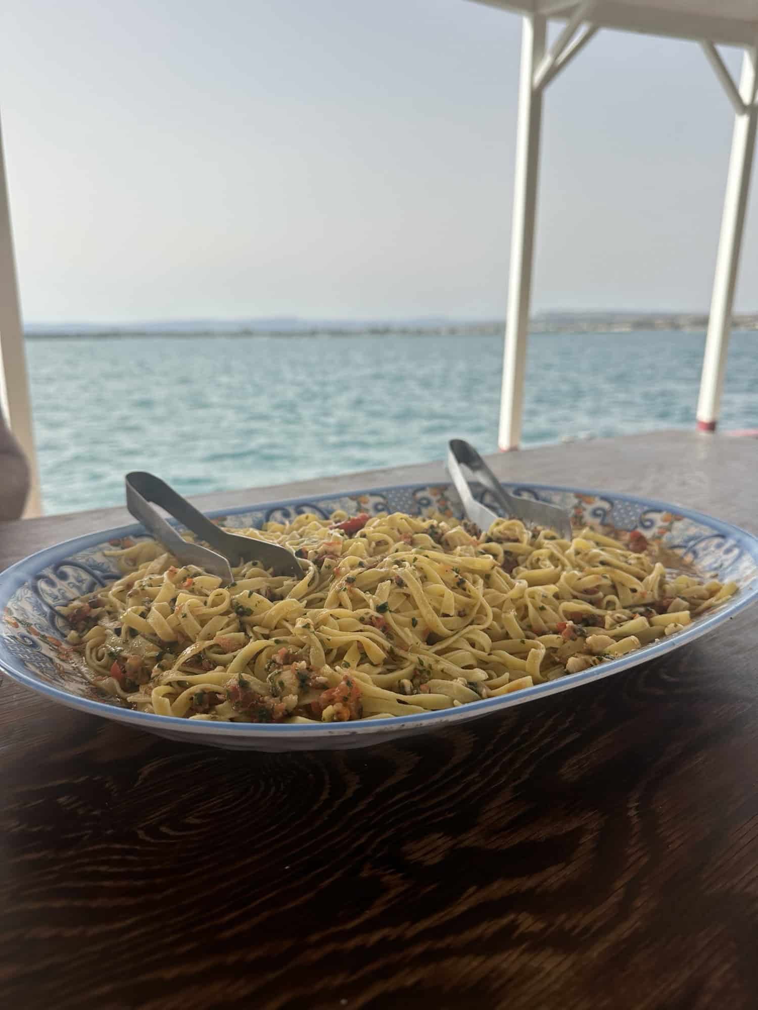 Our last stop on the boat was in the bay of Ortigia where the water was calm and mellow like a small lake. This is where we anchored to enjoy a fresh Italian lunch made by Nino the first mate. He told us all of the vegetable appetizers were fresh and from his garden. The eggplant caponata and eggplant parmigiana dishes blew us away. The main course was of course pasta – tagliatelle with tomatoes, olive oil, and basil. While we were eating lunch our skipper told us he is retired and he just does the private tours on the side as a passion. He also has 7 houses and 3 horses – He told us that 3 of the houses he lives in during different parts of the year and he rents out the other 4. He pointed out his “beach house” to us while we were on the boat. Looks like he has an excellent retirement plan set up for himself. By 3:30pm we docked the boat and thanked Antonio and Nino for an excellent day on the water.