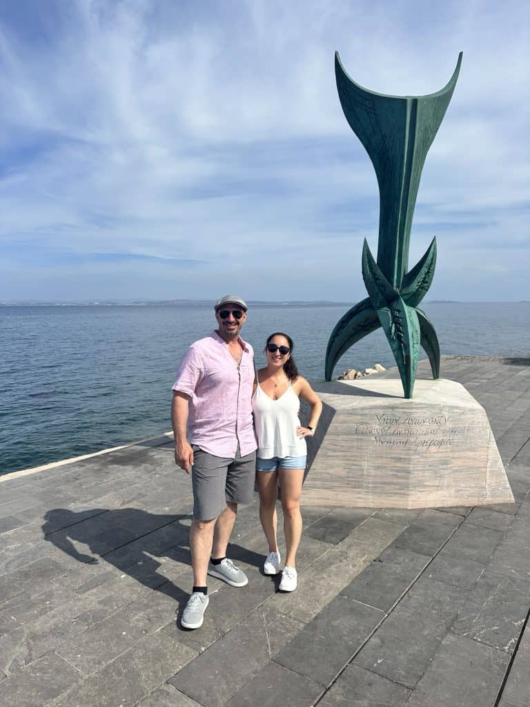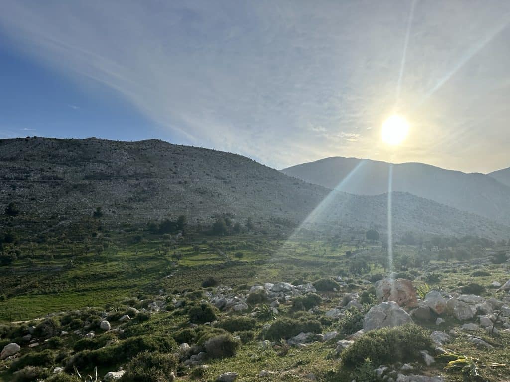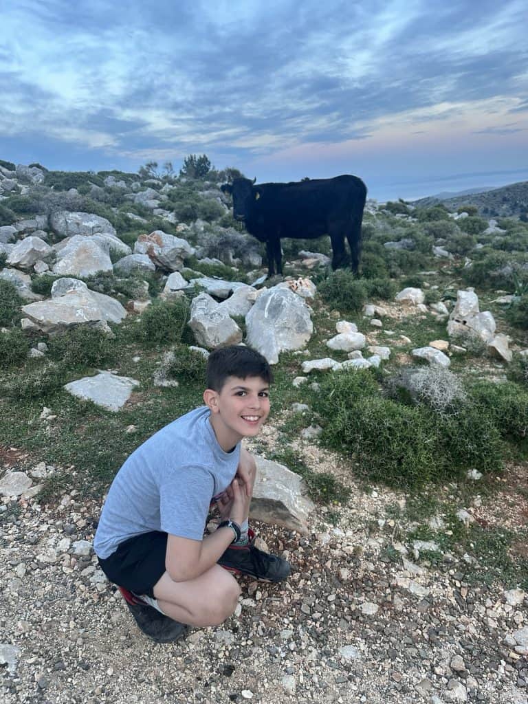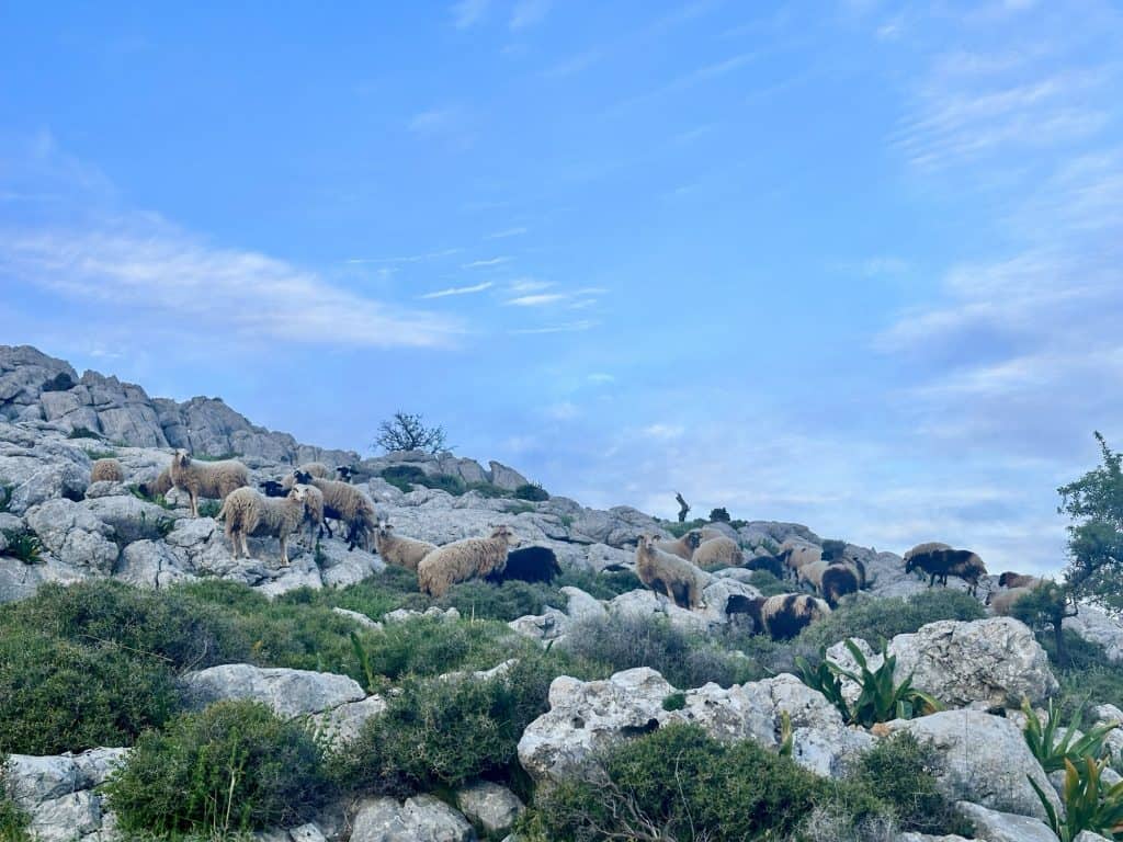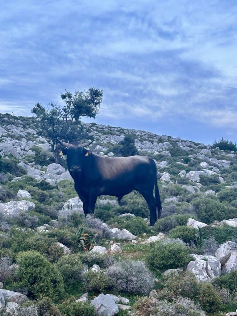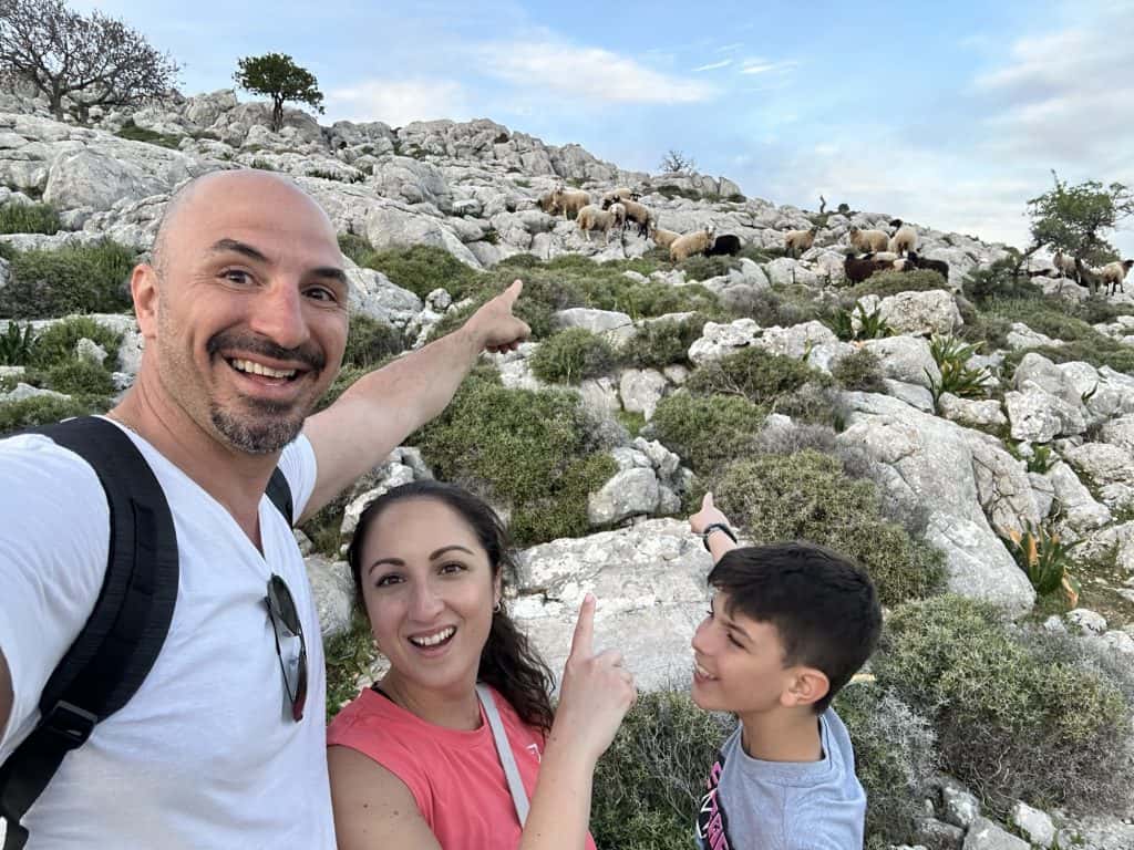 When we reached the top we walked to Grias Castle, which means “old lady castle” in Greek, and could see the remains of a castle wall. The panoramic views of Chios below were incredible and the sky had a subtle rainbow hue to it as the sun continued to set. Leo really enjoyed the hike and asked if we could go on another before we leave. That was most definitely the plan! On the hike back down there was a herd of sheep blocking the path but as we continued walking towards them they quickly moved out of the way.