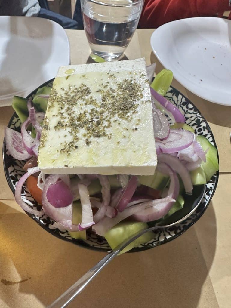 I slept in until 12pm. I don’t know why but the time difference and jet lag is really taking a toll on me this trip. I quickly ate a Greek yogurt with peanut butter to hold me over until lunch & got ready for the day. Leo wanted to stay and play with the kids in the backyard, so Stelios and I walked down to Chora for lunch.
