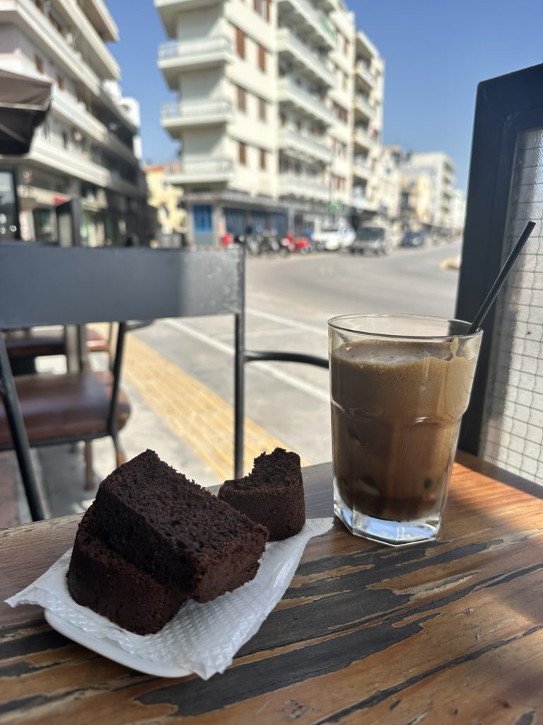 I woke up at 8:30am after finally getting a decent nights sleep! We quickly got ready and drove to Chora to meet up with the Stelios’s other cousin Markello for coffee at a cafe called Plan B. I ordered a frappe with almond milk that may be the best frappe yet taste wise. We chatted and hung out for 2 hours then said our goodbyes. On the walk back to the car we popped into a bakery to grab Spanakopita – although it was tasty there was little to no feta cheese inside so it was not the savory bite I was hoping for. I hadn’t had anything to eat yet so I ate the whole slice anyway. Back at the house Stelios played some basketball with Leo & Angelou and I sat on the front balcony to tan and blog. The sun was STRONG today and even though I put sunblock on, my chest was red after 15 minutes.