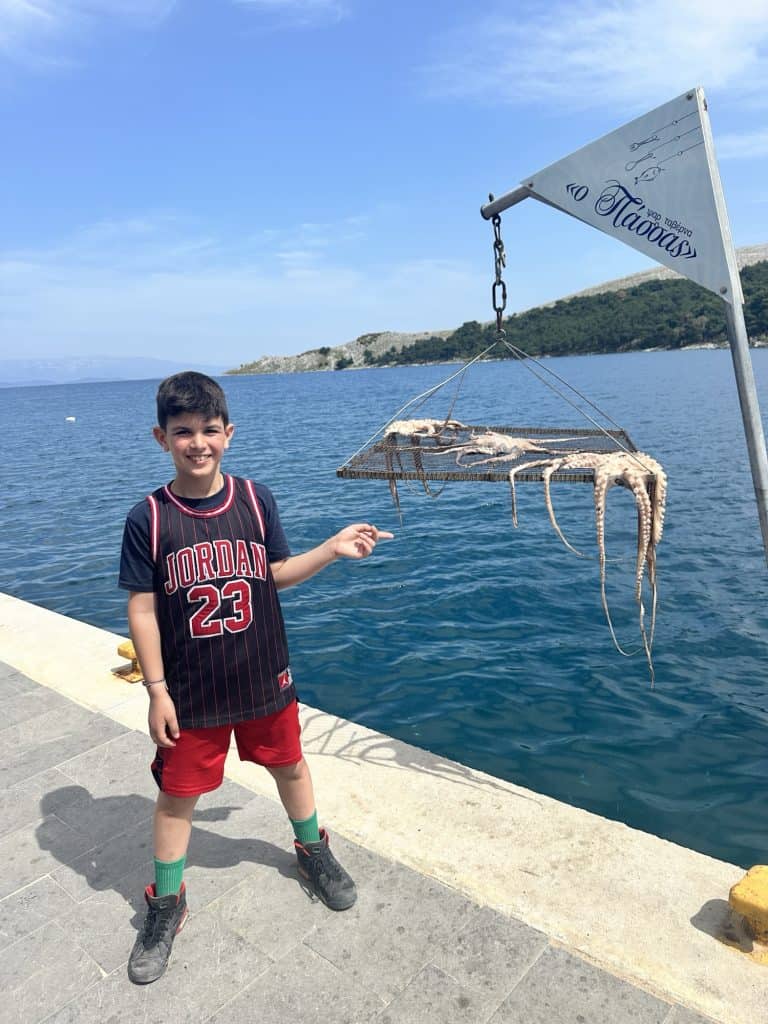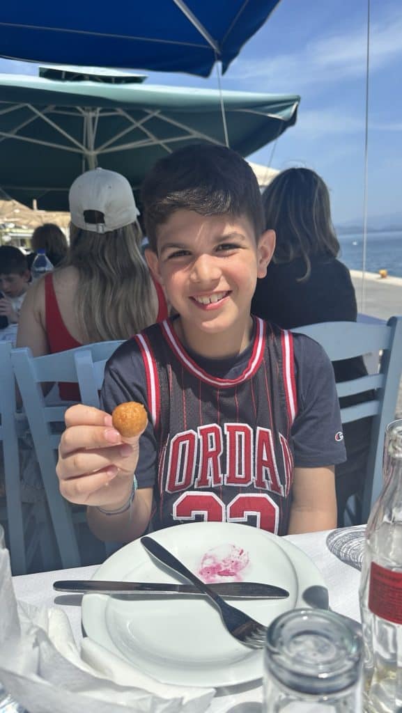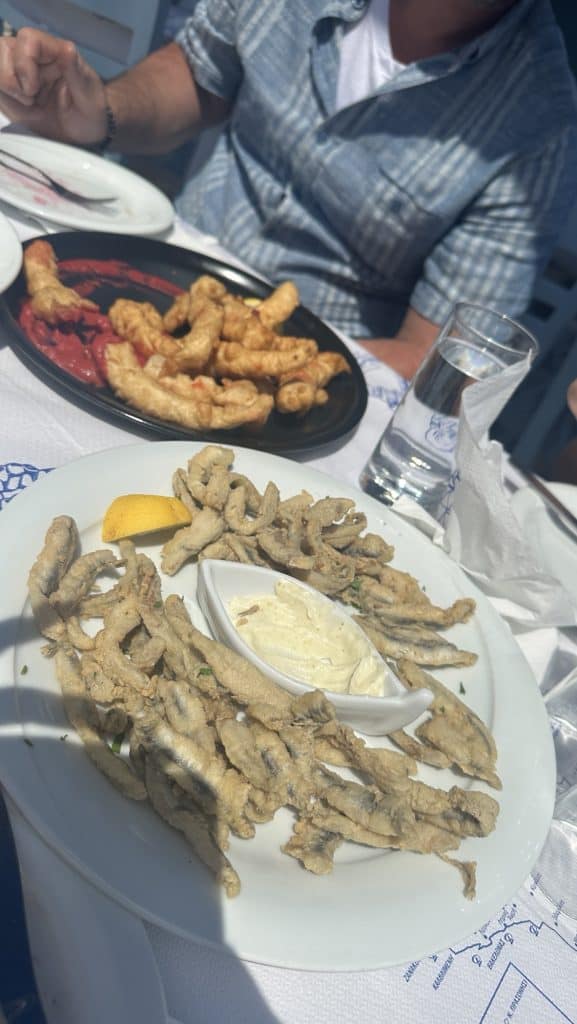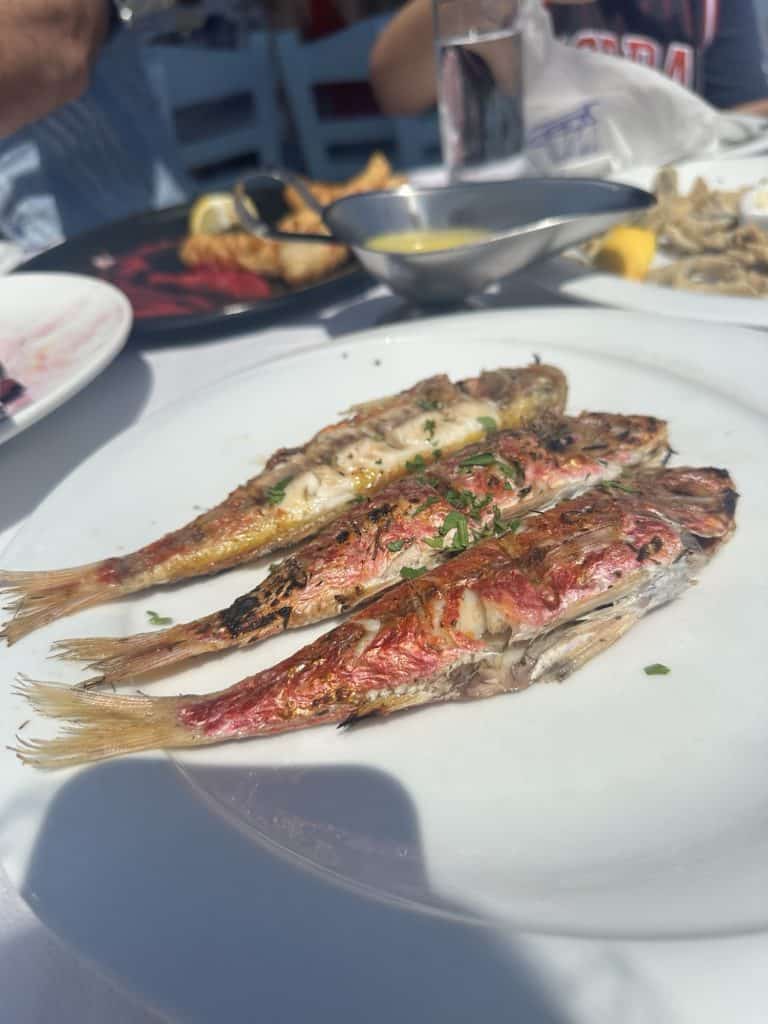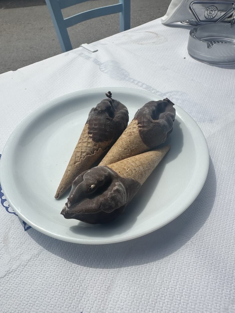 We ate lunch at a seafood taverna called Nostos, a recommendation we got from one of Stelis friends. I wanted to sit in the sun and the boys wanted the shade so we picked a table that was half and half. By the end of lunch I would be sweating and regretting my decision. We ordered a bottle of white wine which turned out to be the best wine I’ve had on the trip so far! To eat, we ordered a spread of seafood options to share: Bacalarios (fried cod), fried sardines (Leo’s request, but they are way too salty for my liking), beet salad, cheese balls, and grilled Mediterranean red fish. The red fish was delicious and came with a hollandaise type sauce. At the end of our meal they brought out 3 mini ice cream cones as a complimentary dessert, which was perfect considering how hot it was outside. We will definitely be coming back to this spot on our next trip.