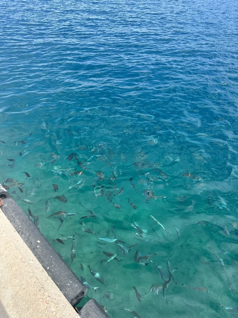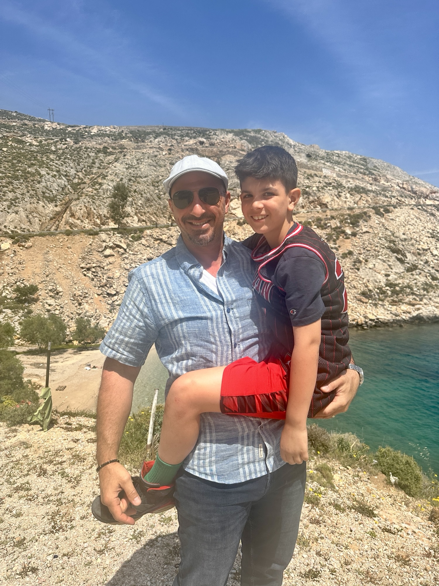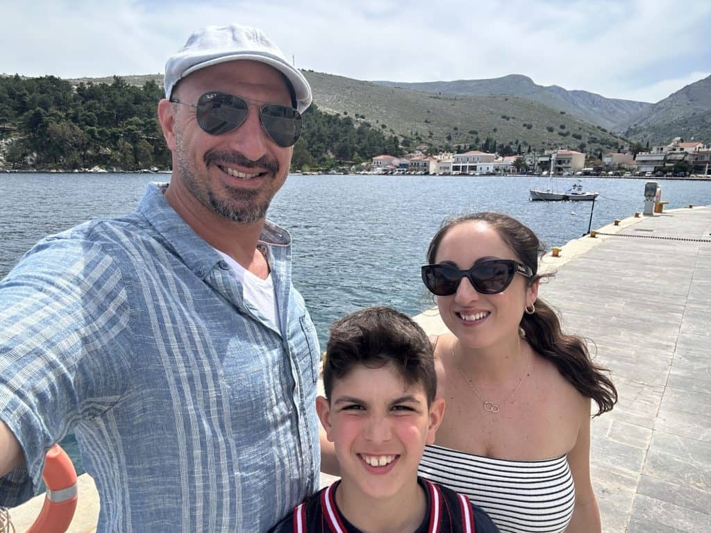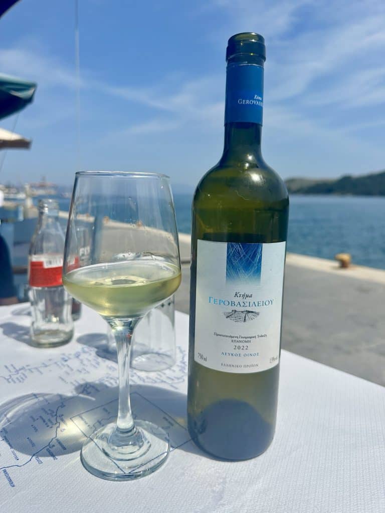 We ate lunch at a seafood taverna called Nostos, a recommendation we got from one of Stelis friends. I wanted to sit in the sun and the boys wanted the shade so we picked a table that was half and half. By the end of lunch I would be sweating and regretting my decision. We ordered a bottle of white wine which turned out to be the best wine I’ve had on the trip so far! To eat, we ordered a spread of seafood options to share: Bacalarios (fried cod), fried sardines (Leo’s request, but they are way too salty for my liking), beet salad, cheese balls, and grilled Mediterranean red fish. The red fish was delicious and came with a hollandaise type sauce. At the end of our meal they brought out 3 mini ice cream cones as a complimentary dessert, which was perfect considering how hot it was outside. We will definitely be coming back to this spot on our next trip.