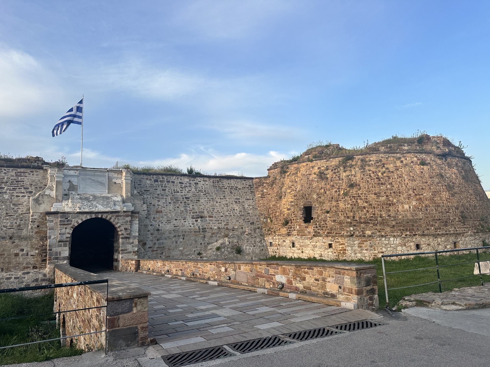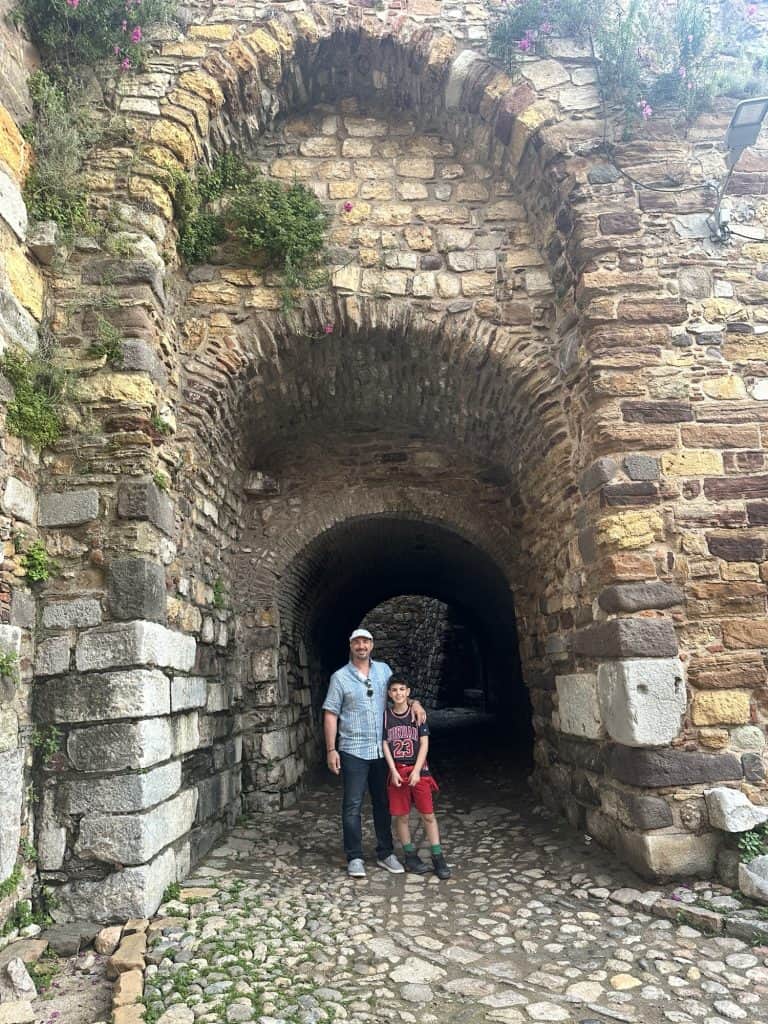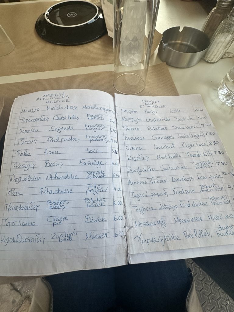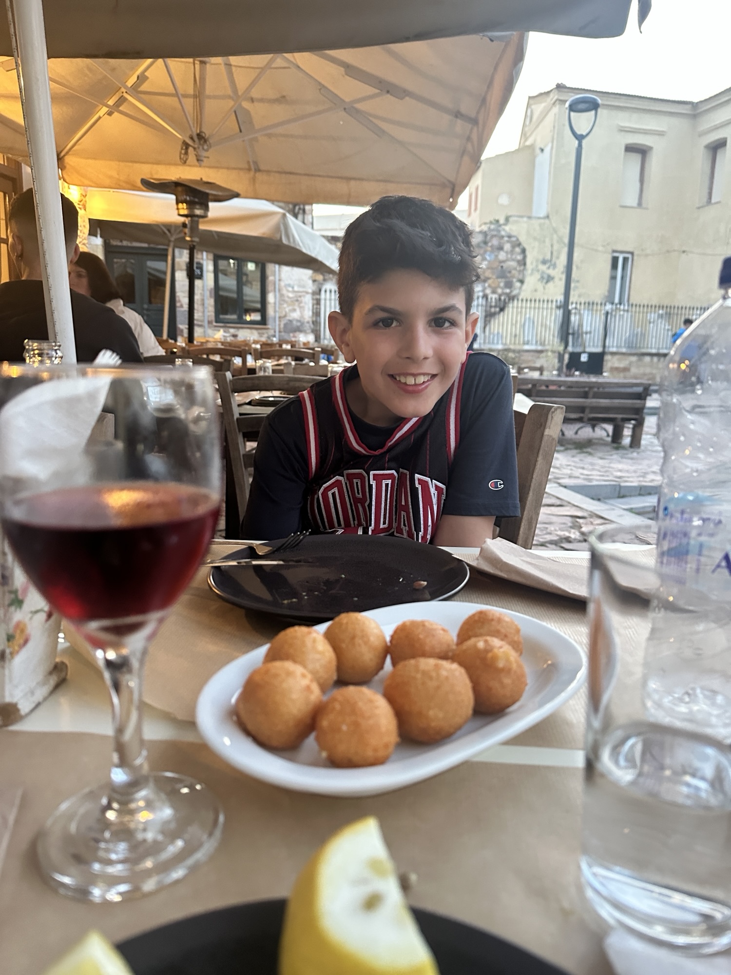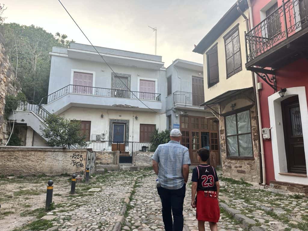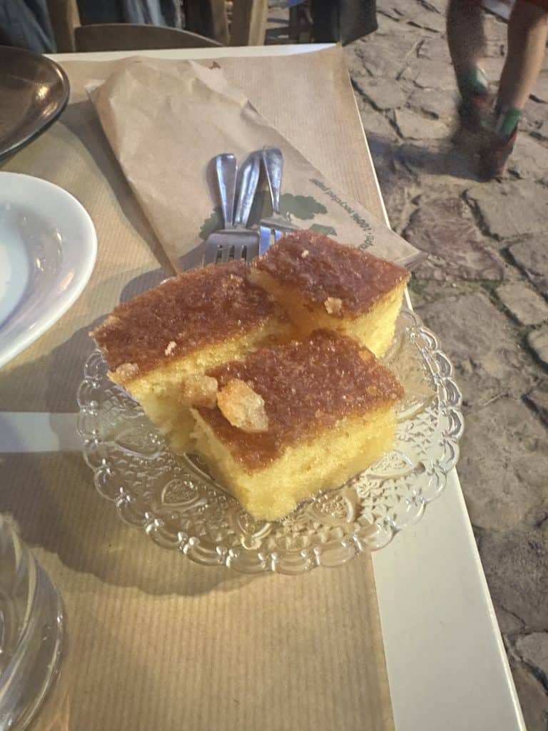 After lunch we drove by Karfas beach but there wasn’t much to see so we went back to the house to relax and Leo and Stelios played more basketball. Around 7pm we walked down to Chora to explore the inside of Chios castle. It’s interesting that some of the backyards of the houses open up to inside of the castle. If you follow the pathway there is a courtyard with restaurants in the middle. We sat at Kaefnes, a small plates restaurant that had a handwritten menu in a notebook. We ordered 2 glasses of wine, dolmades, cheese balls, and saganaki. When we asked for the check they brought over complimentary orange cake. Today has been the day of free desserts and I am loving it.