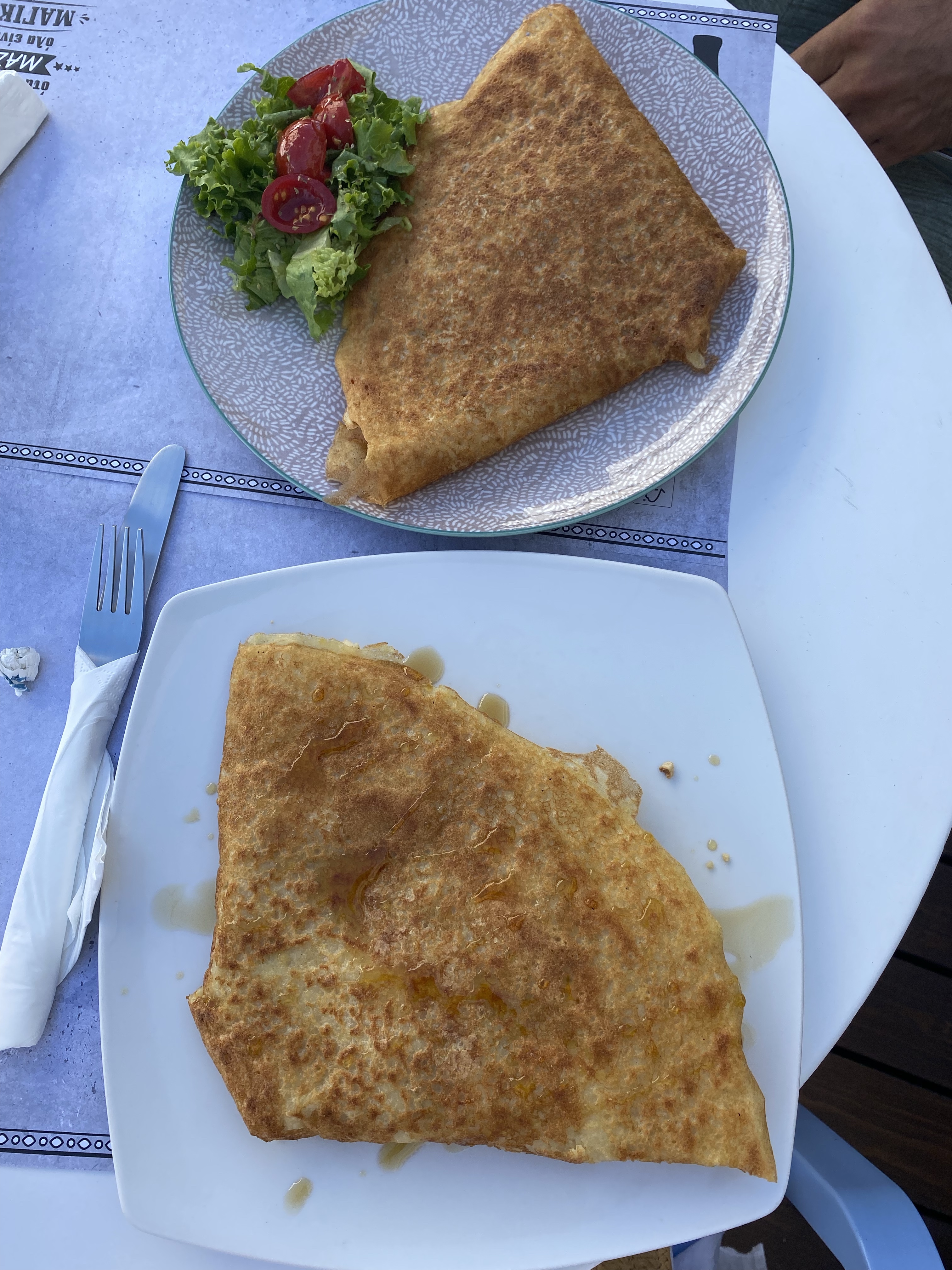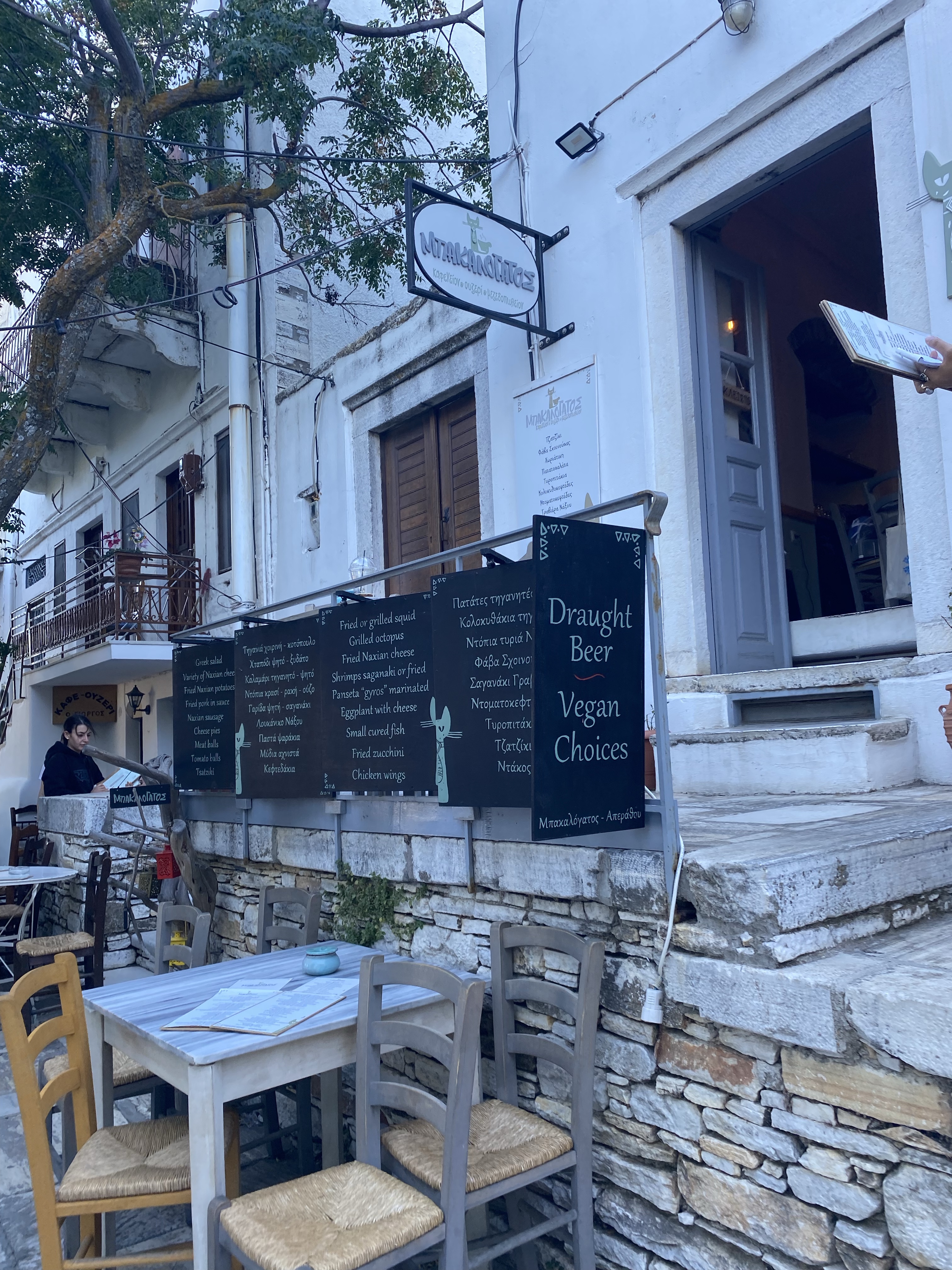We started our day at 9am & walked to Chcoolat Creperie – a creperie that offers regular crepes and vegan crepe options. I’m not vegan, but I am dairy free, so I appreciate the vegan lifestyle, especially when restaurants have vegan cheese options. We ordered 1 savory crepe (bacon, mushroom, tomato & vegan cheese) and 1 sweet crepe (banana, apple & walnuts, drizzled with maple syrup). The crepe itself was also vegan & gluten free and the savory one was the best crepe I’ve ever had in my life. For my vegan friends – the trip to Naxos for this crepe is worth the journey. And like I mentioned in my last post I’m noticing a LOT of vegan option restaurants in Naxos compared to Paros.
