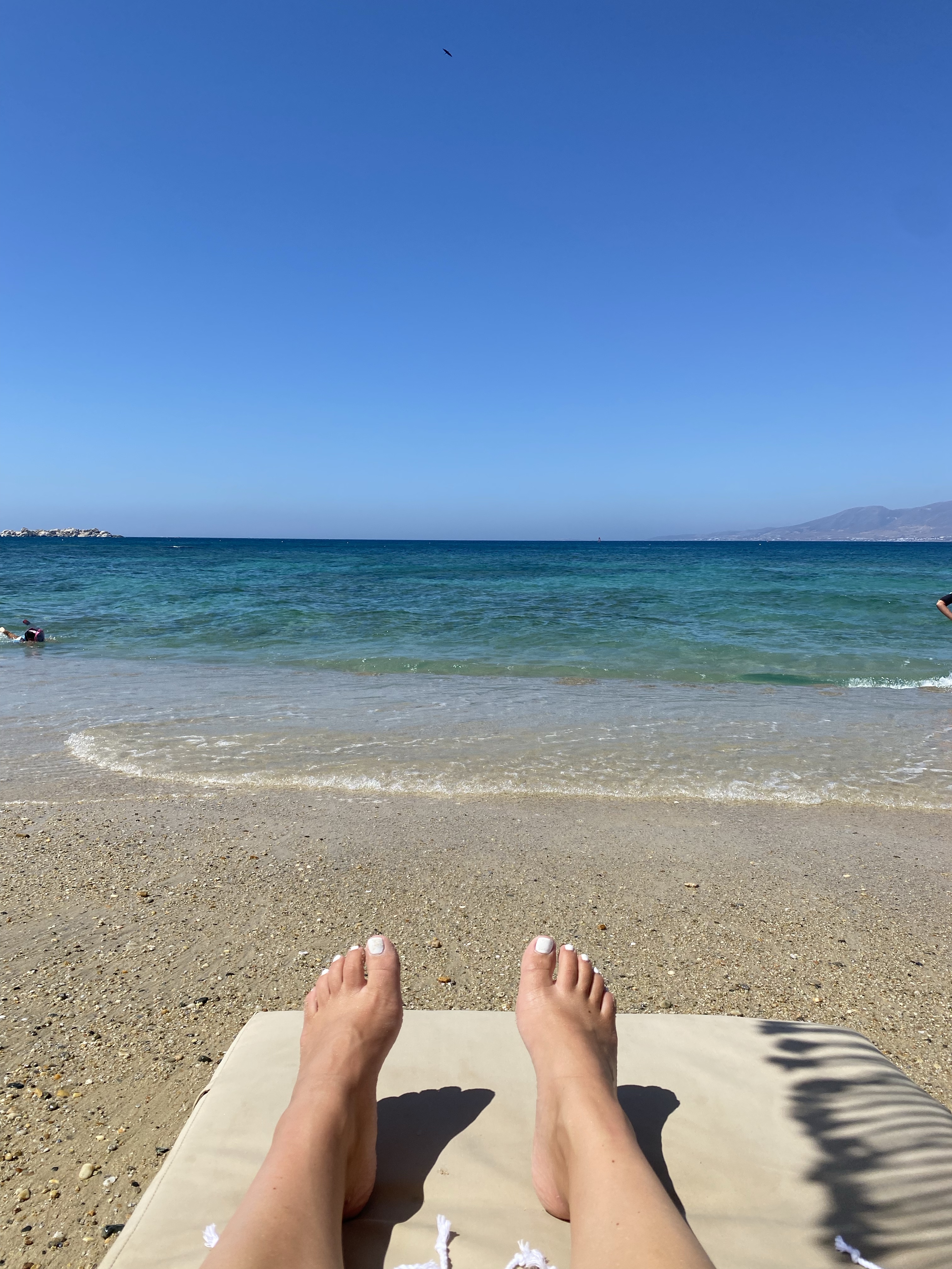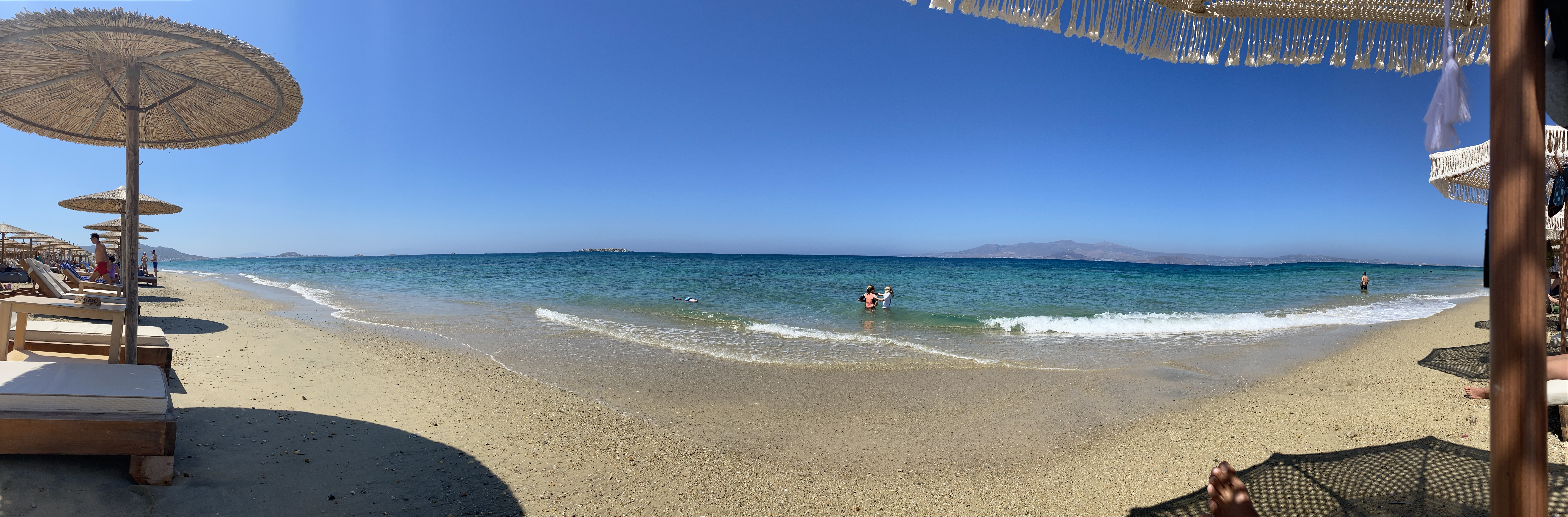 After breakfast we took the motorbike down to Yazoo Beach Bar at Plaka beach. Plaka is rated one of the best beaches in Greece – the water is bright clear blue and you can see the mountains of Paros in the background which reminded me of the beach view at Lanikai in Hawaii. Yazoo Beach Bar was sold out in terms of lounge chairs so we just went to the guy next door (the chairs looked equally as comfy and they had better umbrellas). The different umbrellas are basically how you tell it’s a “different beach bar” even though it’s literally the same beach and same view. The only difference is the food you can order for beach service. So we were still at Plaka Beach just at Souvlucky instead of Yazoo. The chair didn’t cost anything we just had to spend at least 40 euro on food/drinks which was easily do-able so we snagged a front row seat. Again it just goes to show that Naxos is more budget friendly because in Paros you had to spend 40 euro just to rent the chair and any food/drink you ordered was added to the bill.