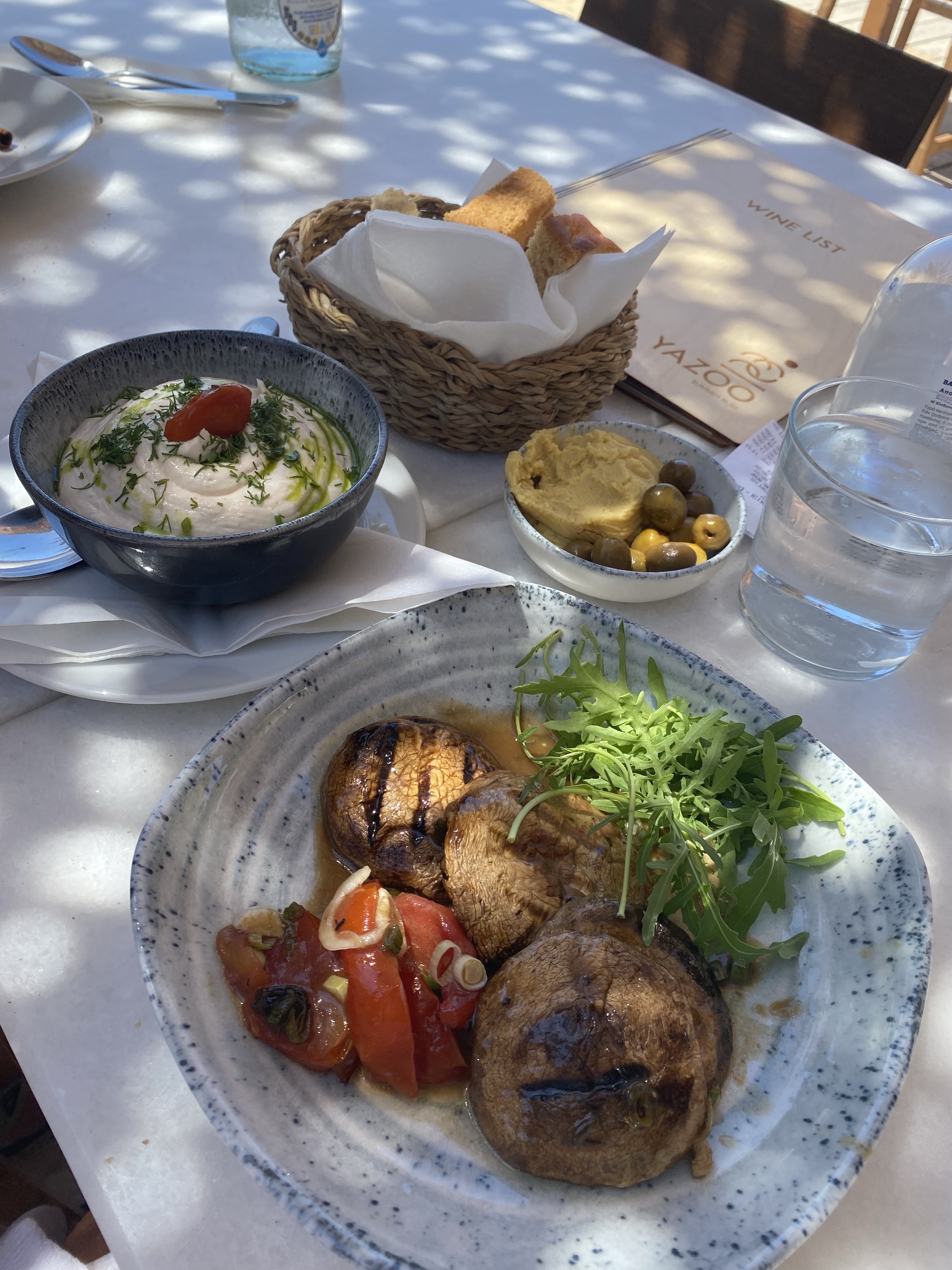 Around 1pm we left our towels on the chairs and walked up to lunch at Yazoo Summer Bliss beach bar. I finally got the amazing fresh salad I had been craving since yesterday. It was a grape salad with shaved Naxian Gruyère cheese, crushed nuts, and honey vinaigrette on top which made it extra delicious. We also ordered the Fish roe spread and Portabella mushrooms. Overall a healthy lunch but oh so delicious. The produce in Greece is incomparable to anything that you order in the states — I mean who knew a salad & grilled vegetables could be THIS GOOD?!