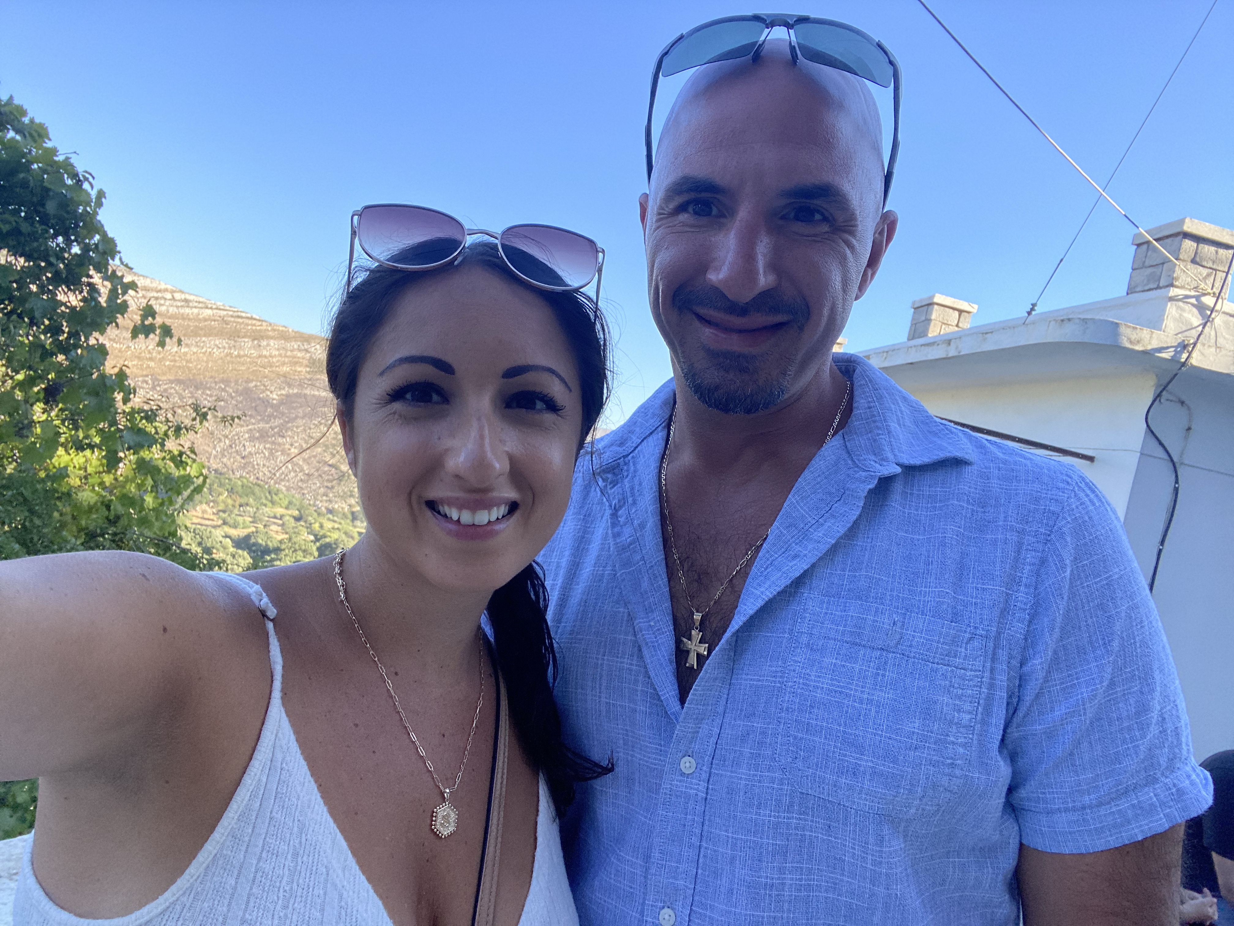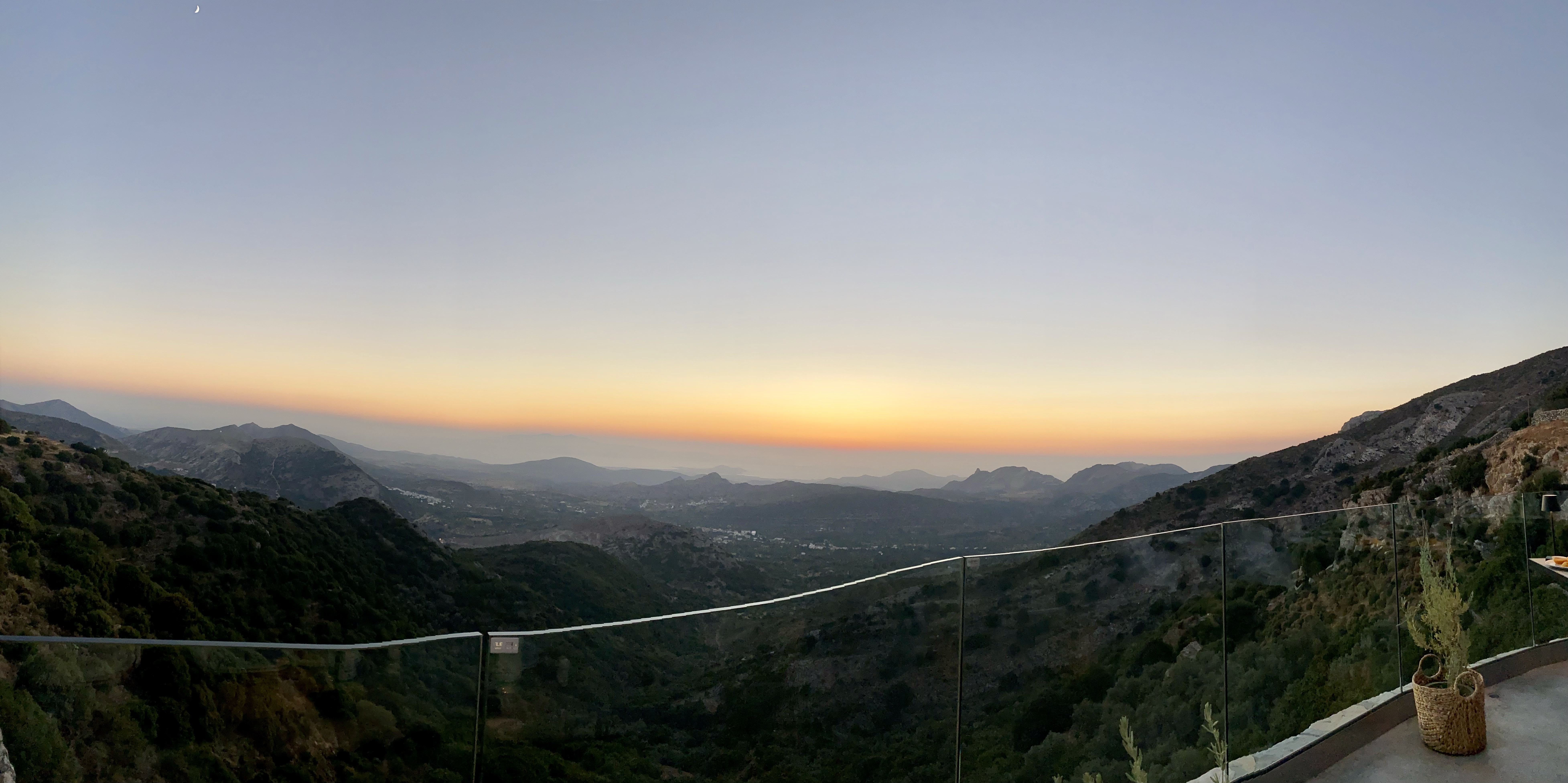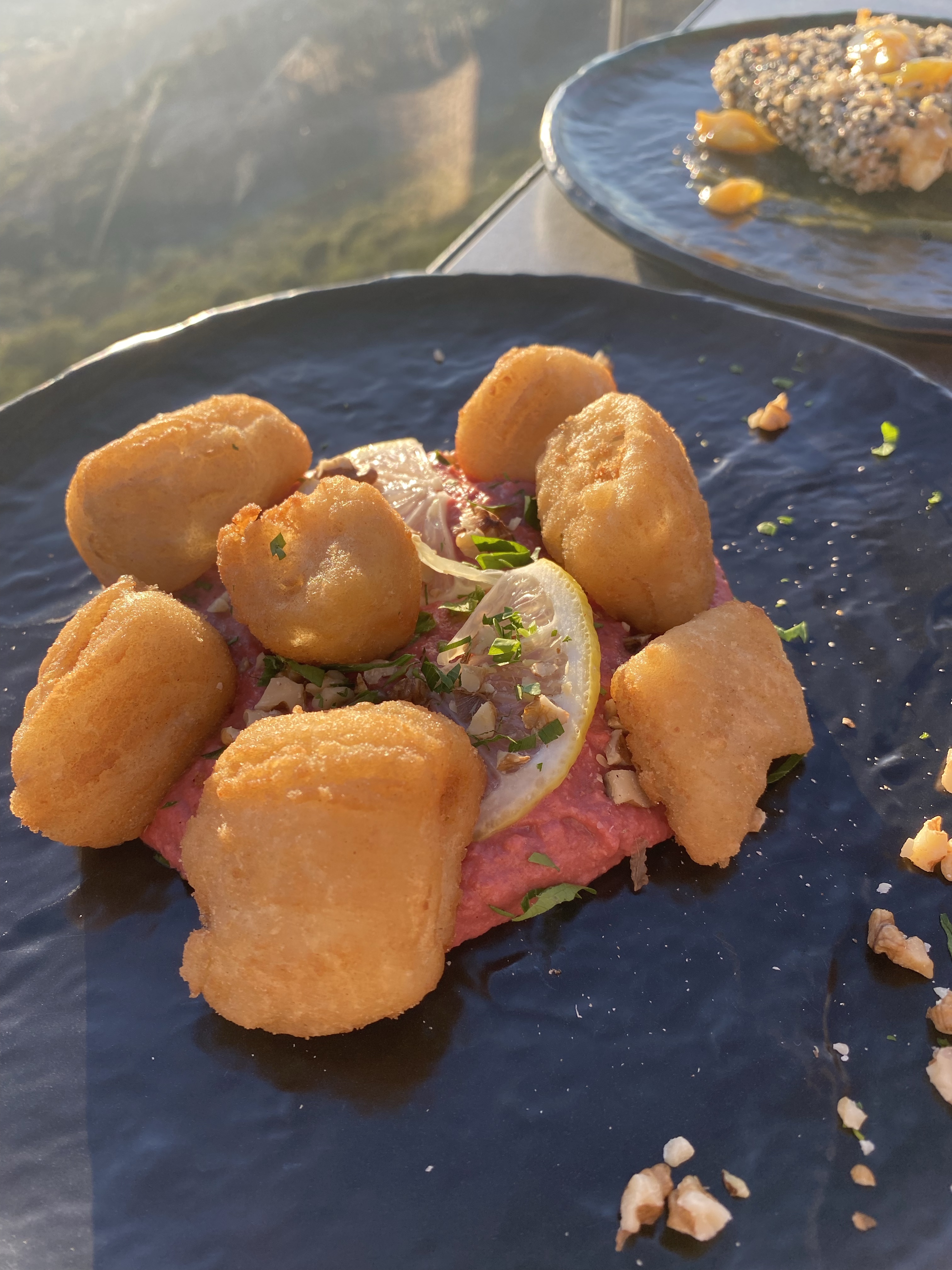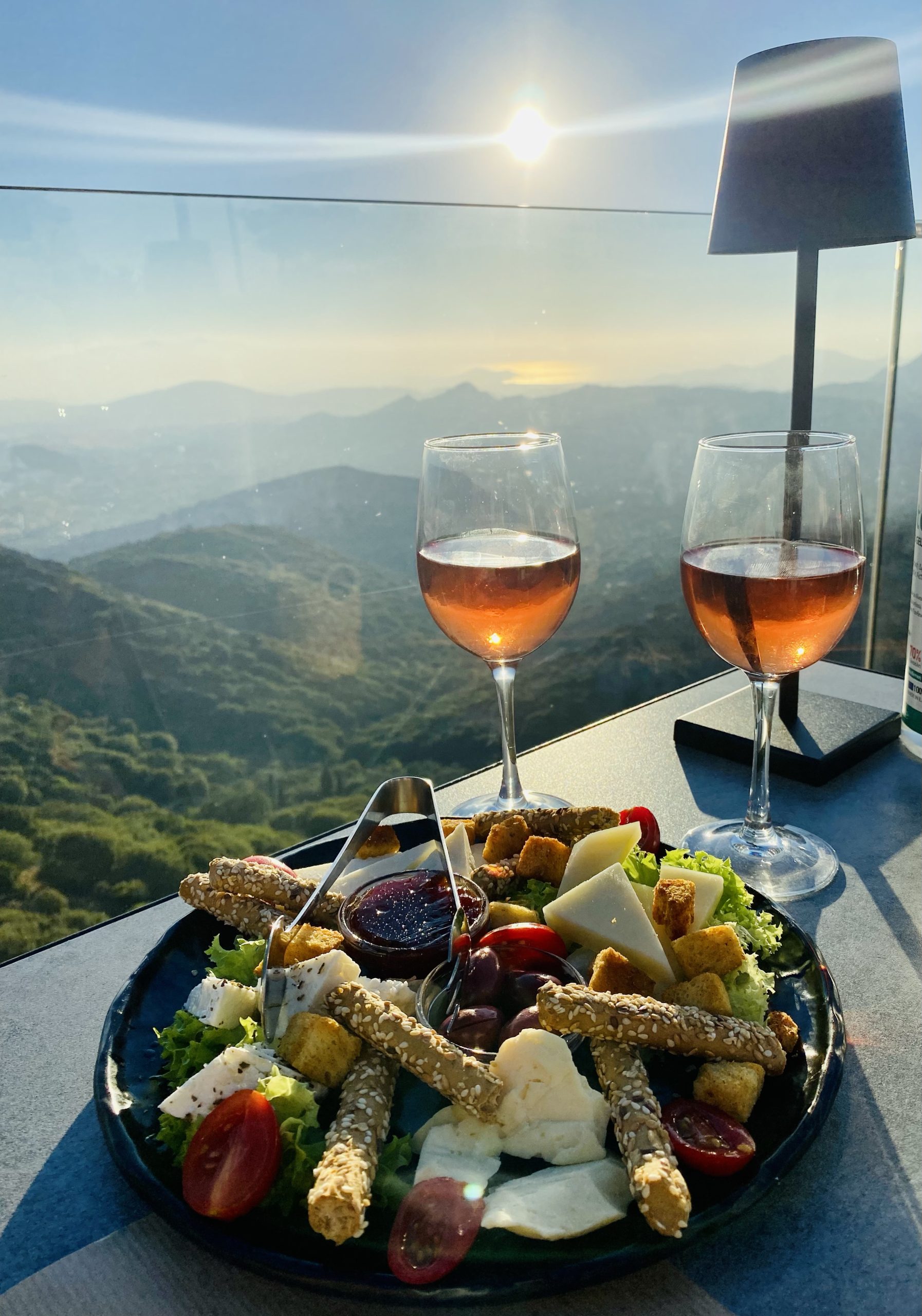 Our dinner reservations tonight were earlier than usual at 7pm because we wanted to get a good seat for the sunset. The restaurant was called Rotunda and it was a 5 minute bike ride from the Chora of Aperianthos. The restaurant was nestled into the side of the mountain with a clear glass half walls lining the perimeter. Upon arrival they were very busy and it looked like we were going to get a 4th or 5th row table, but to our surprise that was just the outdoor bar area for drinks and there was a whole other side for dining. The hostess sat us right at the front row table by the glass for optimal breathtaking sunset views. We were ecstatic to have this seat.We enjoyed Carafes of Rosé, a Naxian cheese plate that consisted of cow Naxian Gruyère cheese, Ksinomizithra , Feta, & Goat Gruyère, fresh jam, bread sticks, and olives. The small cheese plate is MORE than enough for two people, I can’t even imagine how big the large is. We also got Saganaki covered in oats & black sesame with orange confit, and flavored with Ouzo. Stelios said it was the best Saganaki he’s ever had because it’s normally not prepared that way. And last were the Cod Fish Croquettes over beet root (they were ok). So we sat back, enjoyed our meal, and took in the beautiful view of the mountains down to the valley, beach, and the ocean, with a remarkable sunset casting over it — it was truly remarkable. At the end of our meal we received 2 Dessert shots on the house (a mix of Raki, cinnamon, honey, and clove). This entire amazing experience (dinner & a view) was all for only 46 euro. And we got to enjoy the afterglow sunset for another hour – which to be honest is my favorite part.