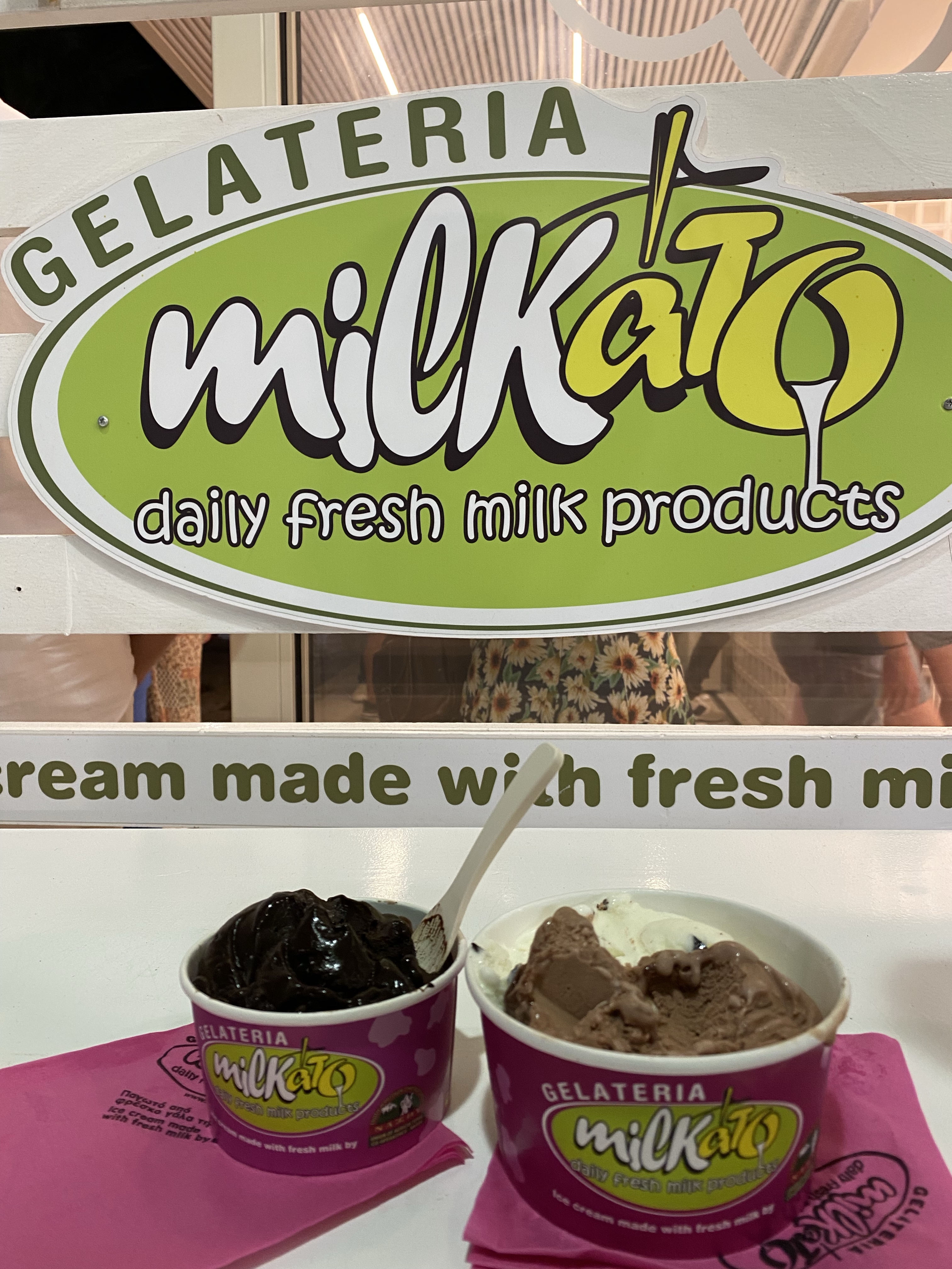 Once we got back to the Chora (downtown) Naxos we parked the bike and stopped for gelato at Milkato. Our Airbnb host recommended this gelateria over others, plus they had dairy free options. I got the dark chocolate sorbet (dairy free), it was thick & creamy, and a decadent rich deep chocolate flavor. Stelios got Stratiachella and Ferraro Rochet gelato which he said was delicious. After enjoying our late night dessert & people watching we called it a night around mindnight, since we had an early day planned tomorrow.
