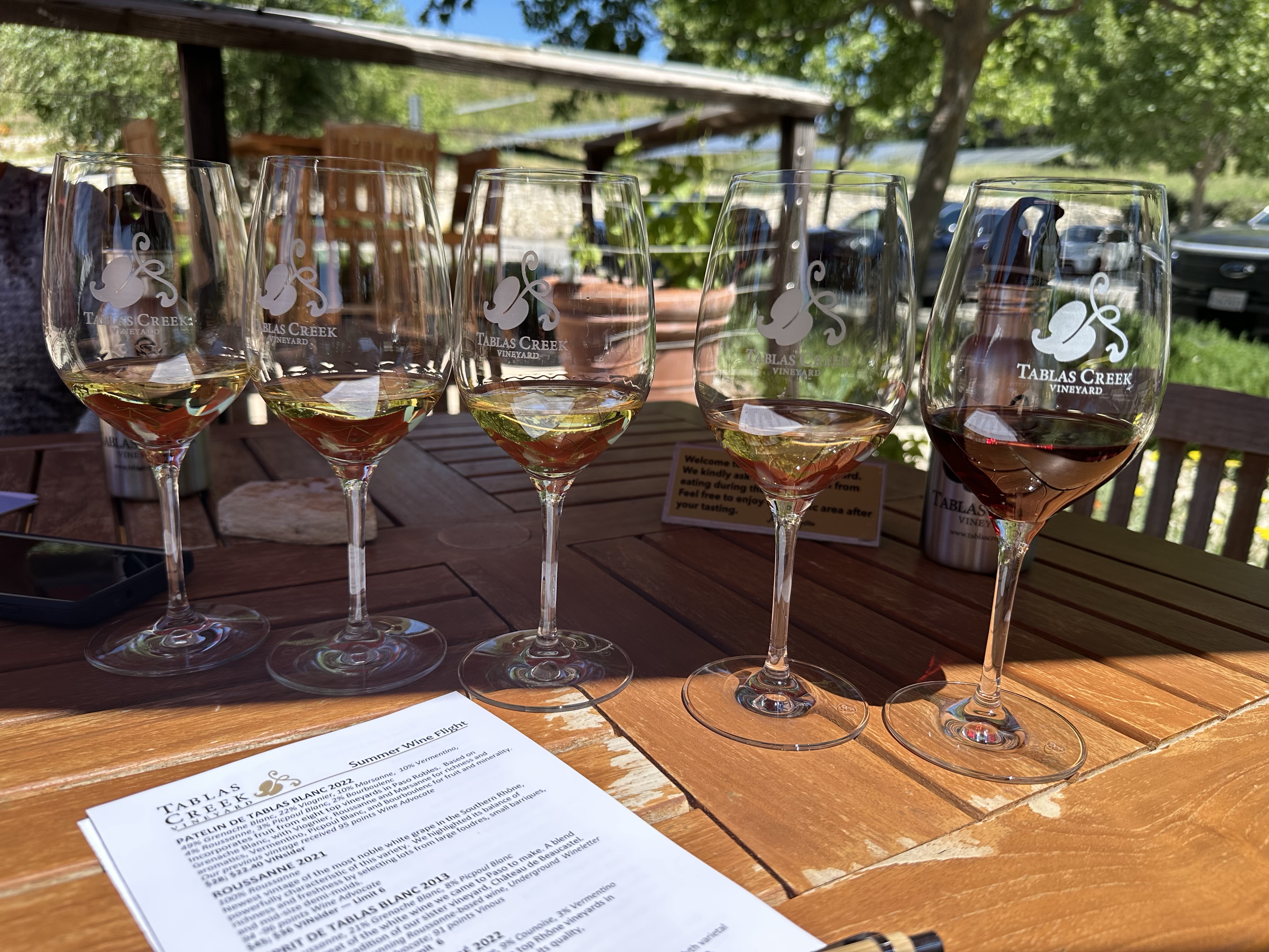 Our first stop was Tablas Creek, a winery that my client Julie had recommended. We ordered their estate flight and summer flight to share. Our sommelier was also very knowledgeable and told us the history of the winery as she poured us wine. I learned that Tablas is the pioneer for California’s Rhône movement because of the partnership between the Haas family and the Perrin family (from France). I also learned that Tablas Creek is a dry farm because there’s no additional irrigation needed, due to the fact that a lot of the property has natural limestone everywhere which helps retain water so that the vines can absorb water during the dryer months. I also learned about two new grapes/types of wine that I’ve never had before – Mourvèdre and Tannat. Tablas Creek was actually responsible for introducing Tannat (a grape varietal) to the US. When they sent the grapes over from France, the man packing them thought it would grow well here – and it turns out that Tannat is one of the easiest grape varietals to grow in Paso.