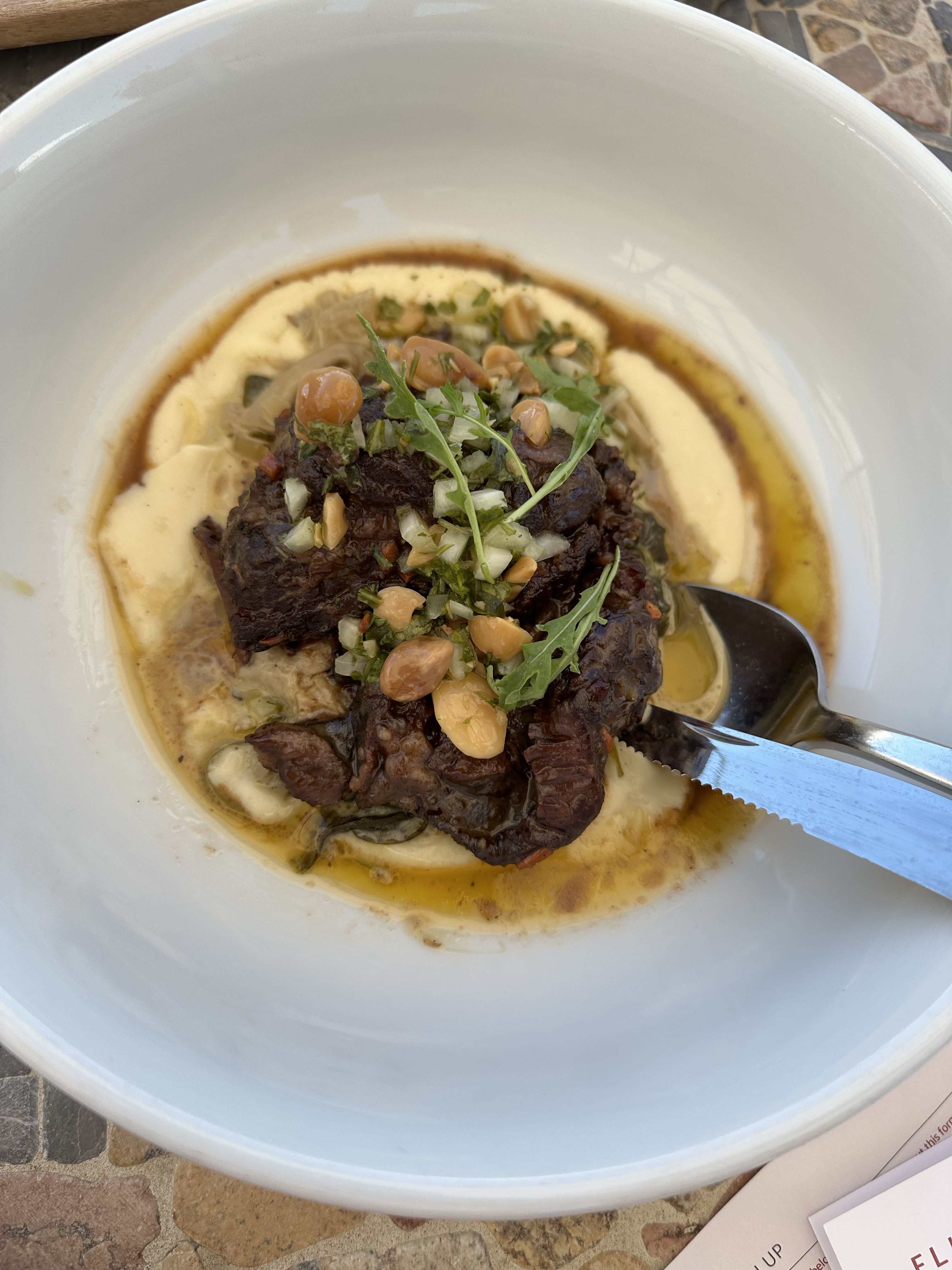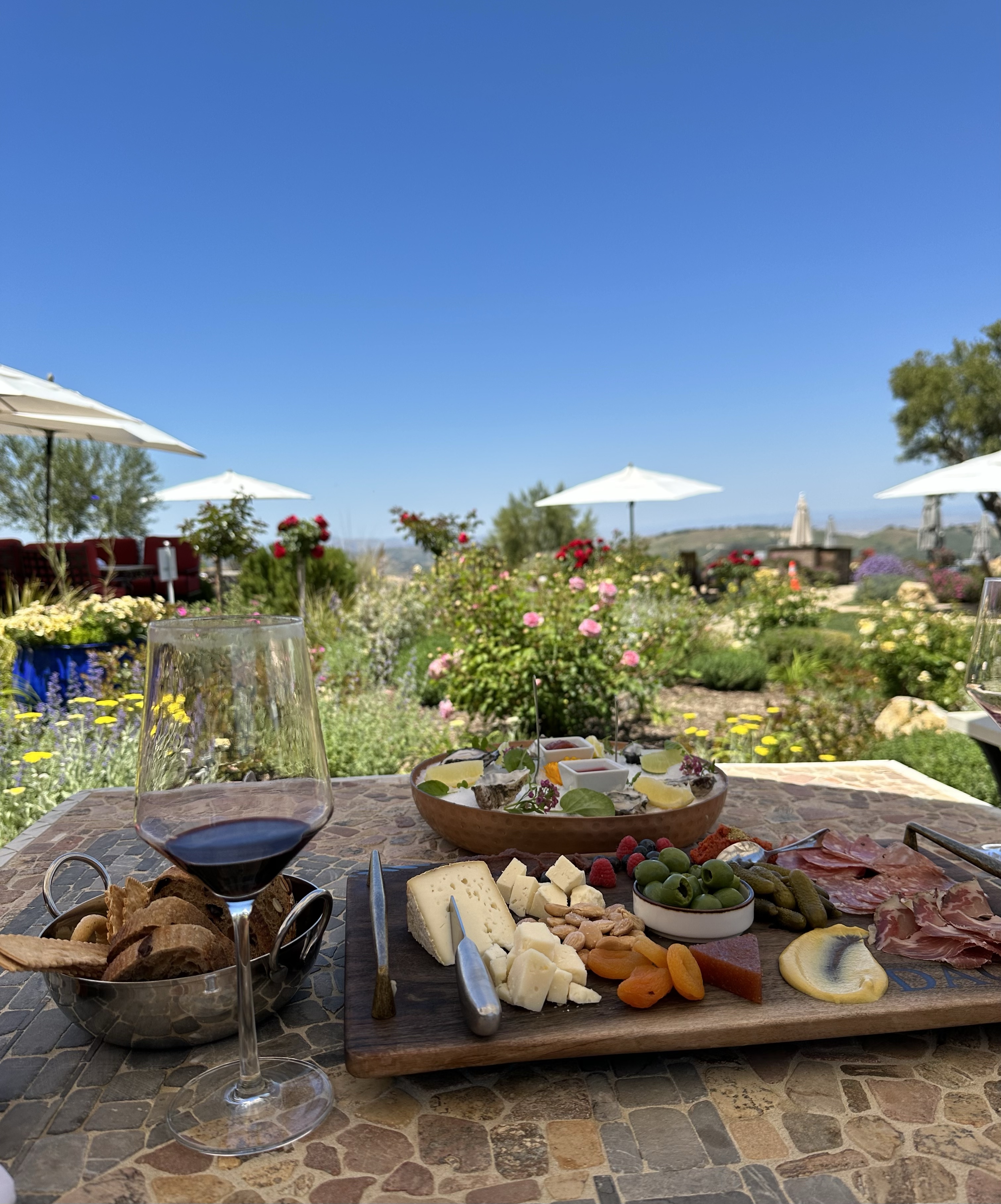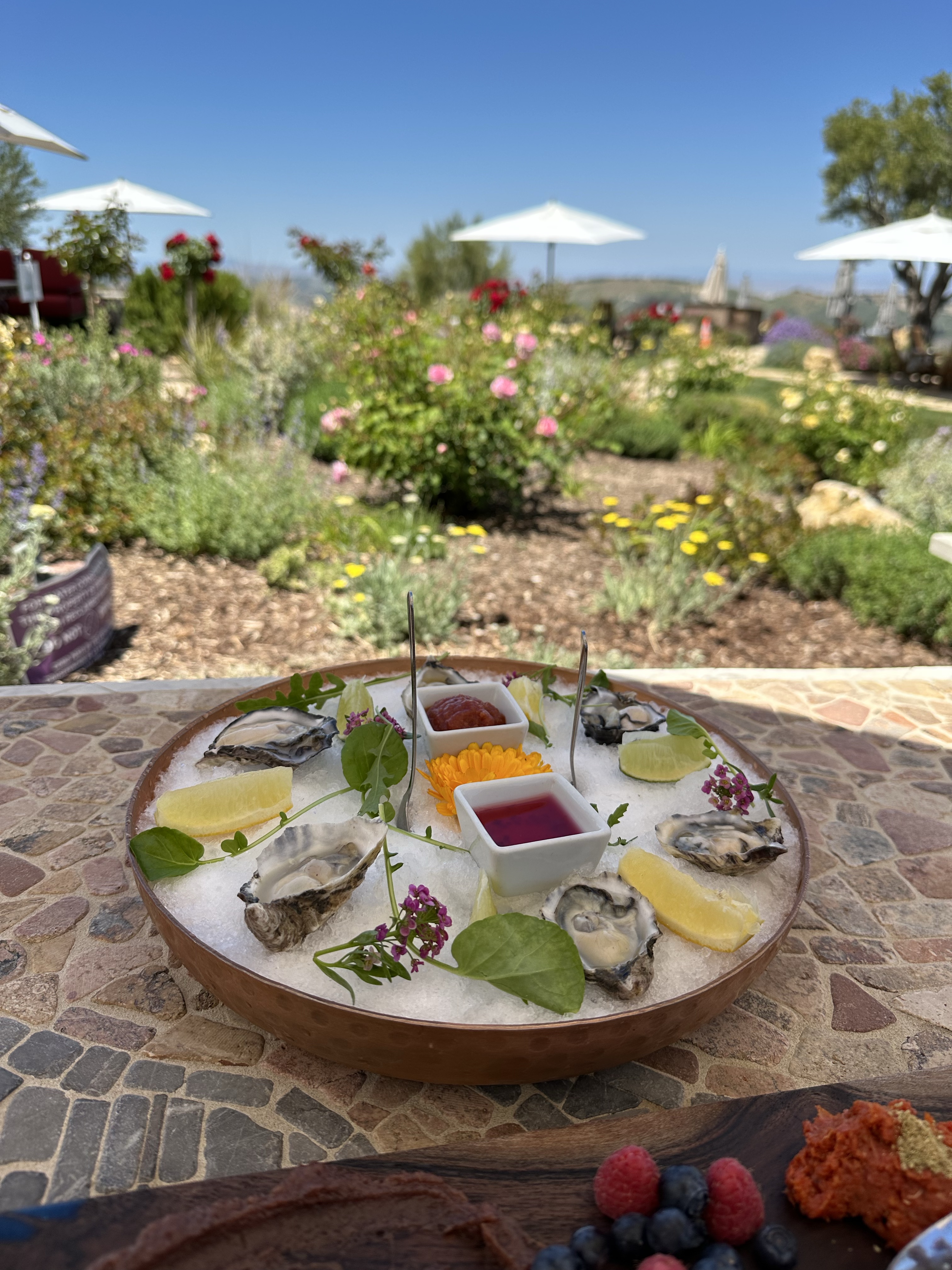 Daou is one of the few wineries in Paso with a full restaurant menu available on a weekday so we ordered our 2 flights of wine with some lunch. To start we had a meat & charcuterie board (both the freshness and the presentation blew away the one we had yesterday at Austin Hope) and 1/2 dozen oysters from Morro Bay that came with cocktail sauce and a passion fruit mignionette. Our server even brought us a complimentary round of Chardonnay to pair with the oysters & he recommended to take a sip of wine, then the oyster with the mignonette, then a swig of Chardonnay to follow. It’s truly incredible how pairing food with wine can really bring out different flavors in a meal. For our entree we shared beef cheeks (something I’ve never heard of or had before) but it melted in my mouth and paired perfectly with the Cabernet I was sipping on.