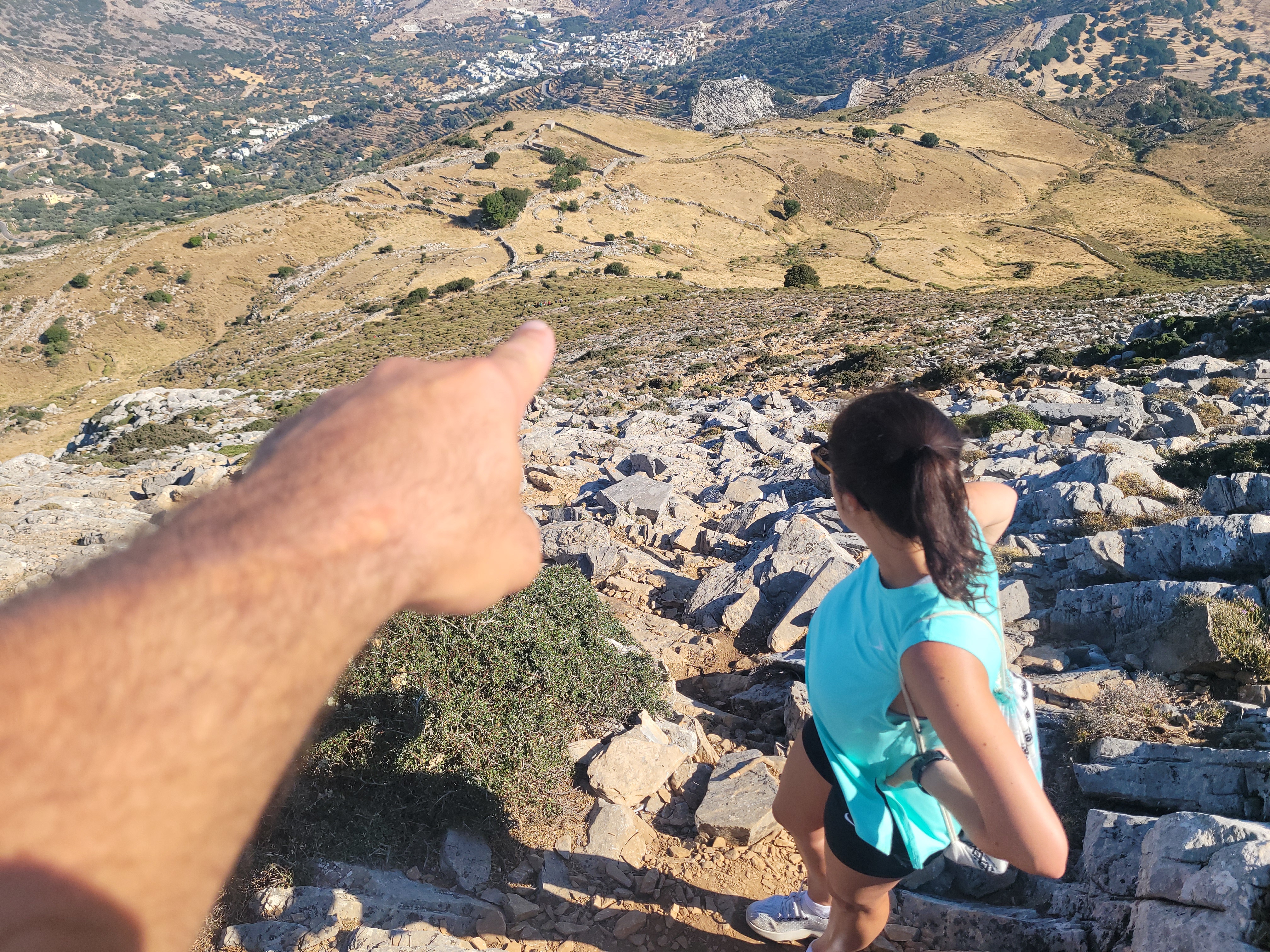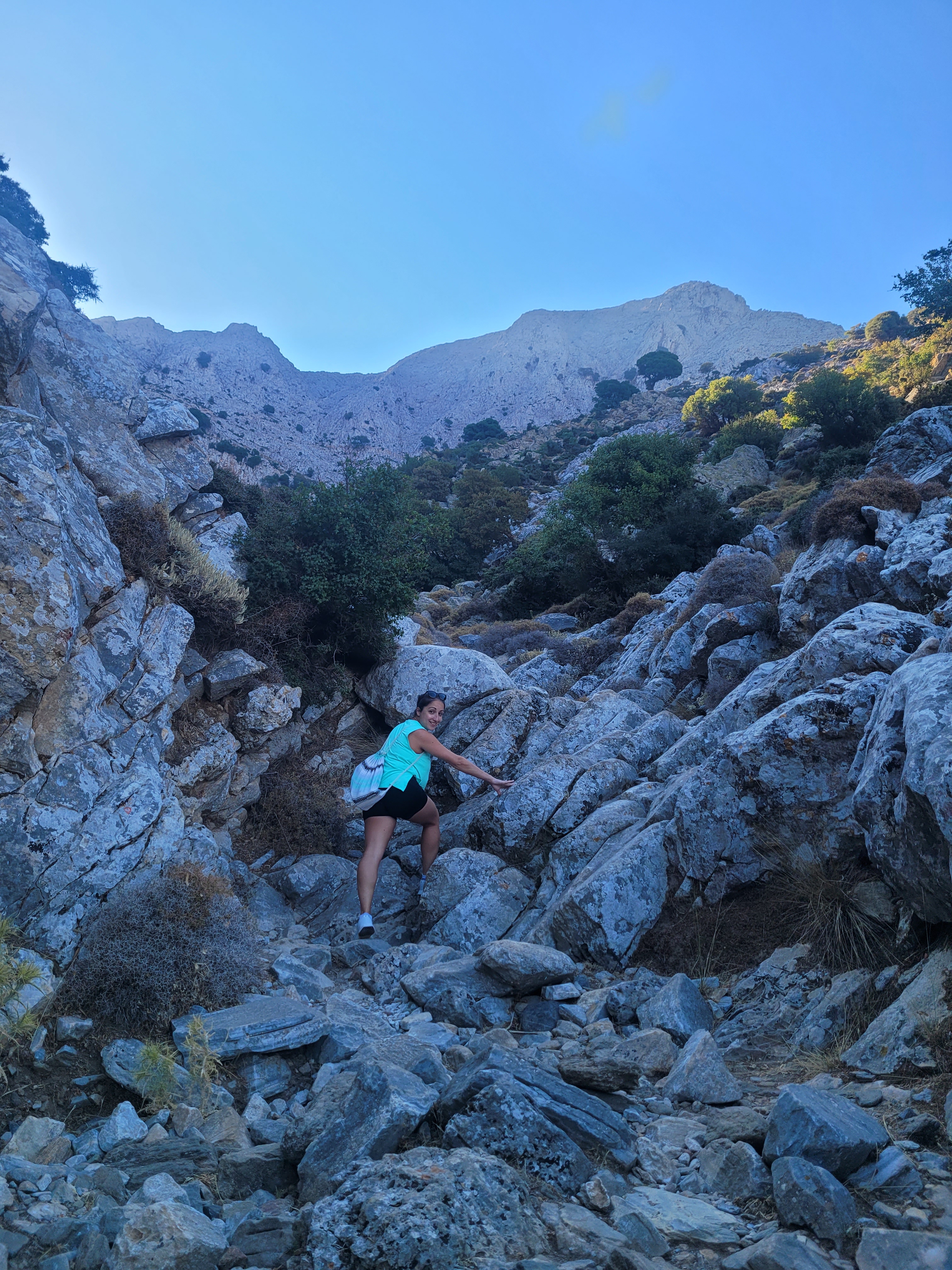 Now it was time for the trek down. Going down any hike is always more difficult for me than going up. I don’t know why, but I just have better balance going up and feel more inclined to slip or stumble over my own feet when going down, especially on a steep trail. We started back down the mountain and within 10 minutes I told Stelios this was a much easier path than the one we came up. You didn’t have to climb up boulders, it was more of a stone pathway. We realized we were going down the wrong way. Stelios pulled up the map on his phone and we realized the trail we were on lead to a different starting point, far from where our bike was parked. So we traced our steps back a bit and walked across the mountain to the side with the boulders and got back on the trail to the Cave of Zeus. In total it was about a 20 minute detour. Now it was time to climb down all of the rocks and boulders we previously climbed up. On the way down I stepped on a loose boulder, it rolled out from under me, and I almost slipped. It was terrifying. I could’ve gotten seriously injured but Zeus & the Greek gods must’ve been looking out for me today because I caught my balance. I slightly hurt my ankle and Stelios could see that I was in pain, but I shook it off and ignored it and told him let’s keep going – I was in survival mode. I HAD TO GET TO THE BOTTOM AND GET THE FUCK OFF THIS MOUNTAIN. It took us 2 hours to reach the bottom. Stelios had to hold my hand for balance going down a lot of the trickier rocks and boulders. My ankle felt unstable & I couldn’t always reach the next rock on my own#ShortGirlProblems. When we finally reached the bottom I don’t know what came over me but I literally screamed out loud “THANK YOU LORD OUR SAVIOR!” Stelios laughed. I was so relieved to have reached the bottom, because there were moments that I wasn’t sure if I’d make it.