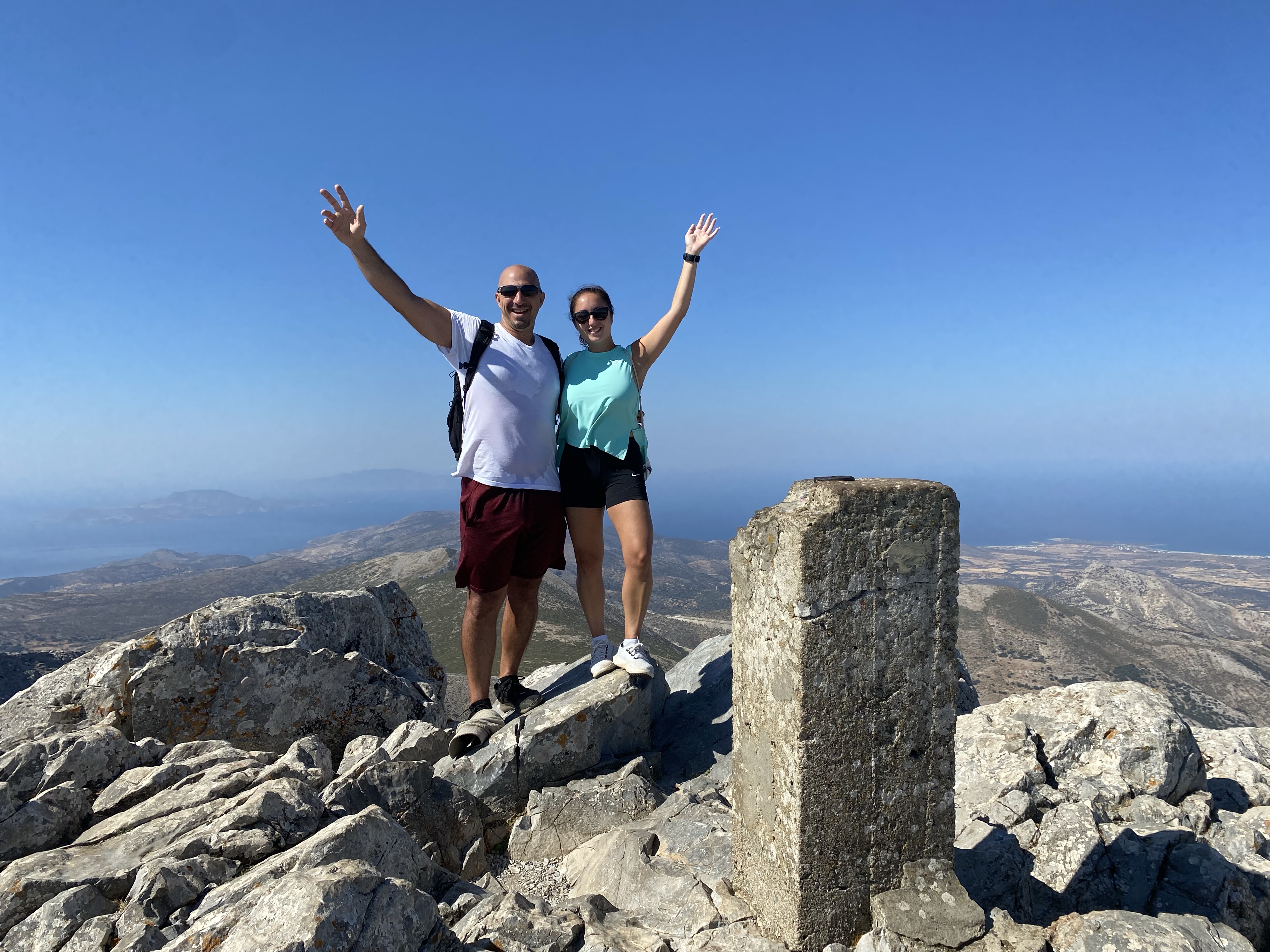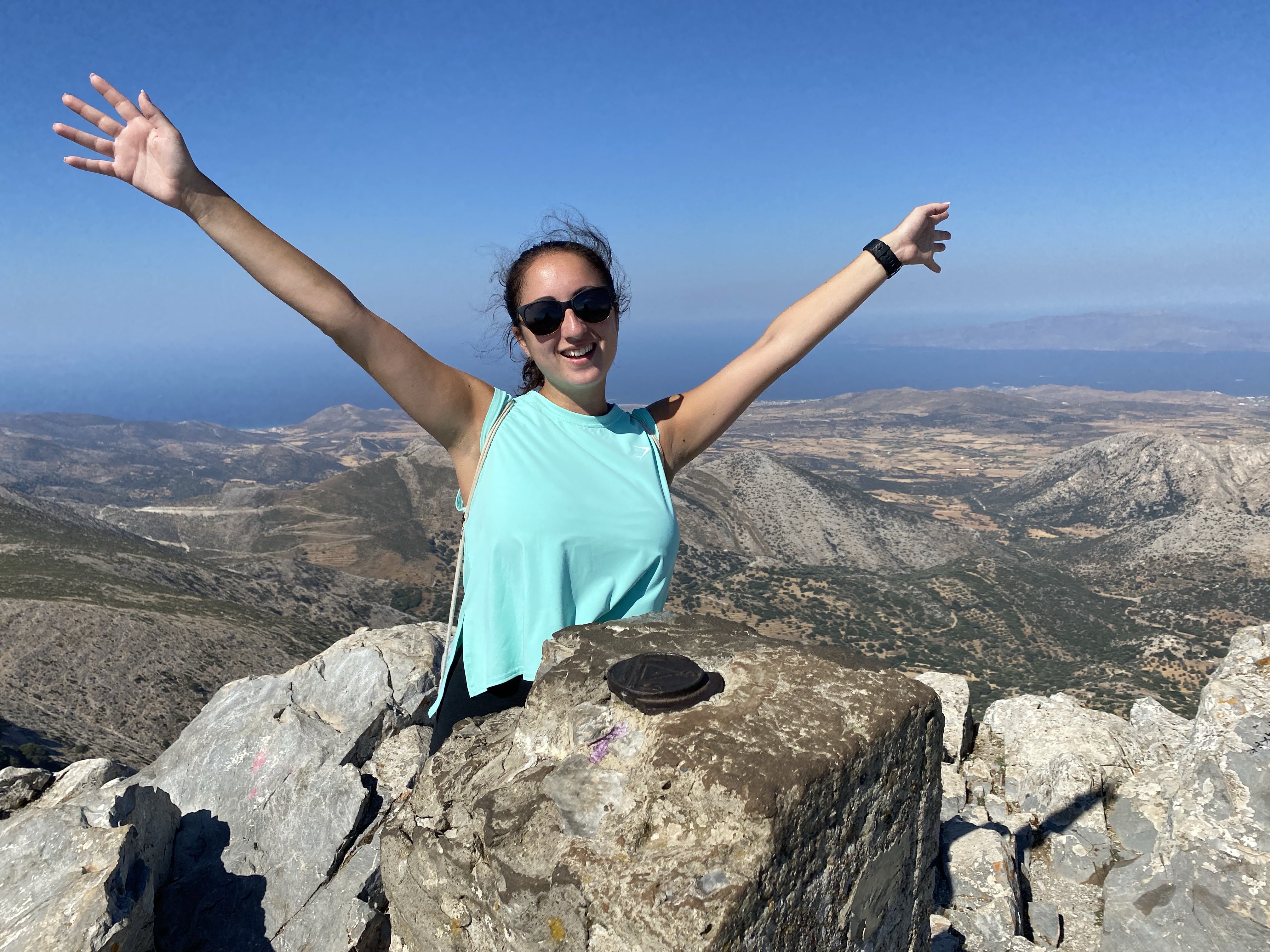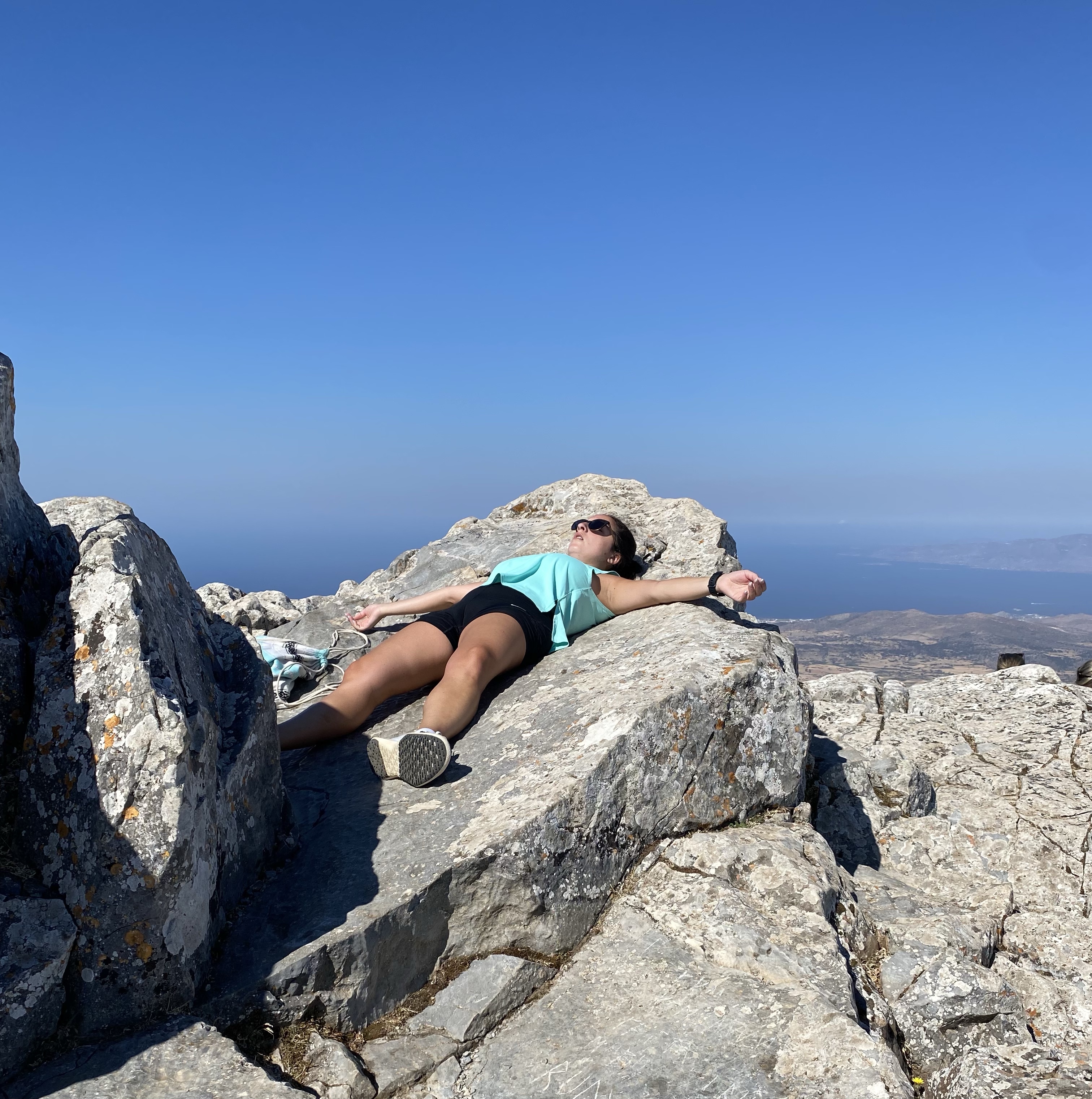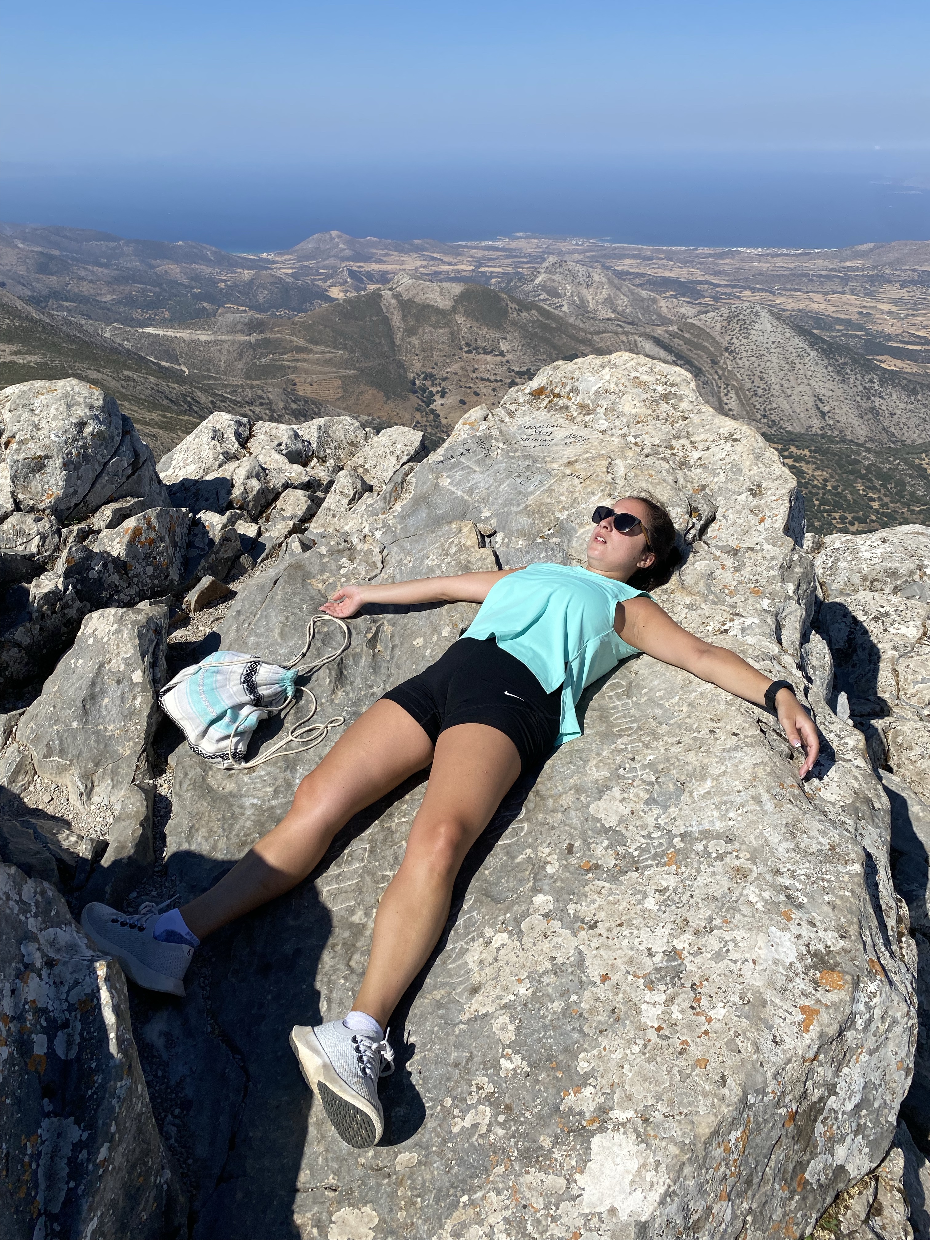 We FINALLY got to the top after 1.5 hours (to me it felt like 3) that includes stopping for 15-20 min to explore the cave of Zeus & stopping for water breaks. Once we reached the top I sprawled out and flopped on one of the flatter rocks to catch my breath and reflect on what just happened.