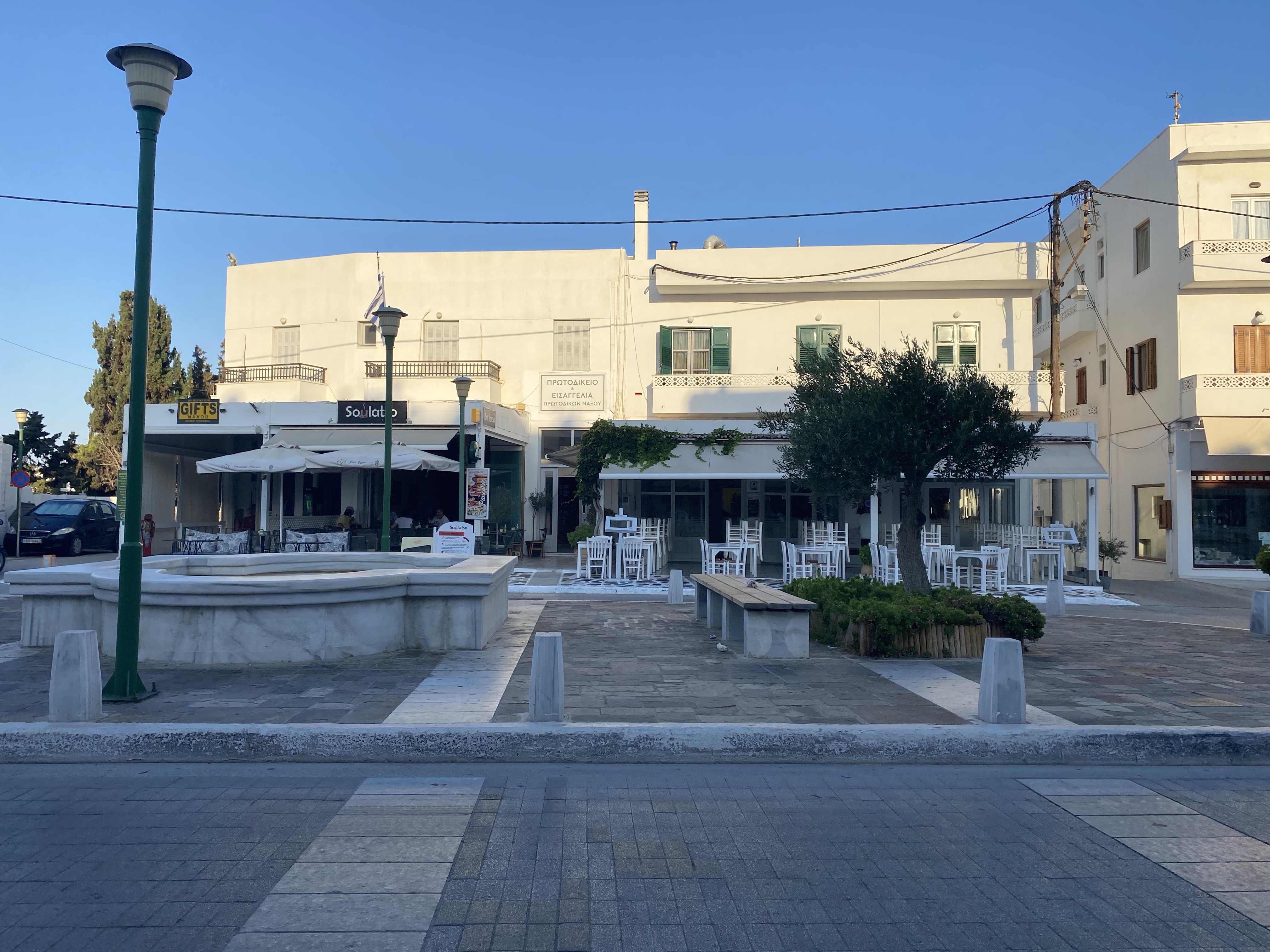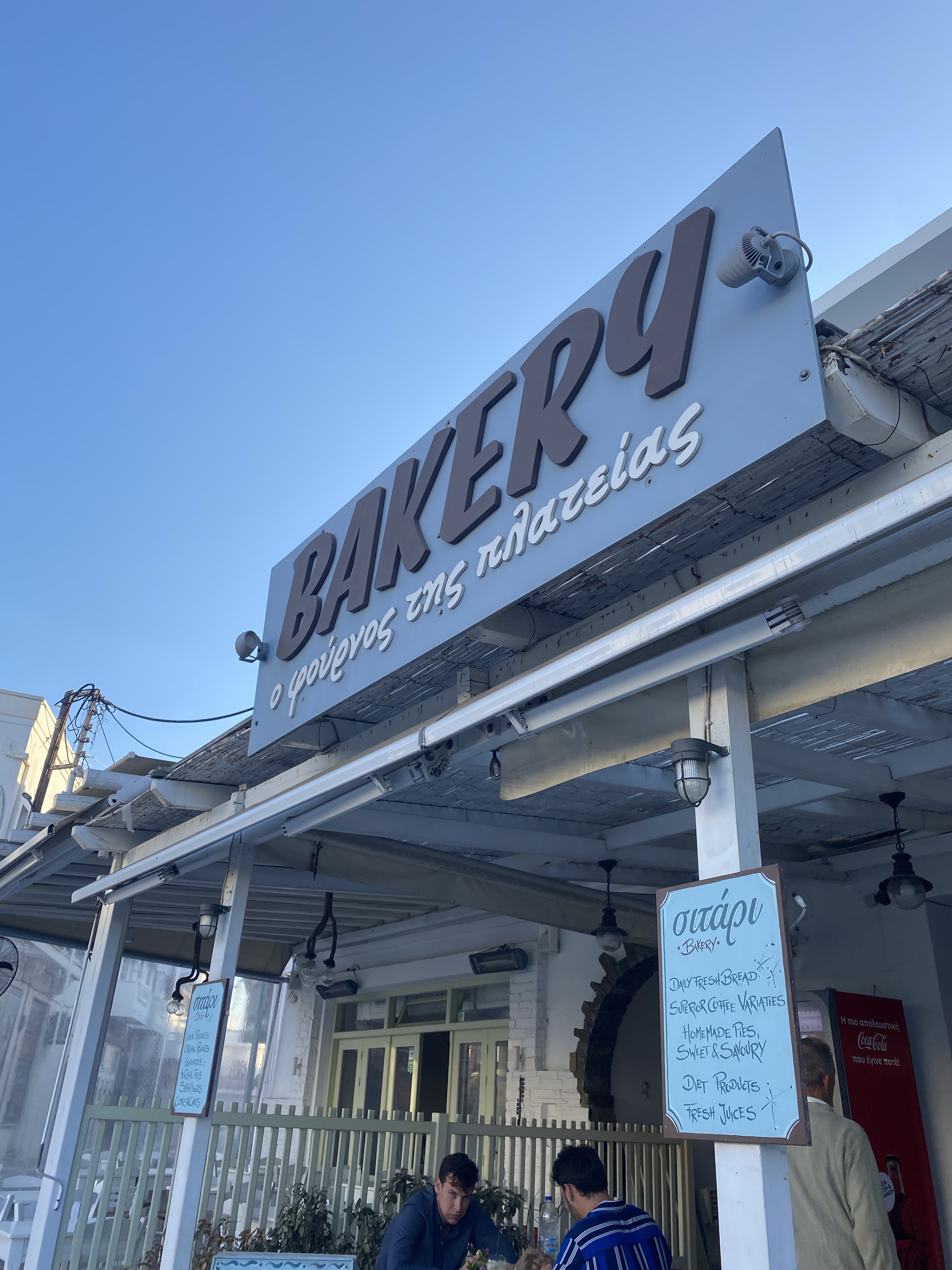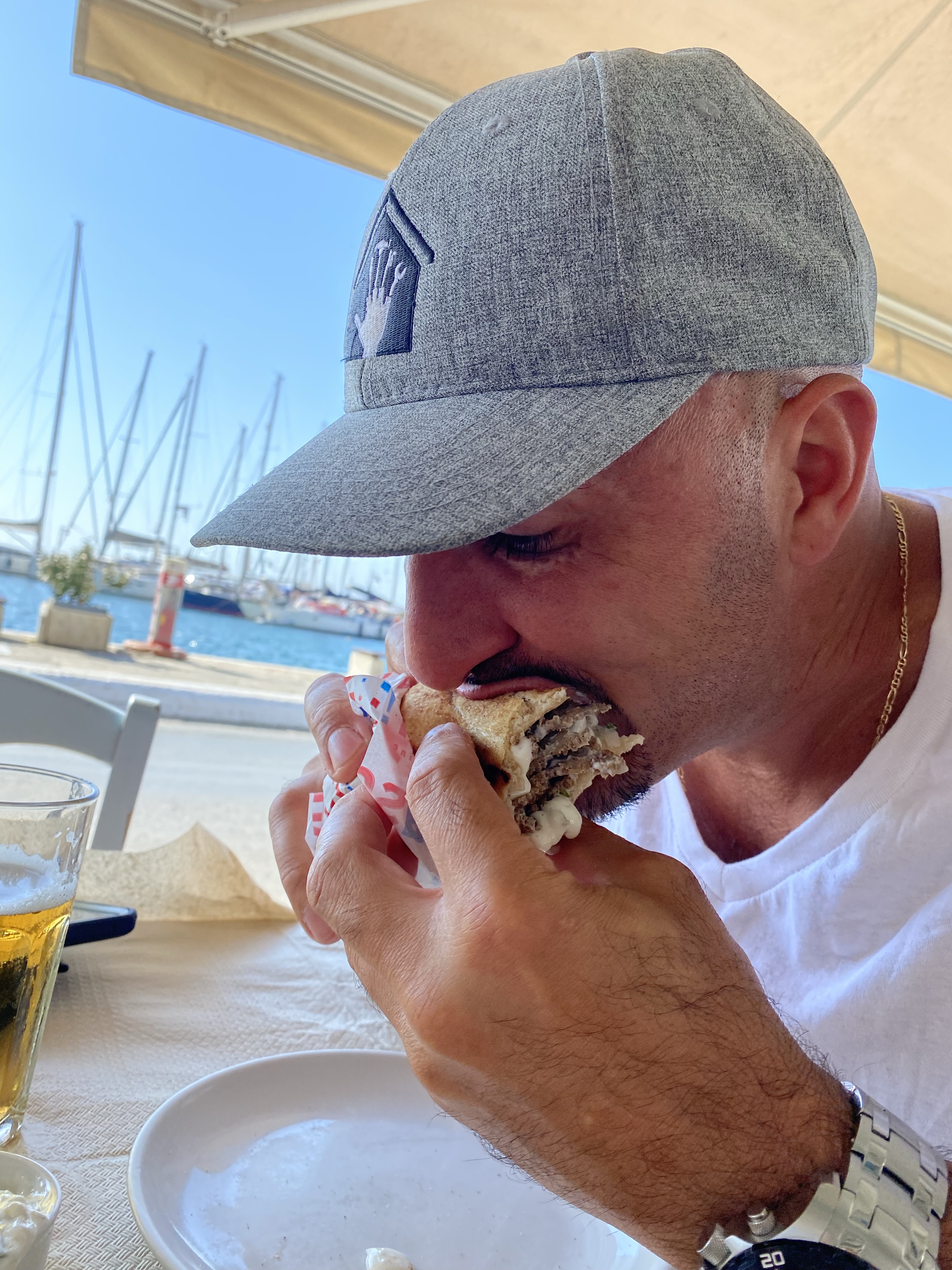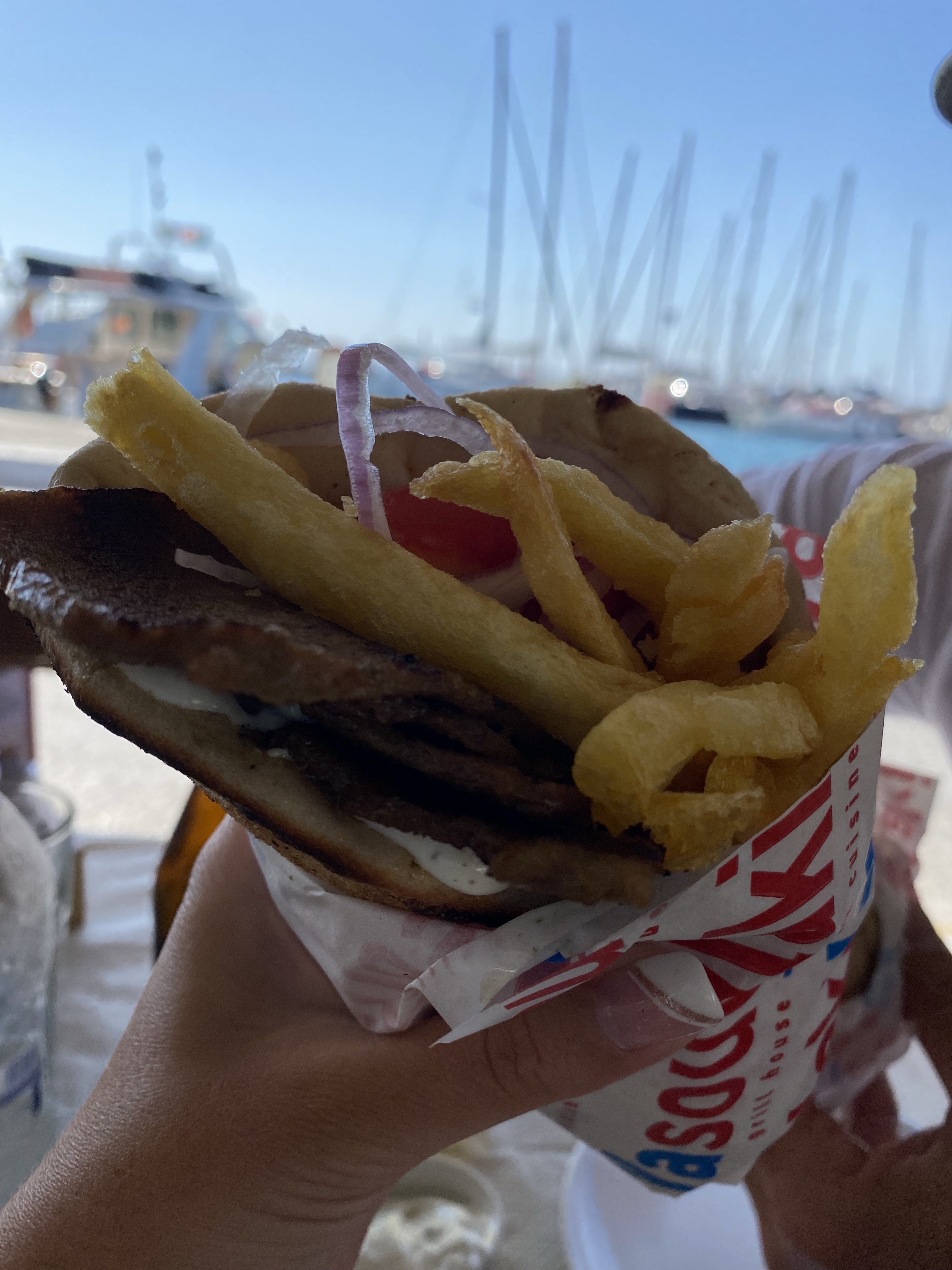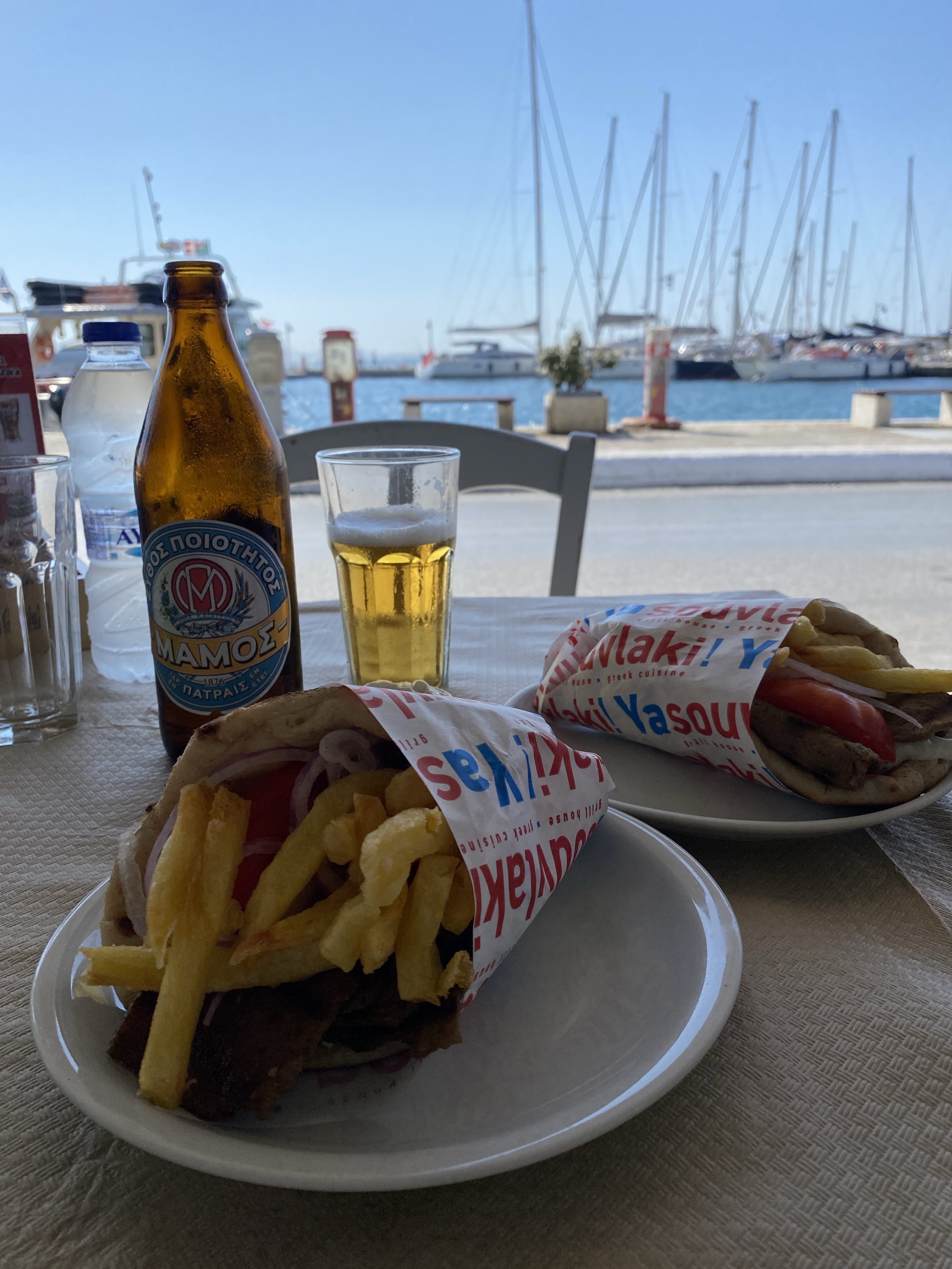 At this point Stelios and I were HUNGRY. All we had eaten since 6:30am was spanakopita & half a croissant after hiking 6 miles and getting in 16k steps. It was time for a Gyro. Both our Airbnb host & online travel blogs raved about Yasouvlaki being the best gyro in Naxos so that’s where we went. We sat at a table facing the water and ordered 2 Gyros Doner (a mix of beef & lamb, tomato, tzatziki, onion, & fries). It was PERFECT. The meat was much better than the gyro we had in Paros but overall both were VERY tasty. Overall I give Yasouvlaki 5 stars.