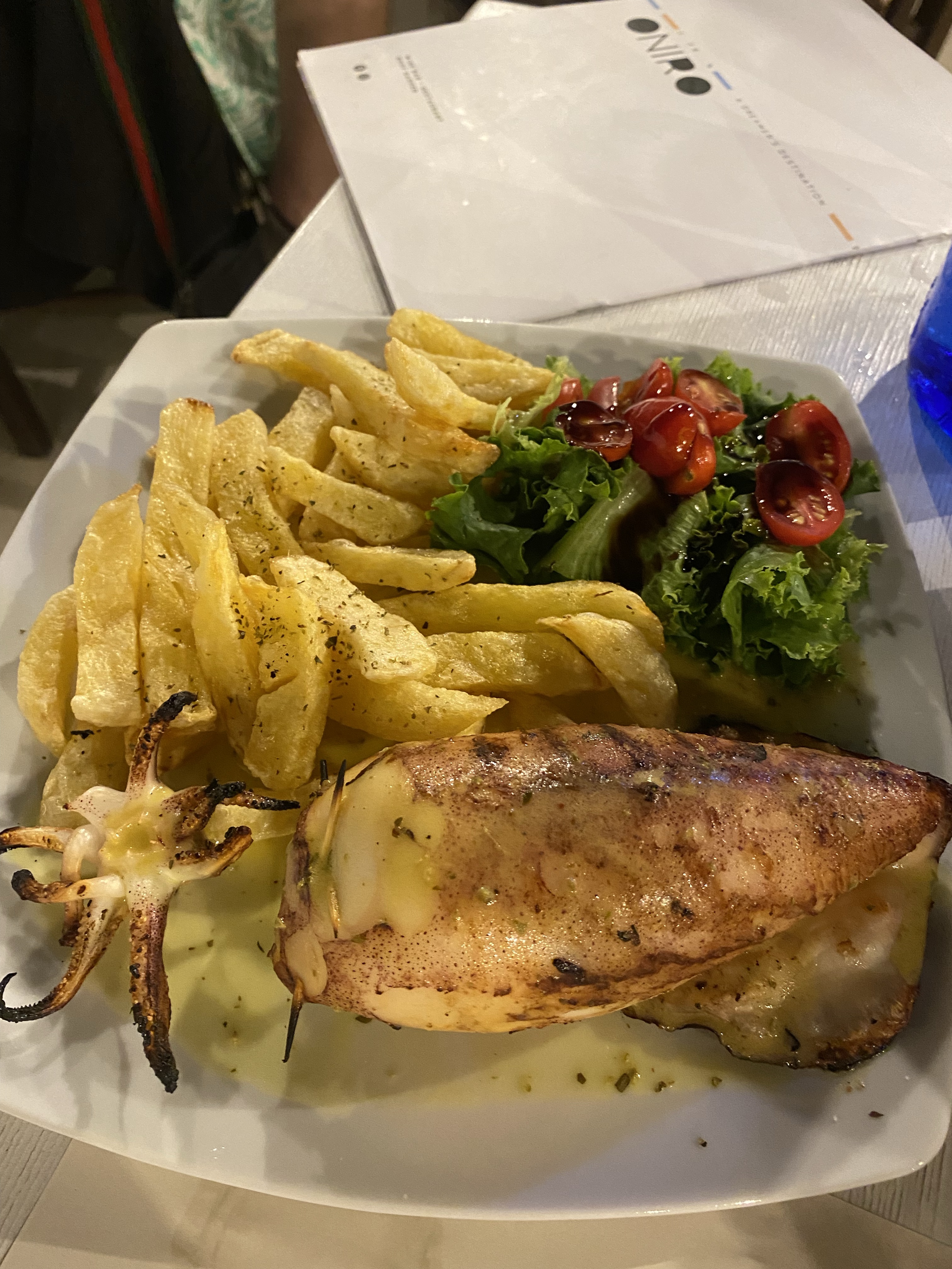 We didn’t have any dinner reservations tonight and decided to wing it. At around 9pm we walked to Oniro Wine Restaurant, and got a table on the roof. We ordered some glasses of wine, Naxian Gruyère cheese in Kaitifi (angel hair phyllo dough) and stuffed calamari with feta, tomato, and olives that came with a side of fries. The Naxian cheese was our favorite & dinner was only 31 euro.