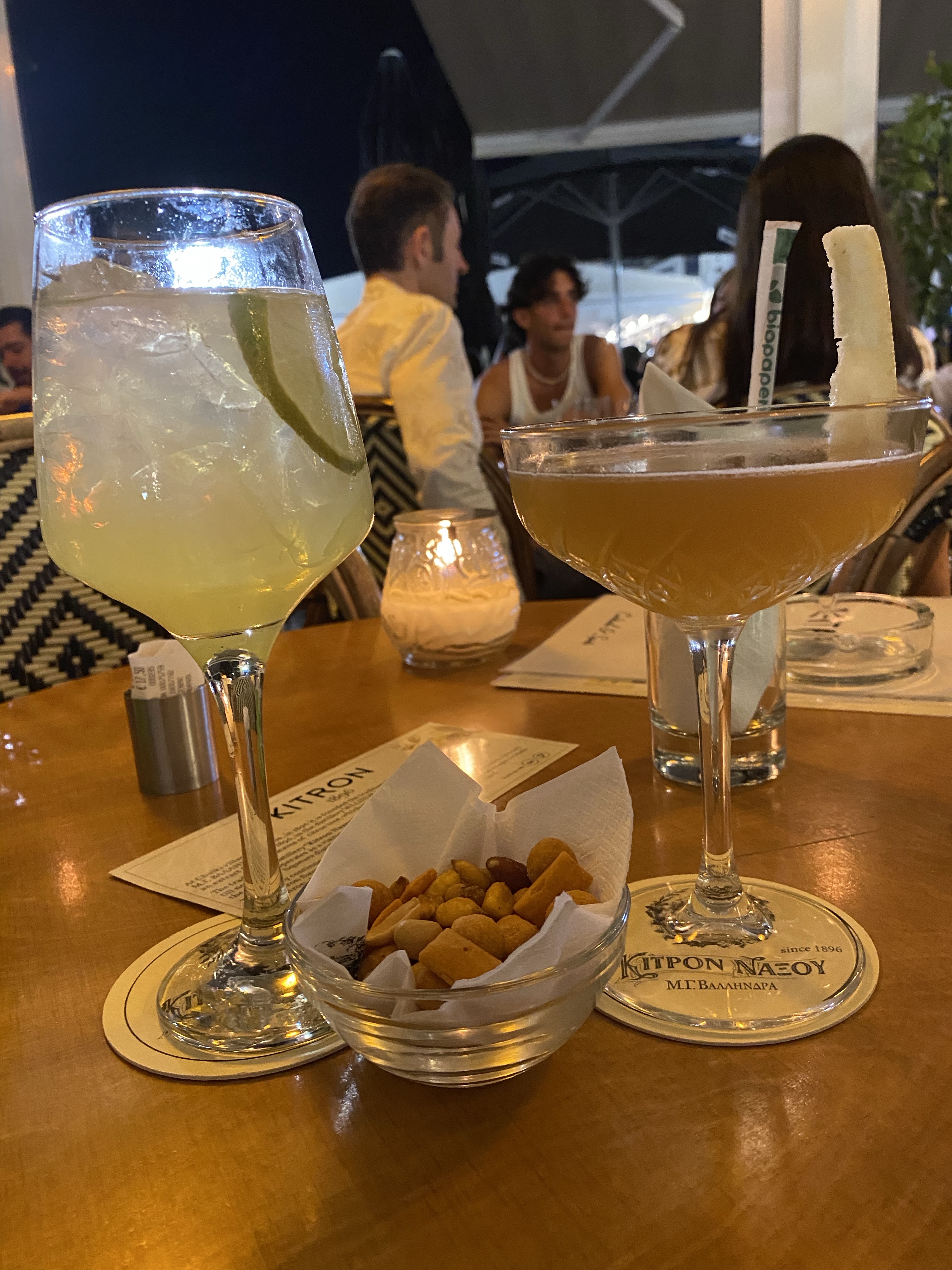 We strolled through the back alleys and ended up at the waterfront. We sat down on a comfy couch for 2 at Kitron Café. Kitron is a local liquer and has been produced in Naxos since 1896 from the extract of citrus tree leaves. The distillery today is in the village of Chalki, which we drove through earlier this morning. The Distillery, Kitron Naxos Vallindra offers tours which we didn’t have time to do, but luckily they have a cafe at the Naxos Chora seafront. The lady working the café let us try 3 samples of Kitron – the closest thing I can compare it to is Limoncello. I ordered the Aqua di Naxos (Kitron with mastiha & limoncello) and Stelios got the Kitron Summer cocktail (similar to a Martini). We sipped our cocktails, people watched, and then wrapped up our evening around midnight. Our last full day in Naxos was definitely an adventure to remember.