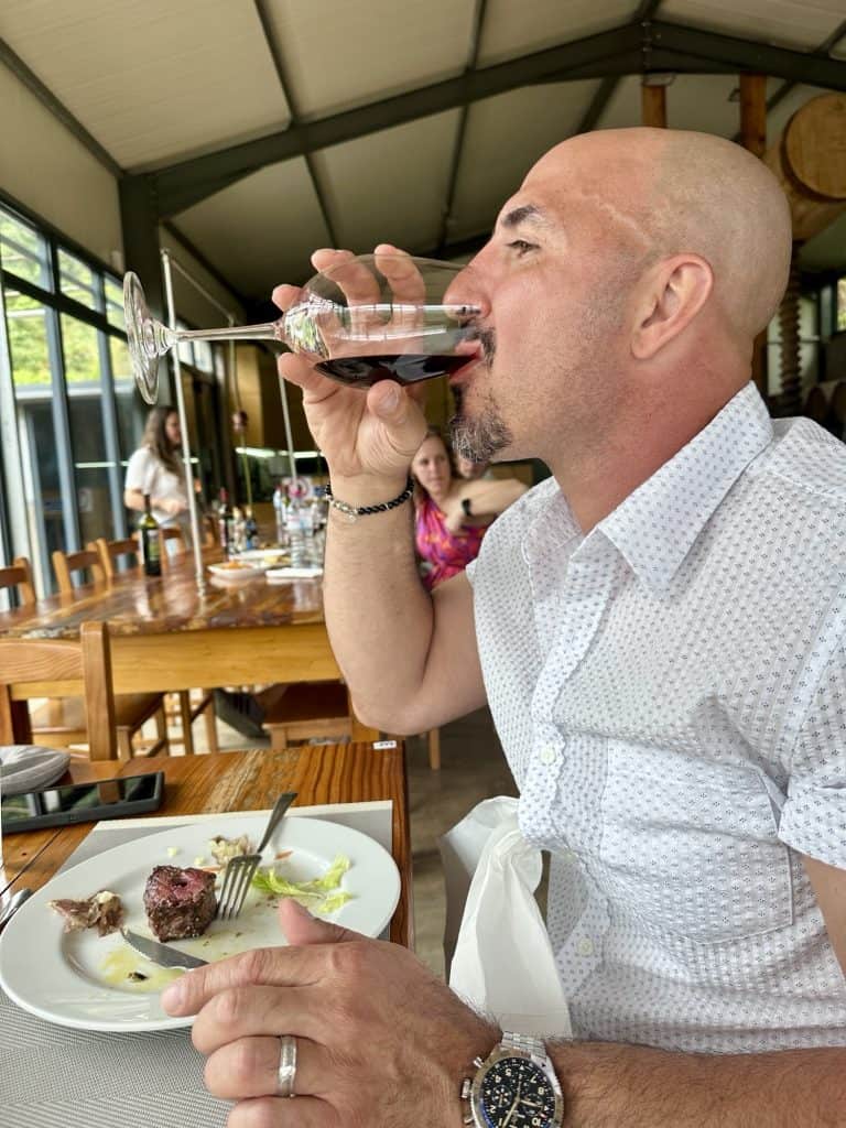 There were 12 people in our group and we did a walking tour of the vineyard first where our guide explained the two different methods they use to structure the vines. After the tour of the vineyard we were sat inside – 2 couples per table with two chairs in between at seperate tables. I’m not sure if it’s a practice they kept from Covid but I found it odd rather than seating the groups at 2 large tables together so people can socialize while enjoying the wine. We tasted 3 whites, 1 rose, and 2 reds along with a charcuterie board and lunch. Our favorite was the 3rd medium bodied white wine and the lighter red wine.