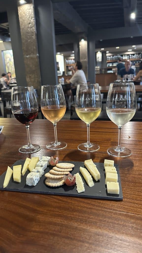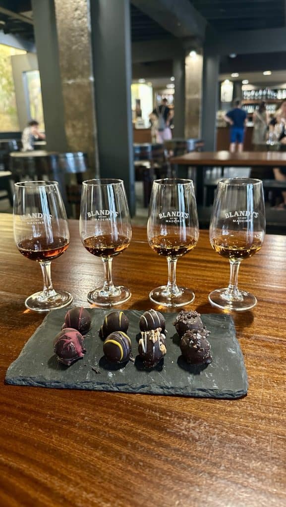 We decided to continue our wine series and walk down to Blandy’s to try some of the local Madeira wine which is similar to port. First we did a tasting of the 4 different grapes that were 10 years old in age. Then Verdalha and Buel were our favorites. Next we ordered the 15 year old Verdalha and Buel. I like the Buel best but we were also trying these alongside chocolate which both complemented and muted the sweetness of the wine. We decided to try the dry flight next and ordered the cheese board to go along with it. The Atlantis Rosé was our favorite.